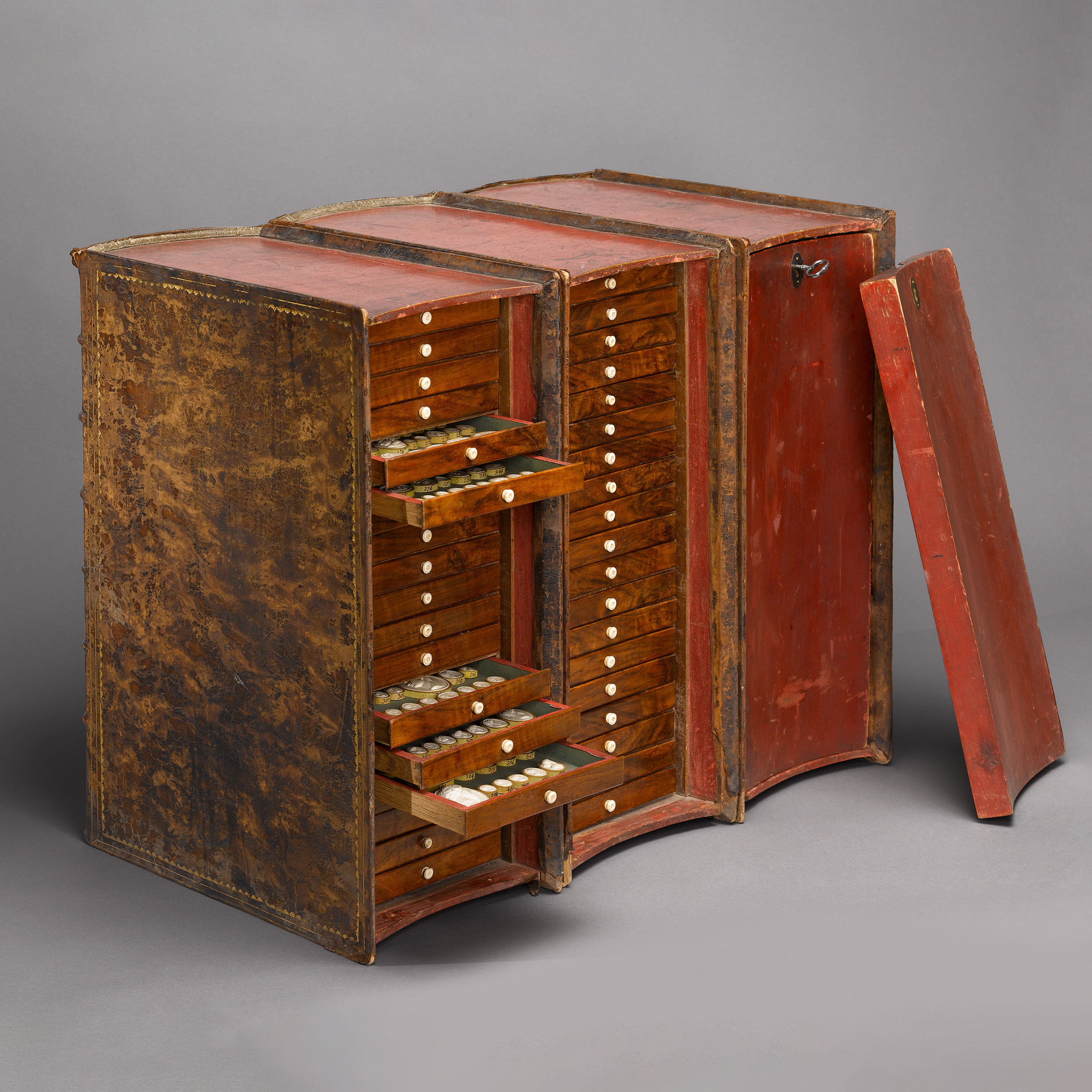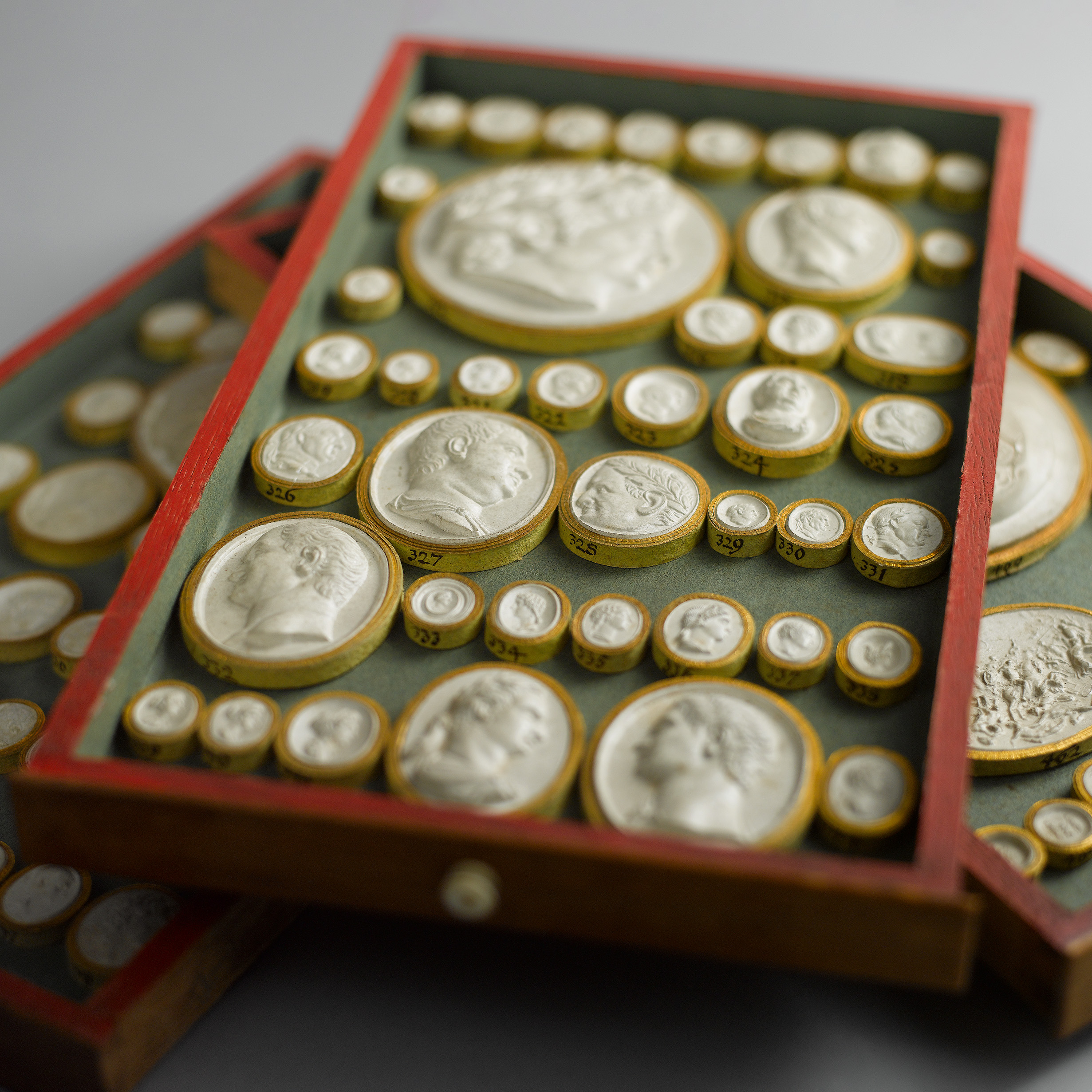 Drei große, in Leder gebundene Holzkästen in Buchform. Die Kästen können rückseitig mit einem leuchtend rot gefärbten Holzbrett verschlossen werden. Jeder Kasten enthält 19 Holzschubladen, deren oberer Rand jeweils rot gefärbt und deren Boden mit grünem Buntpapier ausgekleidet ist. Die in die Schublade eingeklebten Abdrücke bestehen aus der weißlichen Gußmasse, die Lippert nach eigenem Geheimrezept aus Talkerde und Hausenblase herstellte, und sind in gelbe Papierrähmchen mit geriefeltem Goldrand eingefasst, auf die jeweils mit schwarzer Tinte die Katalognummer geschrieben ist.