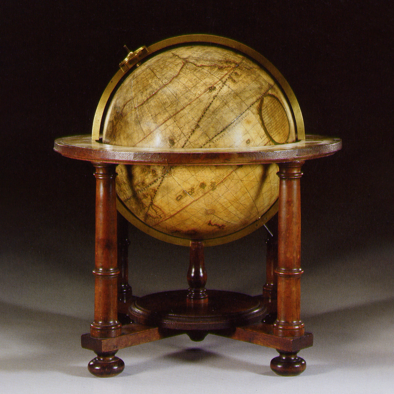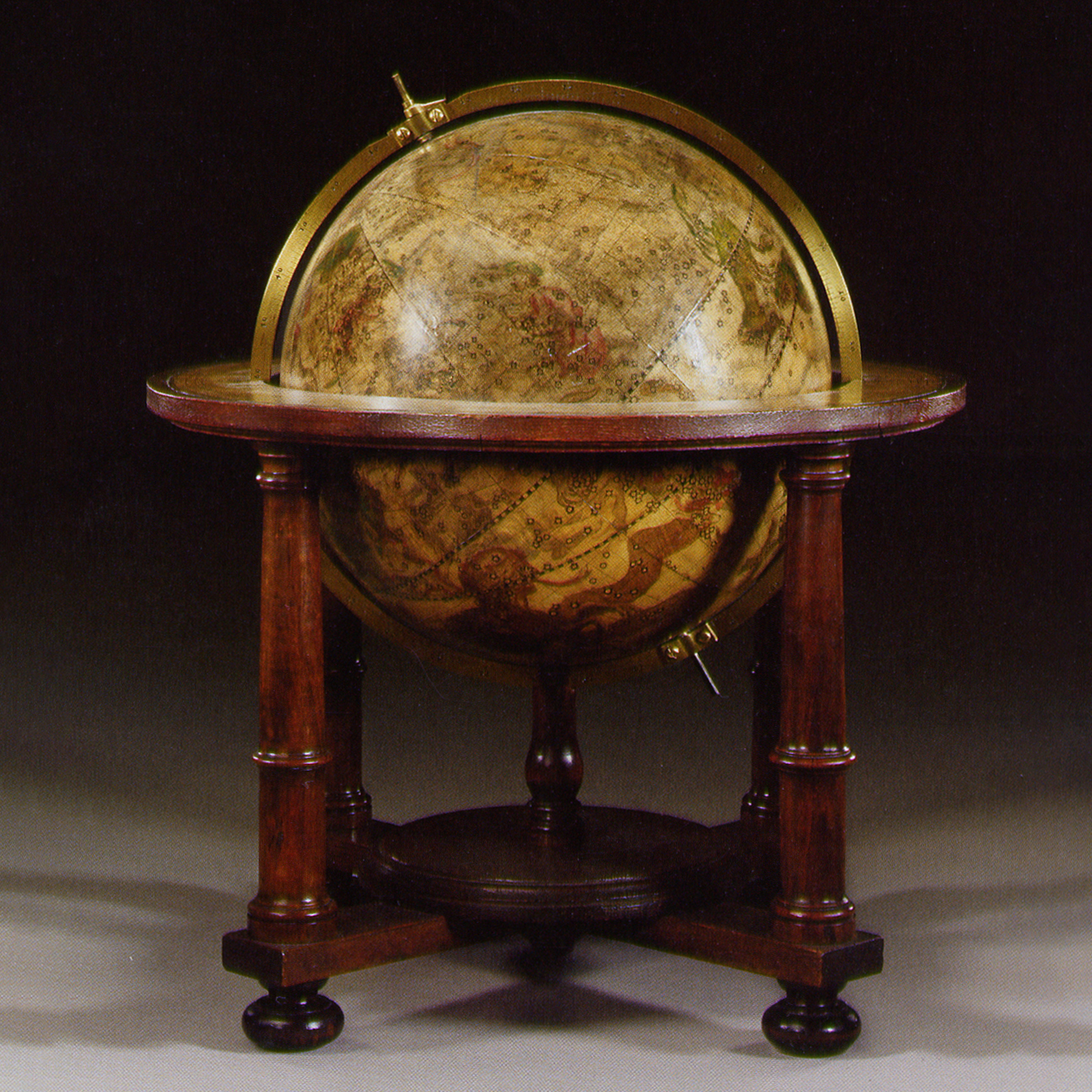 Originales Holzgestell aus Eiche und Nussbaum, mit vier gedrechselten und profilierten Säulen mit Balusterfüßen und einer gedrehten und profilierten Grundplatte. Die runden Horizontringe sind mit kolorierten Kupferstichen beklebt.