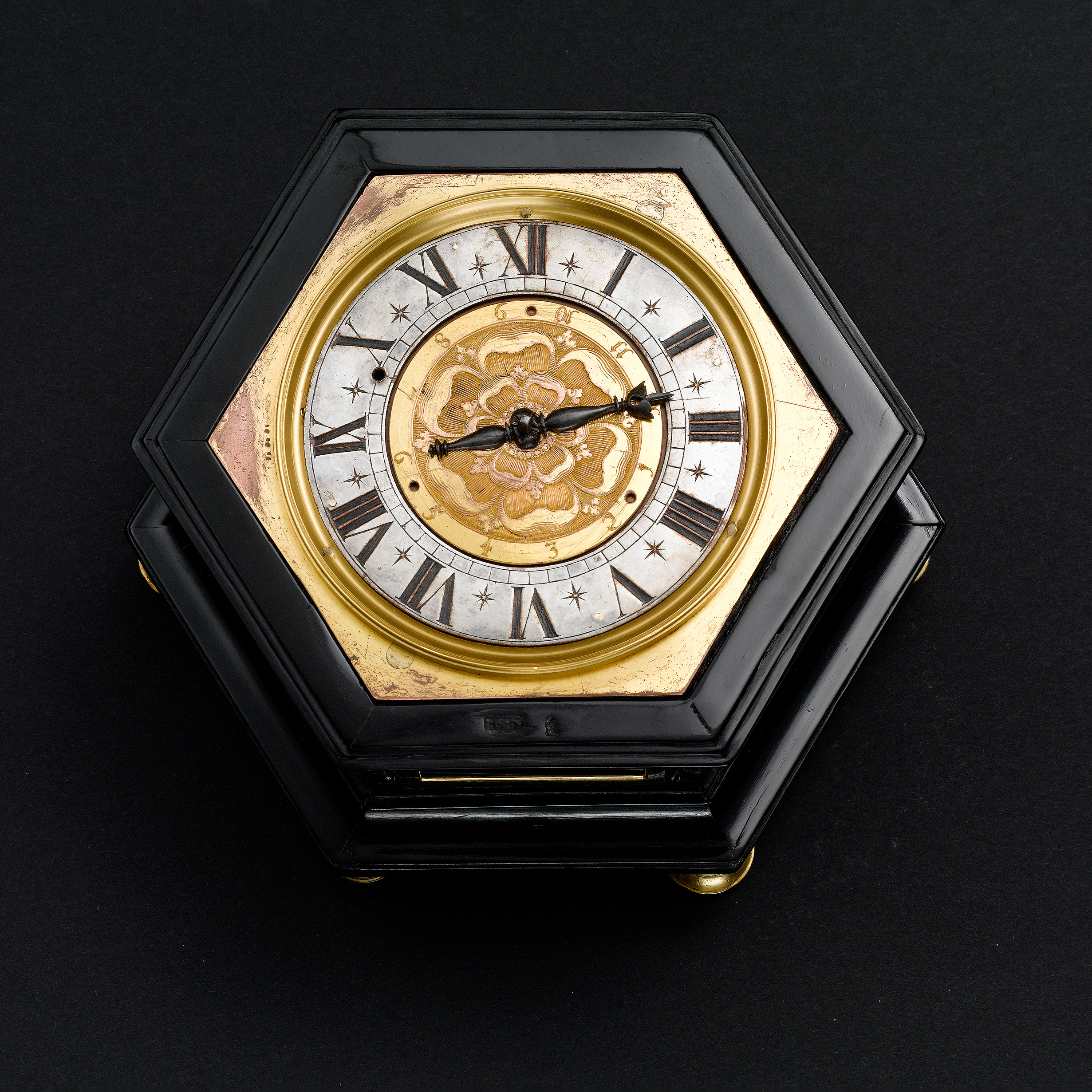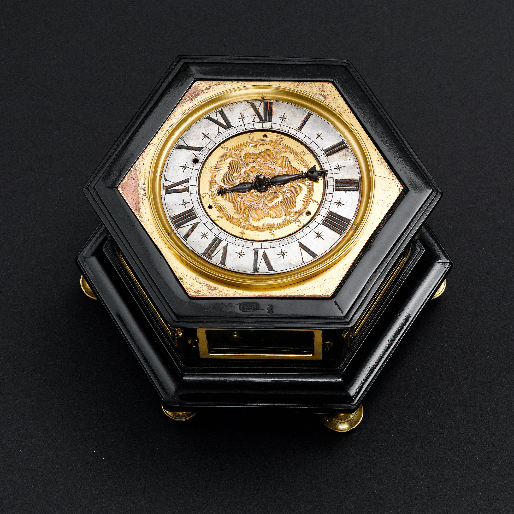 Auf der Oberseite befindet sich die eingelassene vergoldete Blindplatine mit aufgelegtem versilbertem Ziffernring aus Kupfer mit gravierten, schwarz ausgelegten römischen Stundenzahlen, I-XII. Den Ziffernring umgibt eine Lünette aus vergoldetem Messing; Im Zentrum eine floral gravierte, vergoldete Weckerscheibe mit arabischen Stundenzahlen, 1-12, und der balusterartig konturierte Stundenzeiger aus gebläutem Stahl, mit tulpenförmiger Spitze.