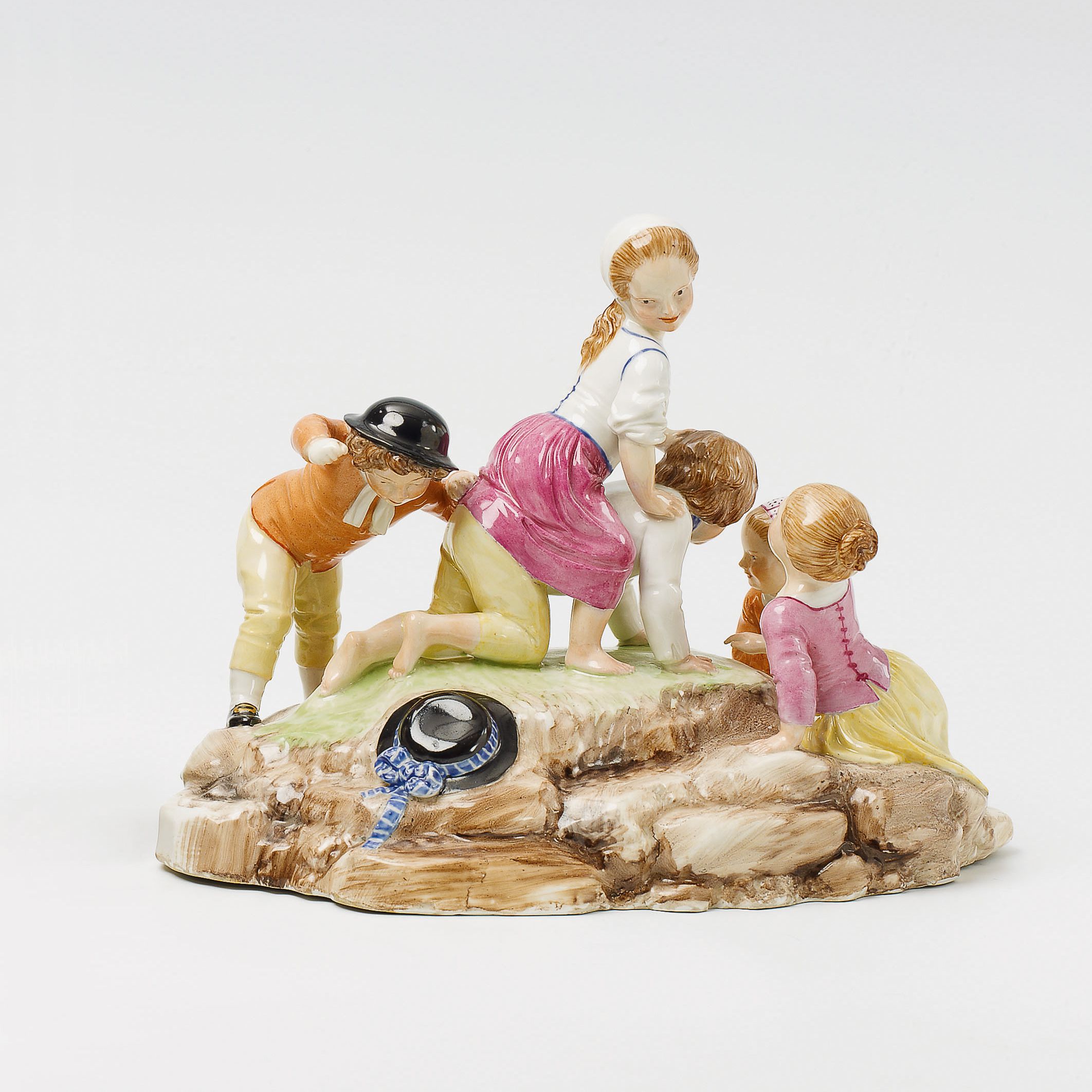 Fünffigurige, farbig staffierte Kindergruppe auf gestuftem Terrainsockel. Ein Mädchen, auf einem Knaben reitend, umgeben von drei weiteren Kindern unterschiedlichen Alters. Manufakturmarke ligiertes CT unter Kurhut und 87 in Unterglasurblau im hohlen Sockel.