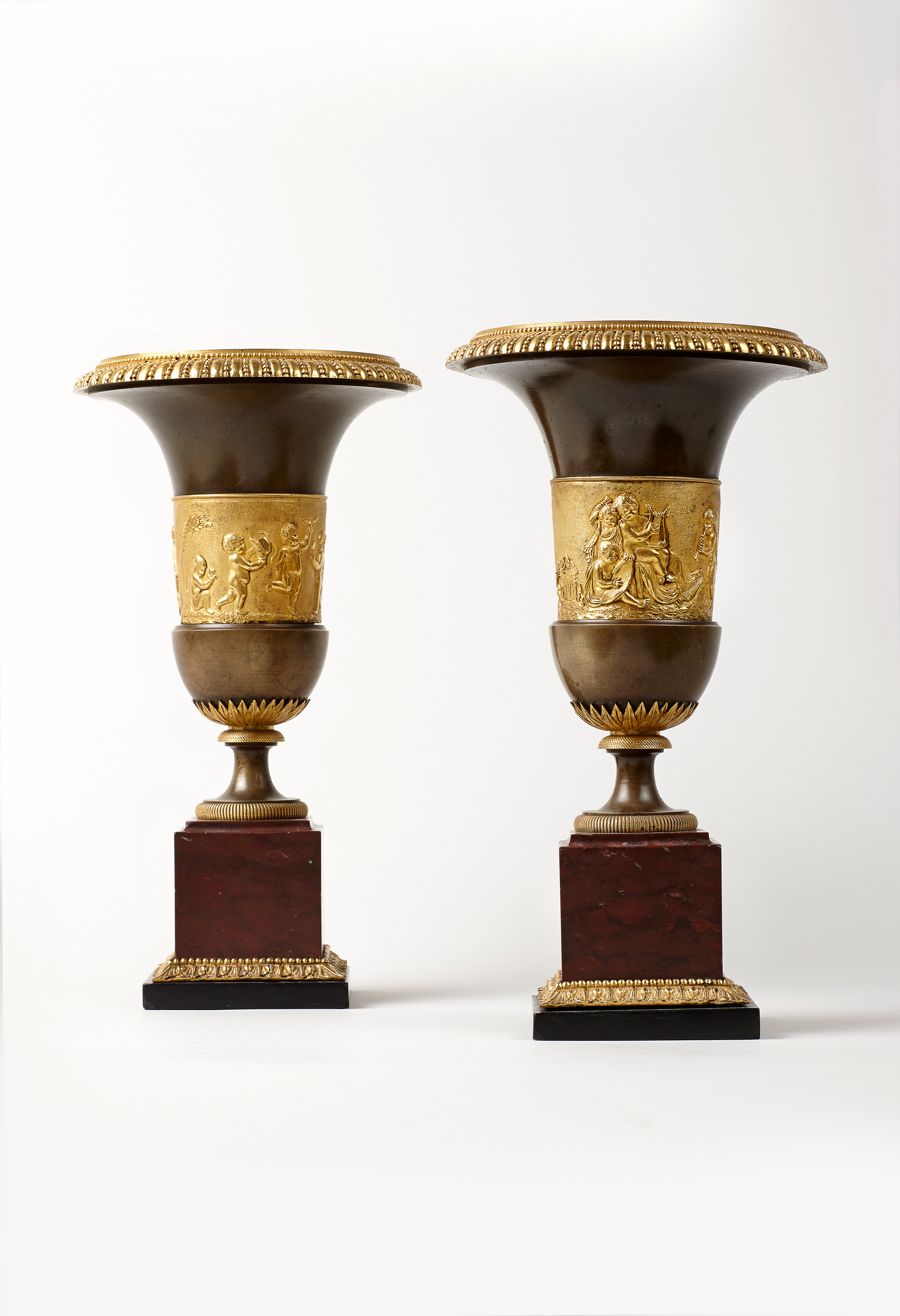 Ziervasenpaar in antiker Form, mit rundem langgezogenem Körper in patinierter Bronze, im Zentrum vergoldetes Bronzeband mit Reliefszenerie von tanzenden Mänaden, hohes kubisches Postament aus bordeauxrotem Marmor, auf flacher Plinthe in Form einer umlaufenden, vergoldeten Sockelrahmung. Vase mit eingezogenem Fuß und nach oben sich weitender Öffnung, oberer Abschlussrand mit Perlstabdekor ebenfalls feuervergoldet.