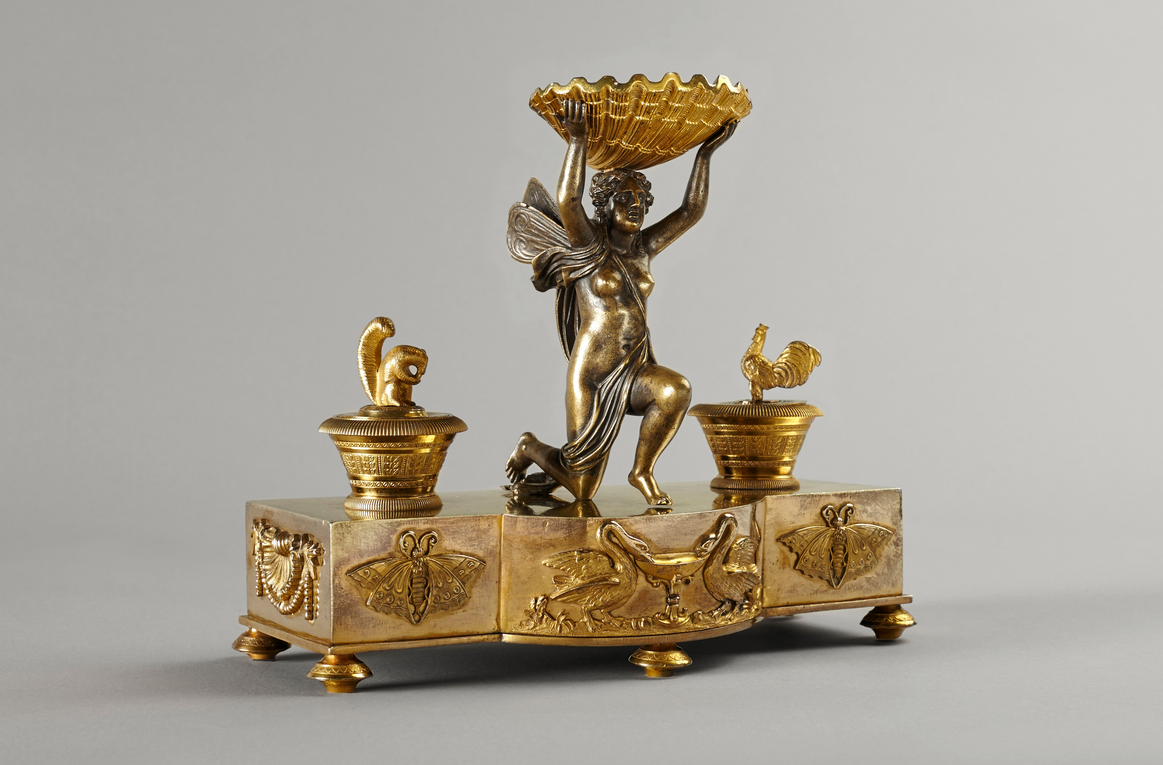 Rechteckiger Sockel mit segmentbogenförmig vorspringender Front. Die glatte Wandung mit applizierten Schwänen und Schmetterlingen. Sandstreuer mit Verschluß in Form eines Hahns, Tintenfaß mit Eichhörnchen. Im Zentrum kniet eine geflügelte junge Frau im antikisierenden Gewand und hält eine Muschel empor.