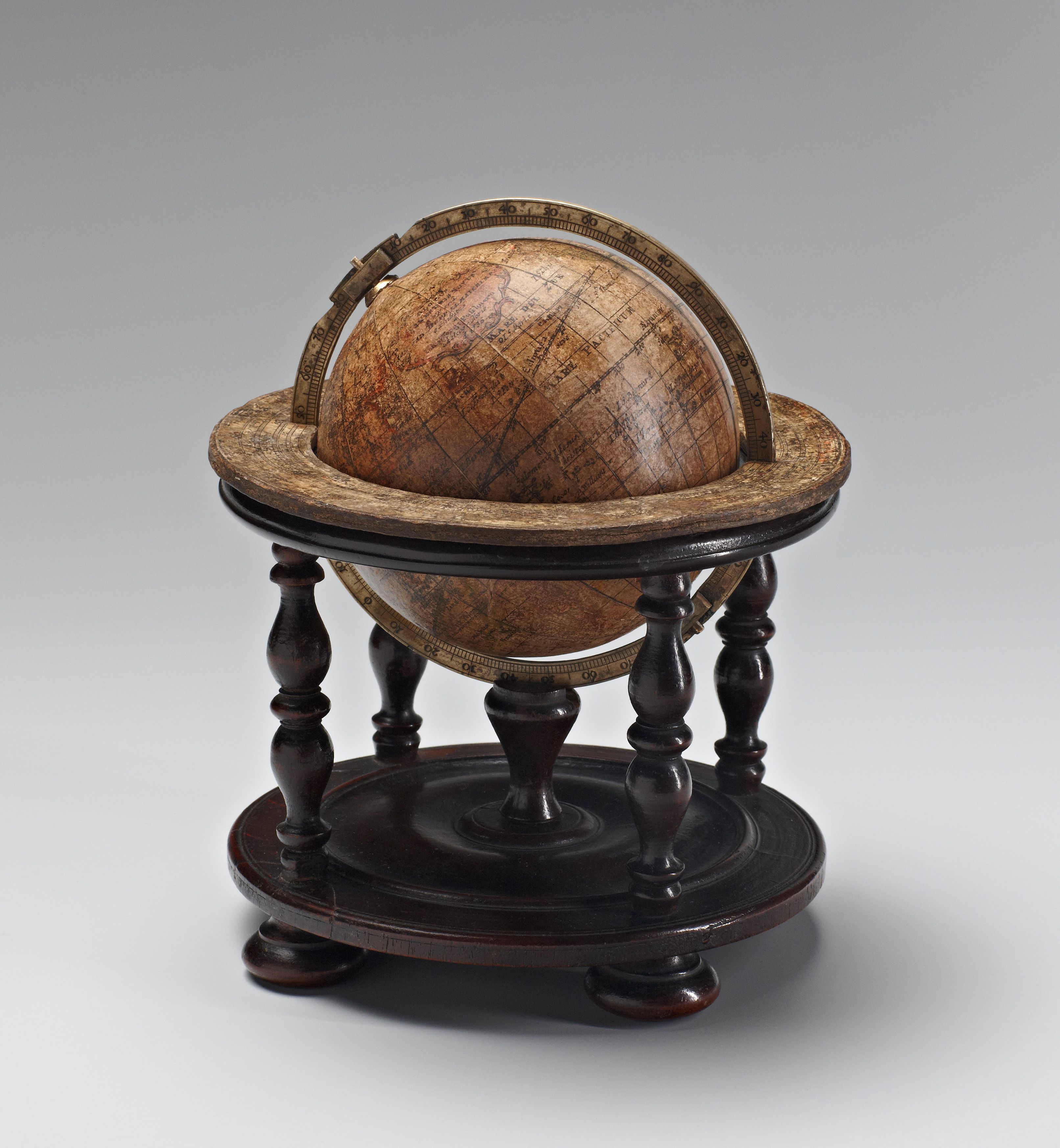 Gestell: Holz, gedreht und profiliert; aufliegender Horizontring aus Pappmaché. Meridianring: Messing, Zahlen gepunzt, Gradteilungen graviert. Stundenring fehlt. Barockkartusche mit Signatur: „GLOBUS TERRESTRIS NOVUS operâ IOH. GAB. DOPPELMAIRI M.P.P. exhibitus â Ioh. Georg Puschnero Chalcogr. Norib. A. 1736.“