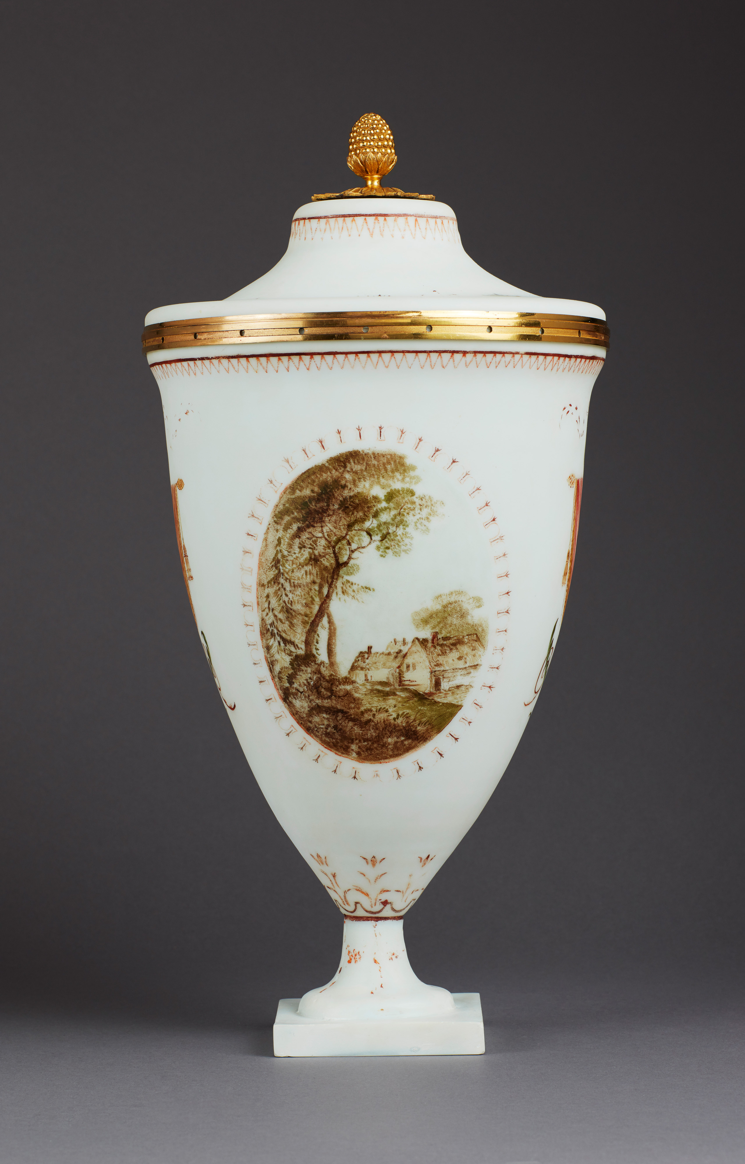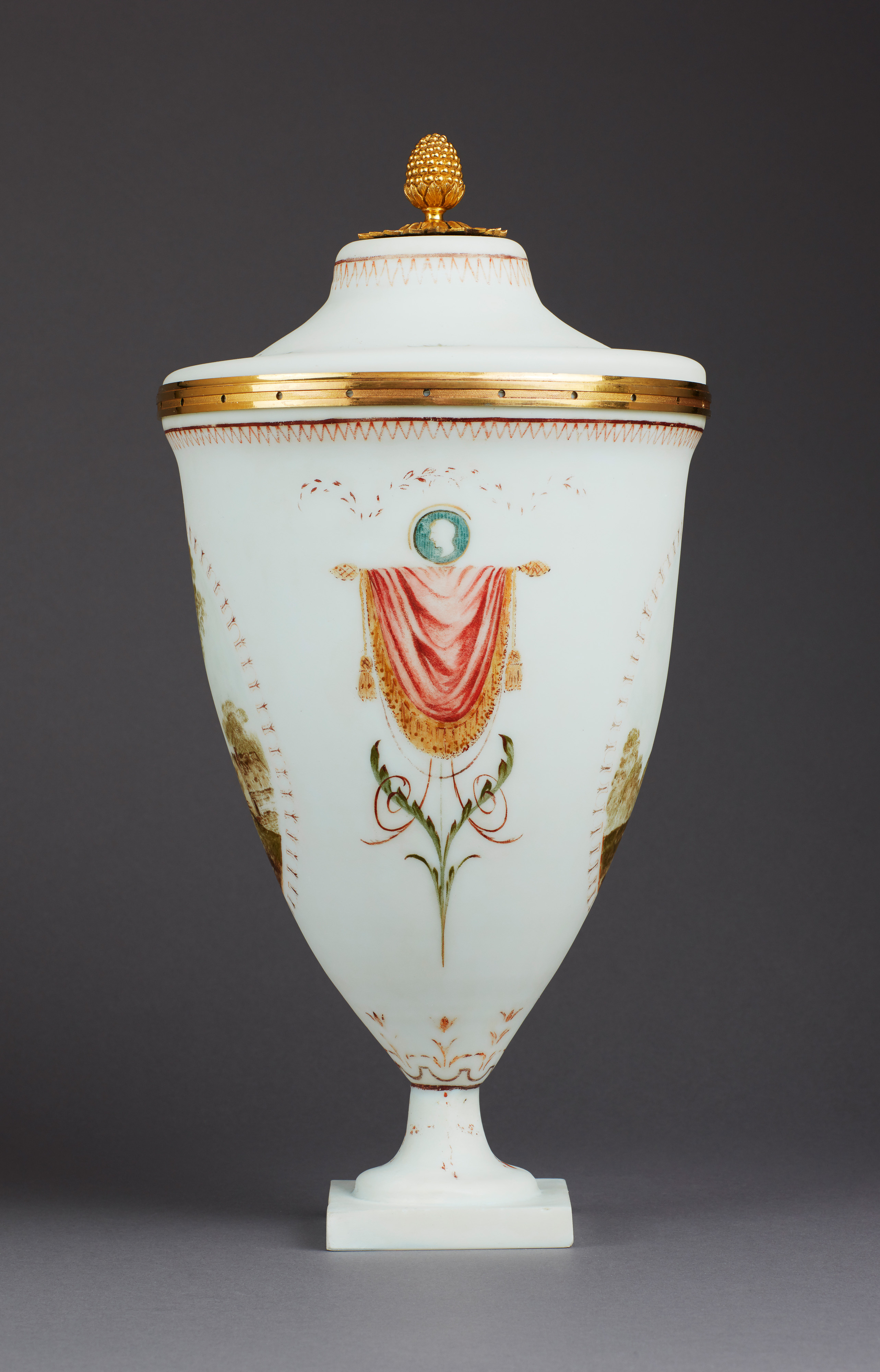 Das milchige Flussglas verdankt seinen Namen wohl der Beimischung von Flussspat (Kalziumfluorid), das dem Glas ein trüb-fluoreszierendes Aussehen gab. Innen glatt, wurde das Glas an der Außenseite aufwändig matt geschliffen, so dass sich das Licht darin subtil brach und im Kontrast zu den kunstvollen Goldbronzen eine besondere Eleganz erlangte. Nur sehr wenige Arbeiten mit einer zusätzlichen Malerei haben sich erhalten – sodass diese Deckelvase von besonderer Seltenheit ist.