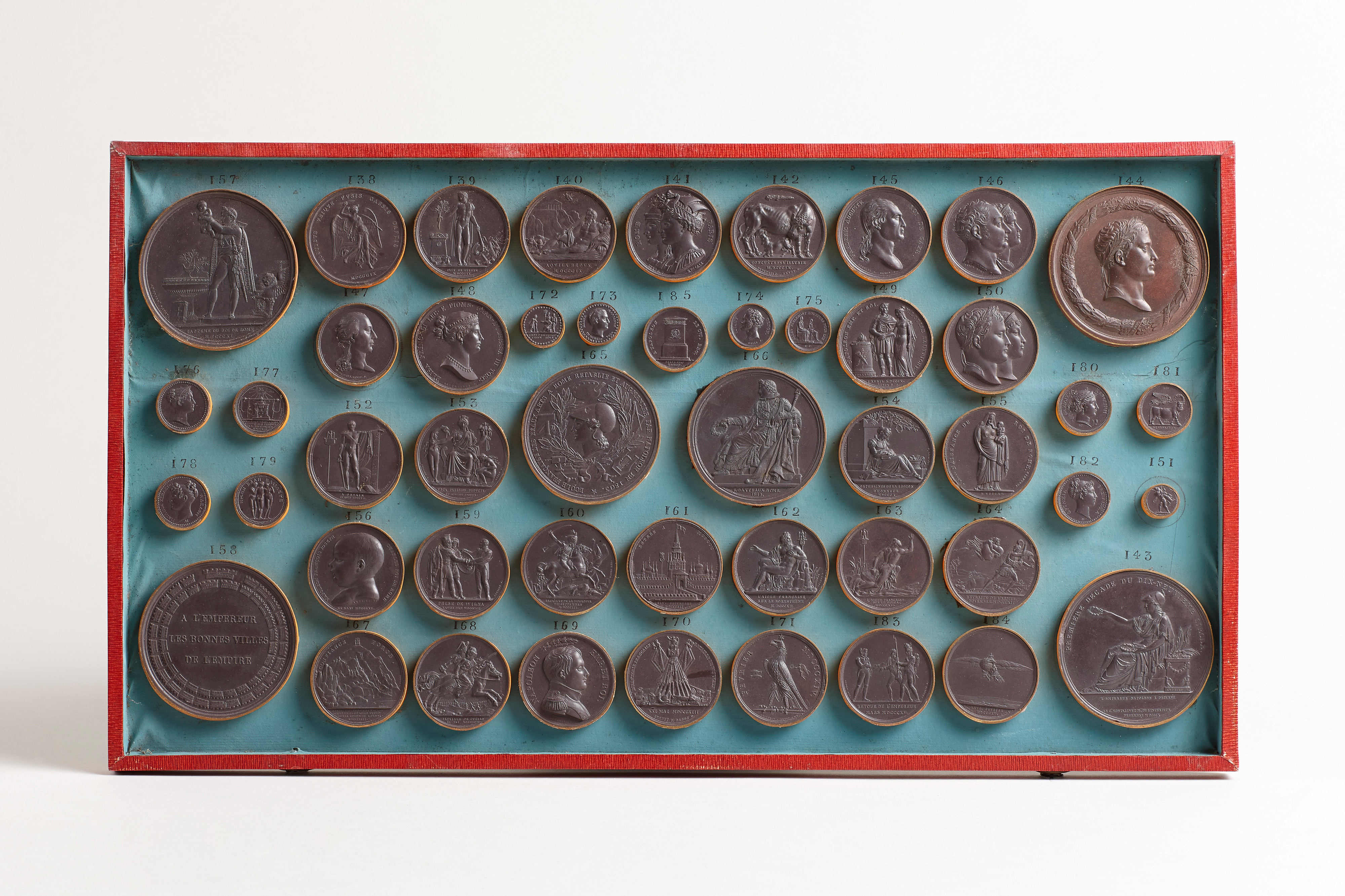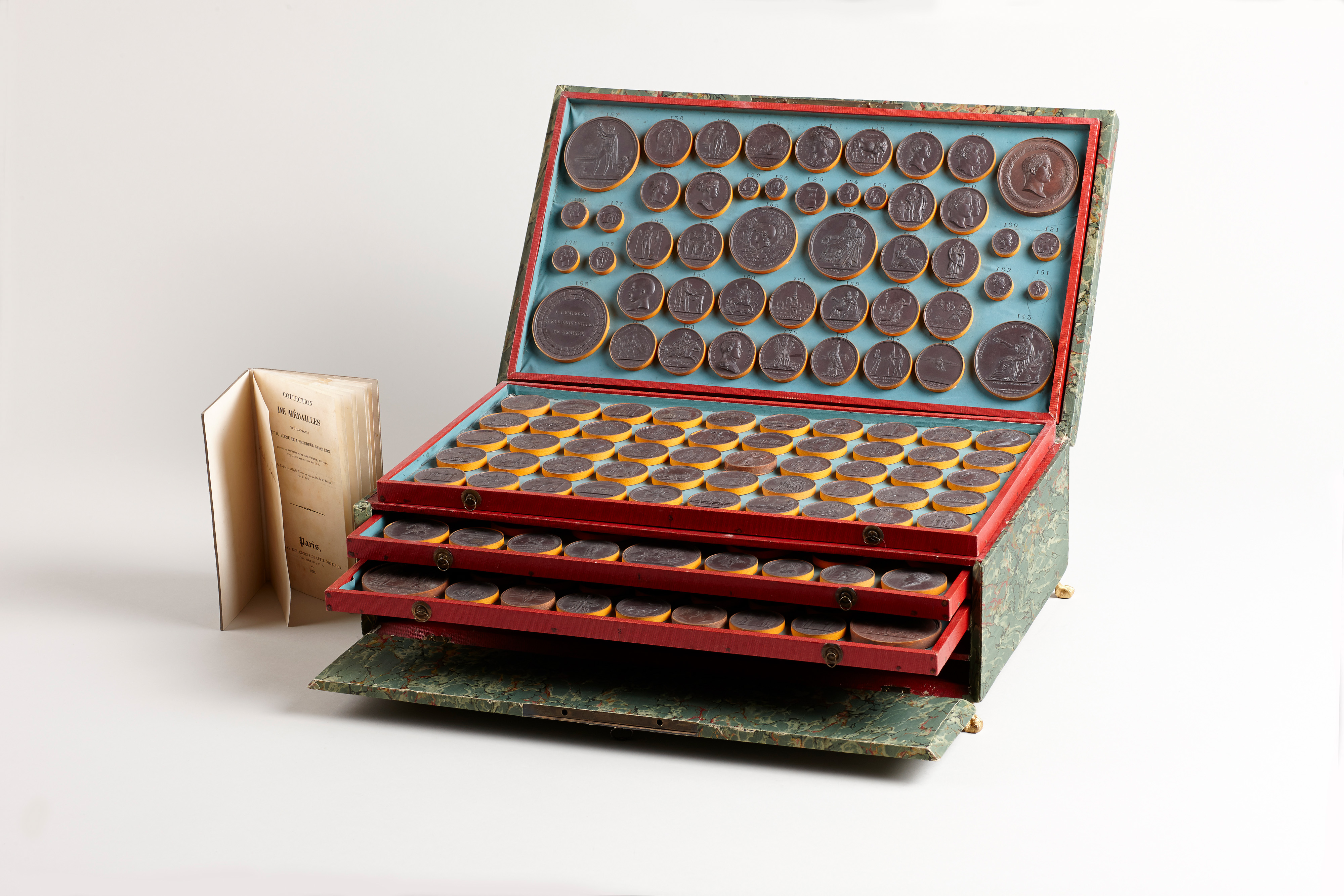Äußerst seltene, komplett erhaltene Medaillensammlung im originalen, mit Ochsengallen-papier bezogenen Kasten mit Frontlade, originalem Schloss mit Schlüssel sowie mit Klappdeckel. Im Inneren vier in der Front nummerierte Schübe mit insgesamt 184 jeweils nummerierten, feinen Abgüssen von Medaillen bezüglich der historischen Etappen und Ereignisse der Regierungszeit Napoleons. Sämtliche Medaillen sind bronziert, in den Schüben fest montiert und von vergoldeten Einfassungen umgeben.