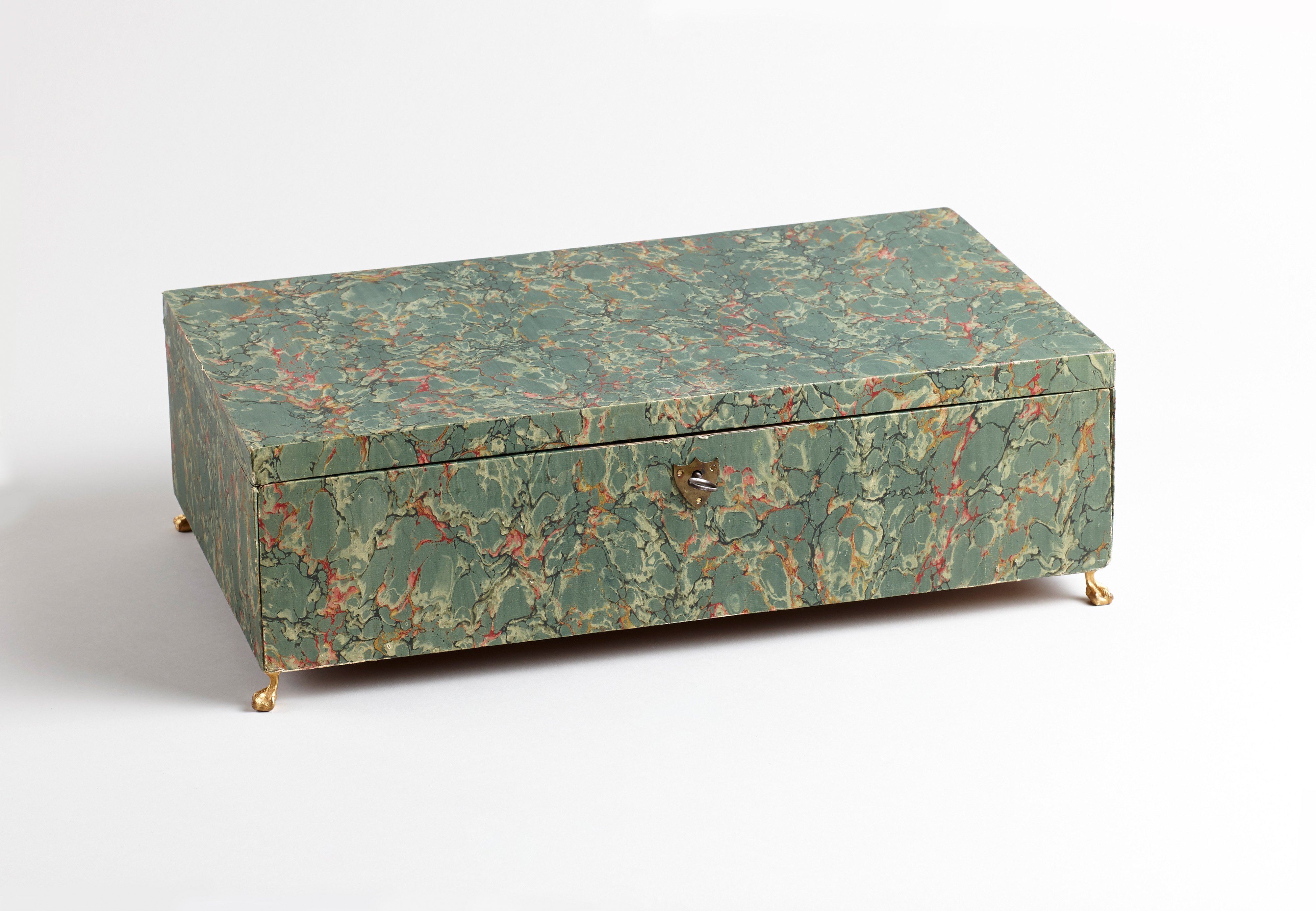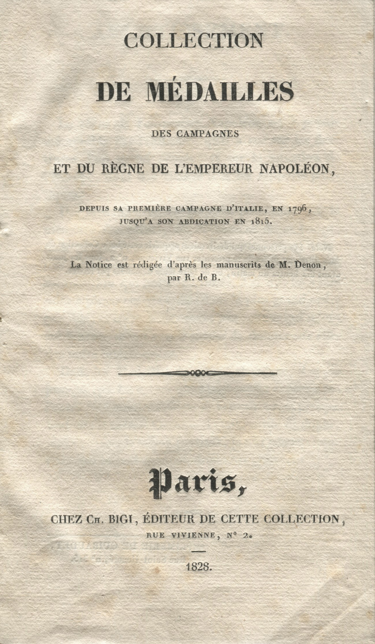 Der gut erhaltenen Schatulle ist das originale, gebundene Beschreibungsbüchlein beigegeben „COLLECTION DE MEDAILLES/ DES CAMPAGNES/ ET DU REGNE DE L’EMPEREUR NAPOLEON…“. Der Druck ist verfasst nach Manuskripten von M. Denon, Paris, 1828 mit Vorwort und detaillierter, katalogisierter Nennung sämtlicher Medaillengüsse. Der Kasten auf vier vergoldeten Bronzelöwentatzen.