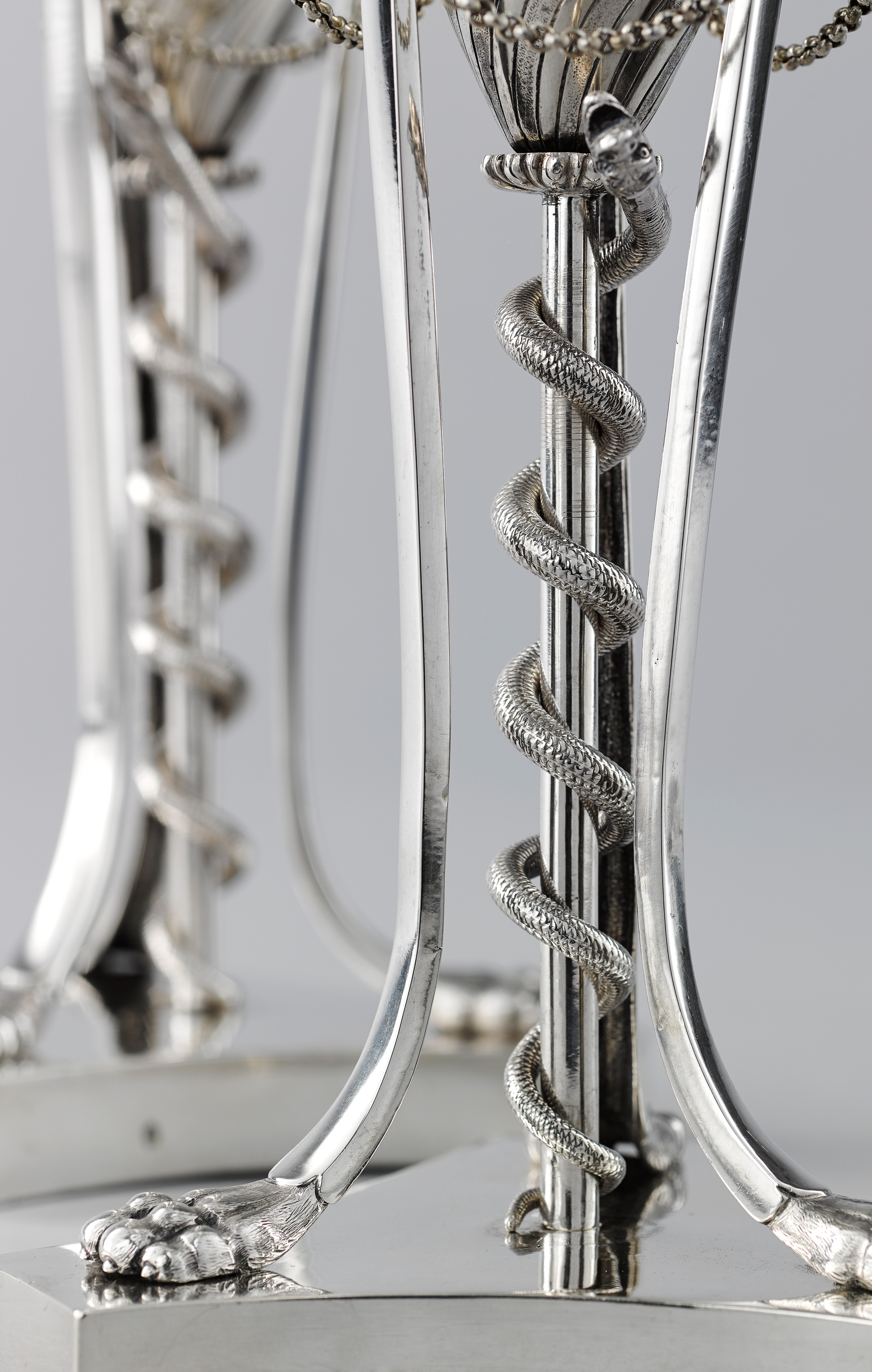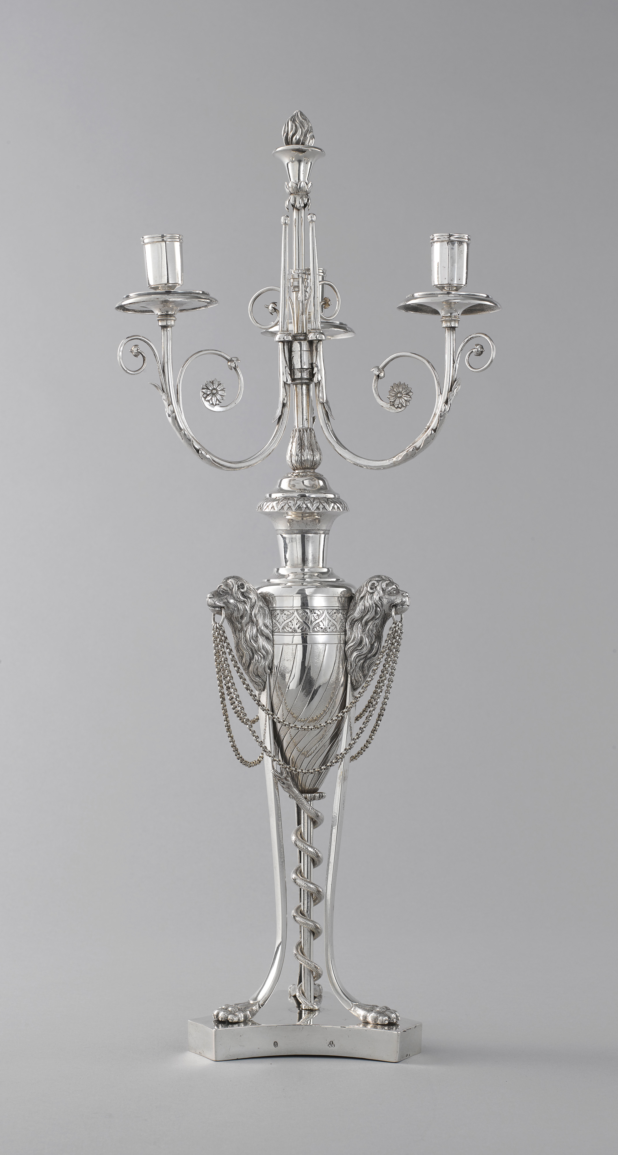 Der Leuchter ist als antiker Dreifuß (Athénienne) entworfen; ein Vasenkörper wird von drei schlanken Beinen getragen, die in Tatzenfüßen enden und auf einer triangelförmigen Plinthe stehen; an einem zentralen Stab windet sich eine fein ziselierte Schlange empor. Den oberen Abschluss der Beine bilden drei vollplastische Löwenköpfe, die in ihrem Maul jeweils einen Ring mit zwei Ketten halten. Aus der Vasenöffnung mit Akkanthusblattdekor steigen drei elegante Leuchterarme empor, den Abschluss zwischen den Leuchterarmen bildet eine Fackel.