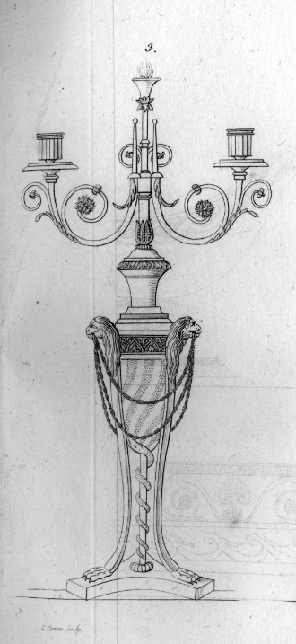 Der Entwurf dieses Leuchters wird in der Februar Ausgabe des Jahres 1808 im Journal des Luxus und der Moden unter dem Titel ‚Silber-Service von neuester Form’ vorgestellt und auf einer Kupfertafel zusammen mit einer Saucière und einem Plat de menage abgebildet. In der Einleitung heißt es: „Der geschickte Hof-Juwelier Herr Seethaler in Augsburg war so gütig, uns mit geschmackvollen Zeichnungen eines neuen Silber-Service für unser Journal des Luxus und der Moden zu beschenken, die wir unsern Lesern auf Tafel 5,6 und 7 in sauberen Contouren mittheilen.“