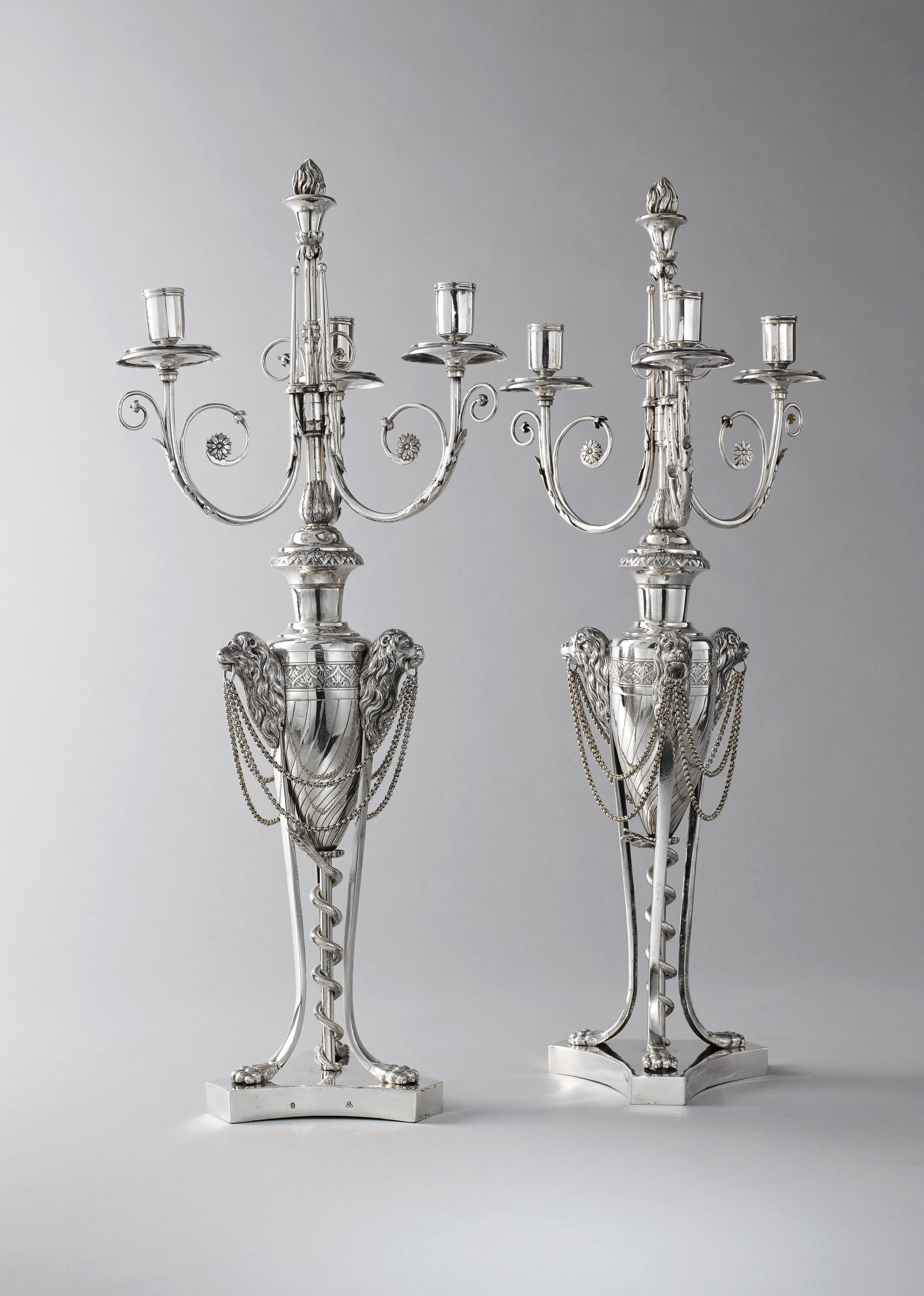 Der Typus dieser fein gearbeiteten Girandolleuchter ist vom französischen style Empire beeinflusst und erinnert sowohl an die Stichwerke von Charles Percier & Fontaine als auch an Arbeiten von führenden französischen Goldschmieden der Zeit, wie zum Beispiel Jean Baptiste Claude Odiot und Martin Guilllaume Biennais.