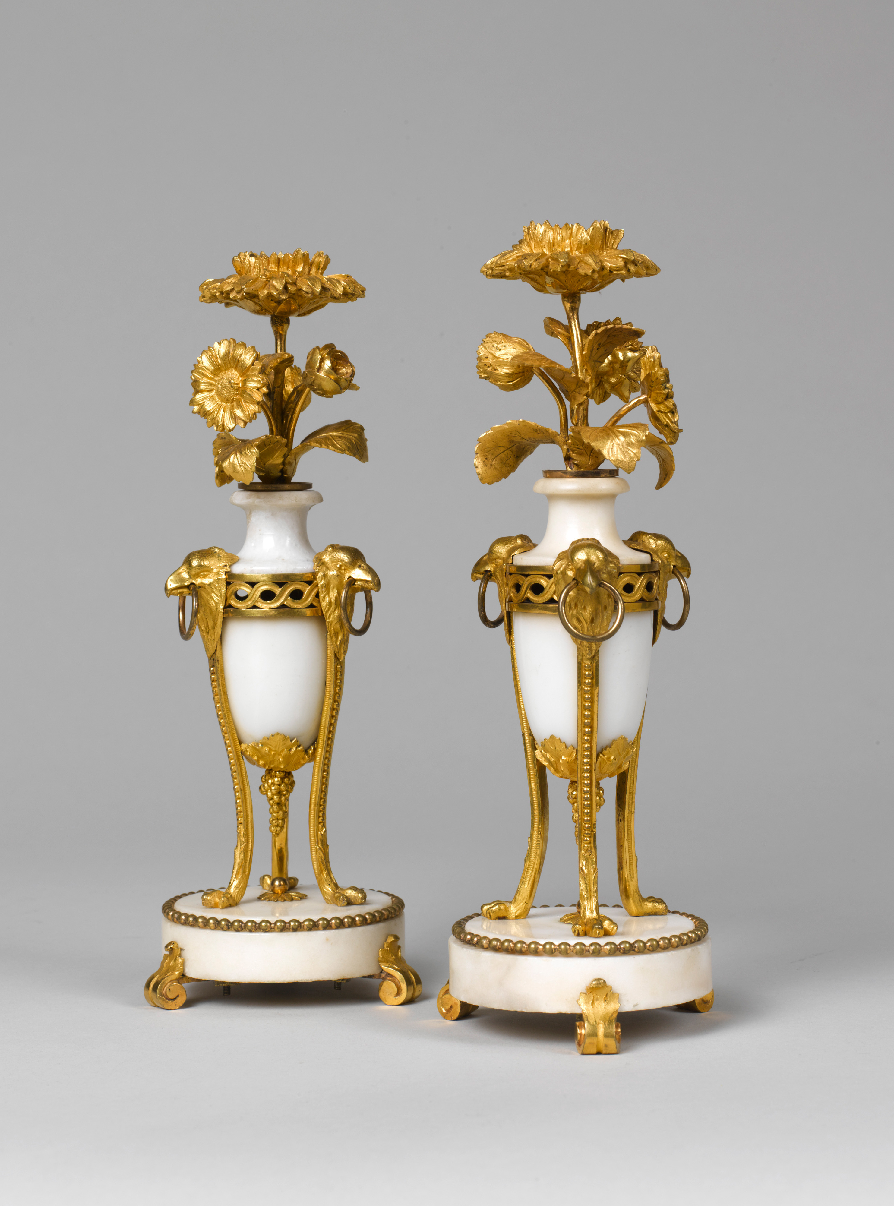 Das Motiv des Dreibeins kann mit antiken Opferschalen in Verbindung gesetzt werden, die um 1780 bei französischen Bronzearbeiten häufig für Vasen, Leuchter oder als Brûle-parfum im „goût grec“ ausgeführt werden. Dieses zierlich proportionierte Leuchter-Modell ist von großer Seltenheit; es zeichnet sich aus durch eine sorgfältige und feine Ziselierung und seinen guten Erhaltungszustand.