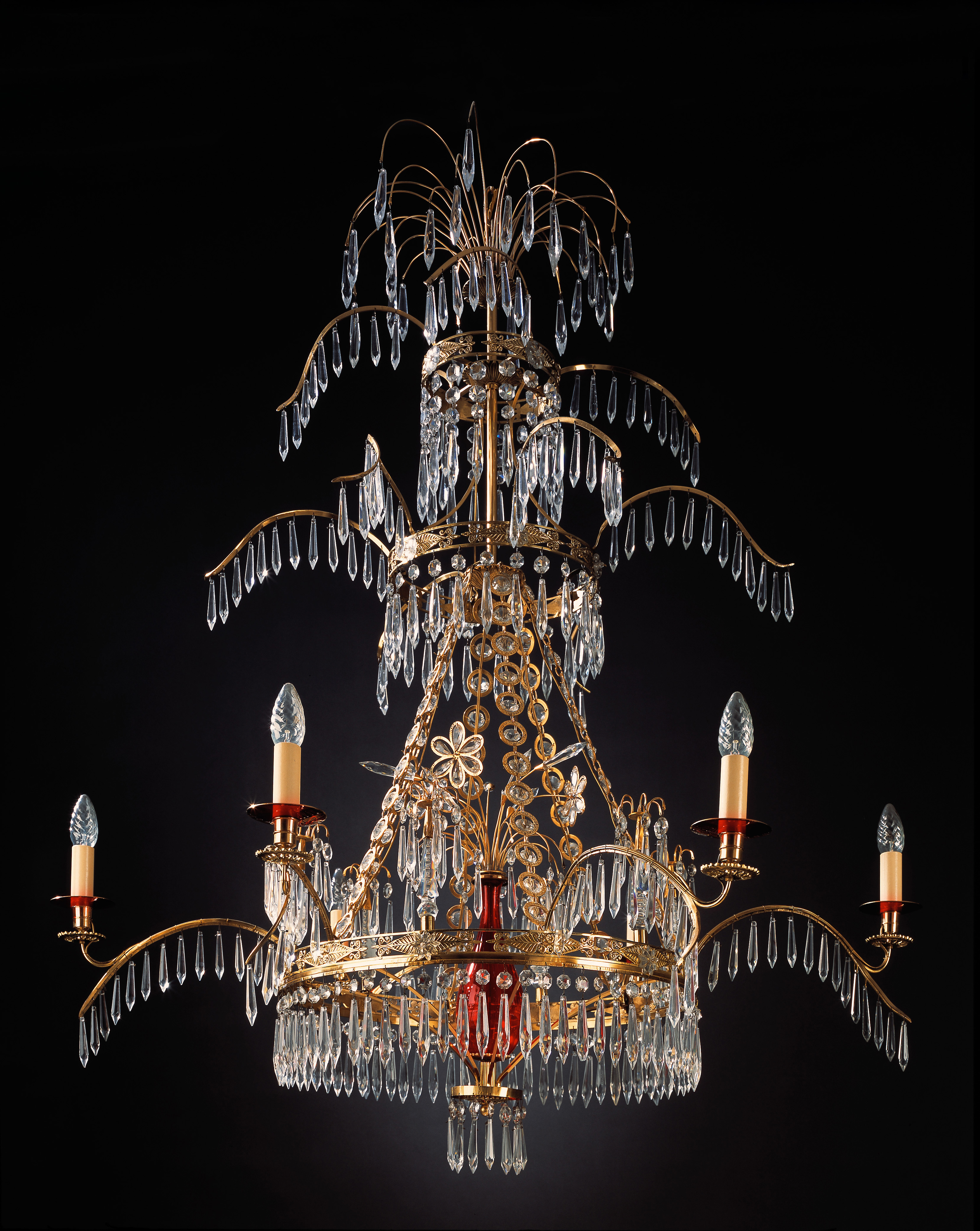 Die beiden eleganten sechsflammigen ‚geflügelten’ Kronleuchter scheinen zu schweben. Außerordentlich dekorativ sind ihre rubinroten Glasvasen, gefüllt mit Rispen und großblättrigen Blüten. Nur sehr selten können Prismenkronen als Pendants angeboten werden.