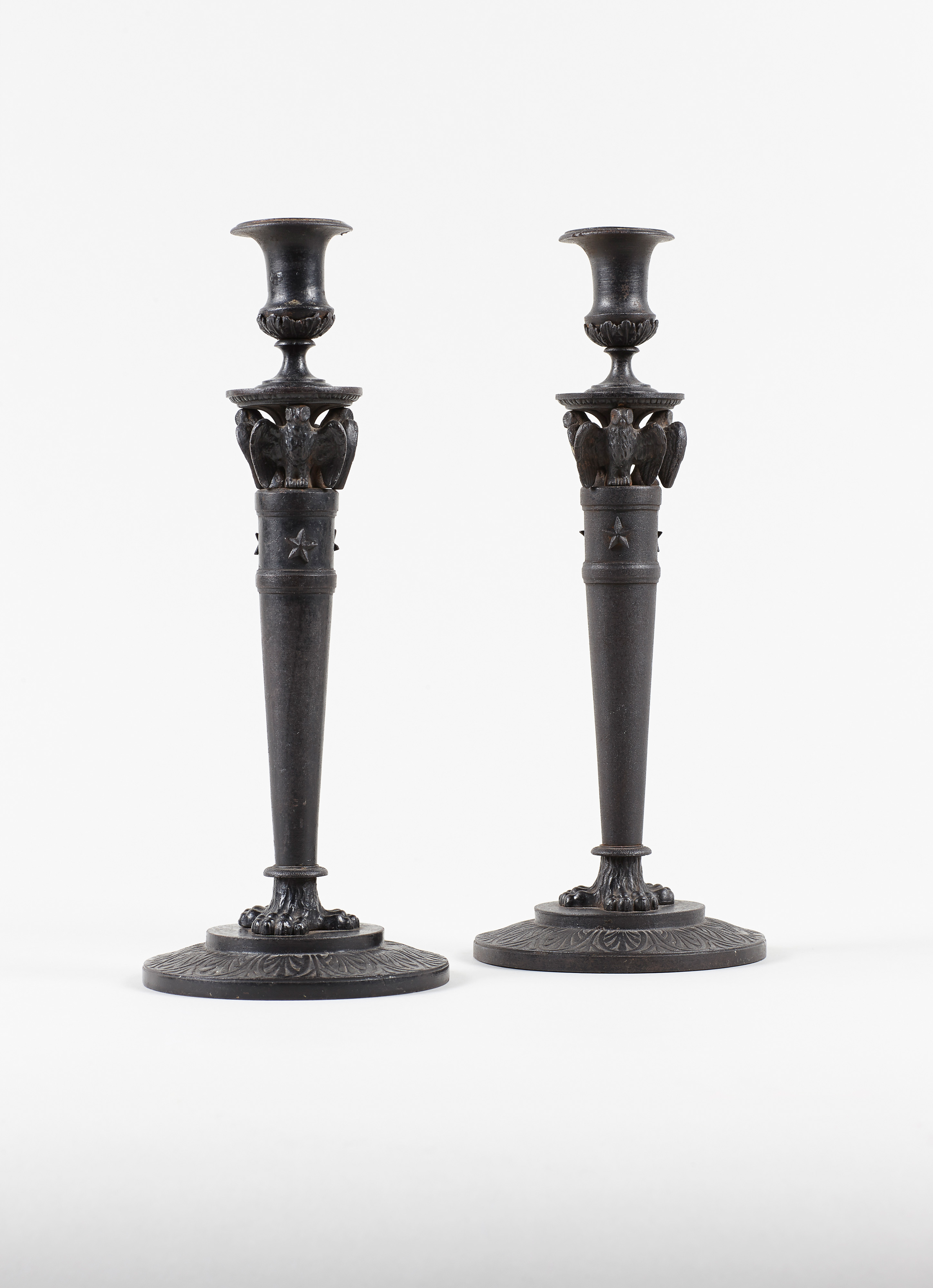 Runde leicht gewölbte, mit Palmetten verzierte Fußplatte; auf der abschließenden Plinthe tragen drei Löwentatzen den sich nach oben erweiternden Schaft auf dem drei Eulen mit aufgespannten Flügeln stehen und die profilierte Deckplatte mit einer kraterförmigen Kerzentülle stützen. Der profiliert abgesetzte Schaftabschluß ist mit drei eingesteckten fünfzackigen Sternen verziert.