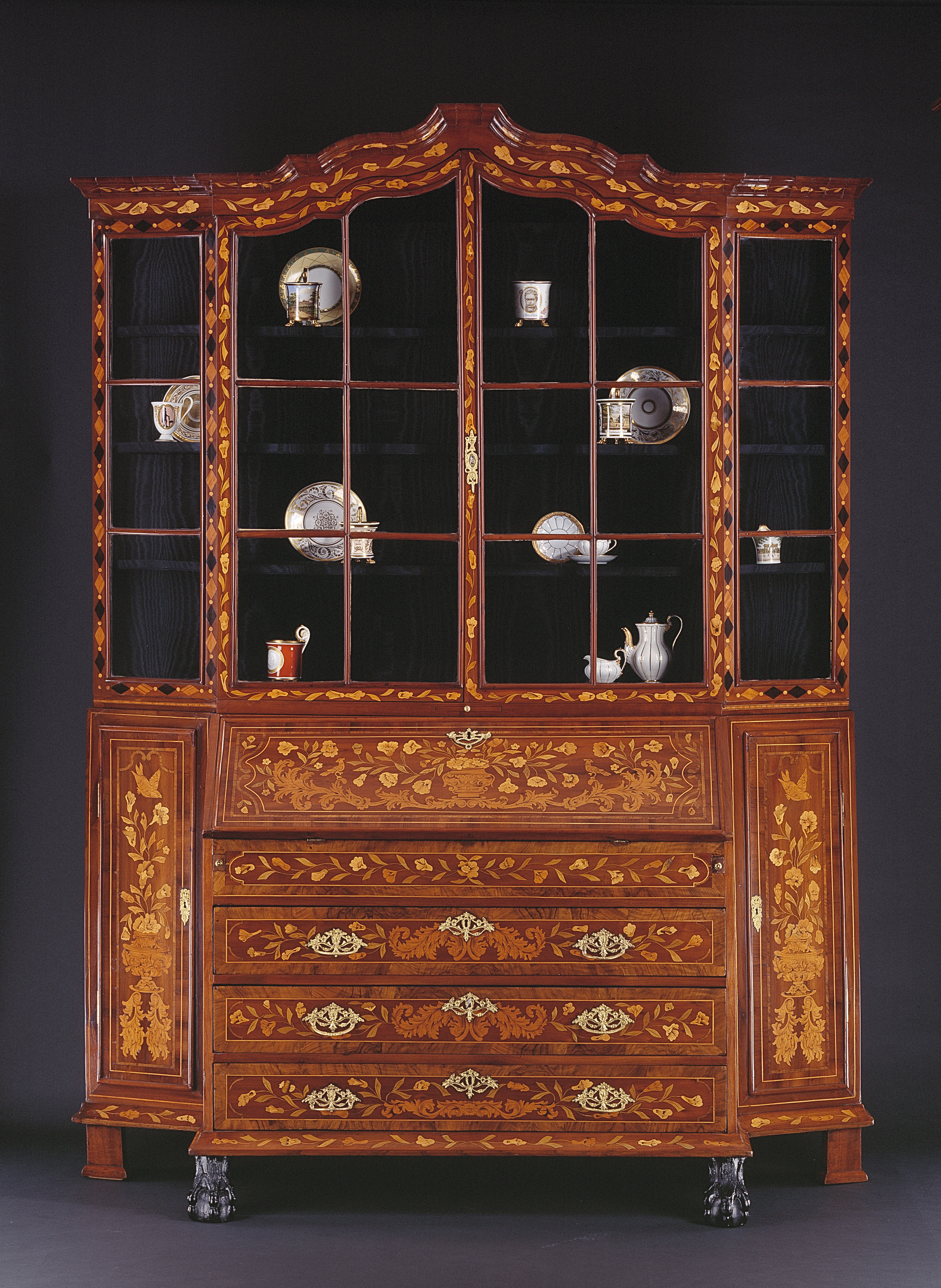 In den Niederlanden war es im 19. Jahrhundert Mode, kostbare Aufsatzschränke von renommierten Intarsienkünstlern spezialisierter Werkstätten, mit naturalistischer Blumenmarketerie zu veredeln. Ein repräsentativer Vitrinenschrank des Großbürgertums.