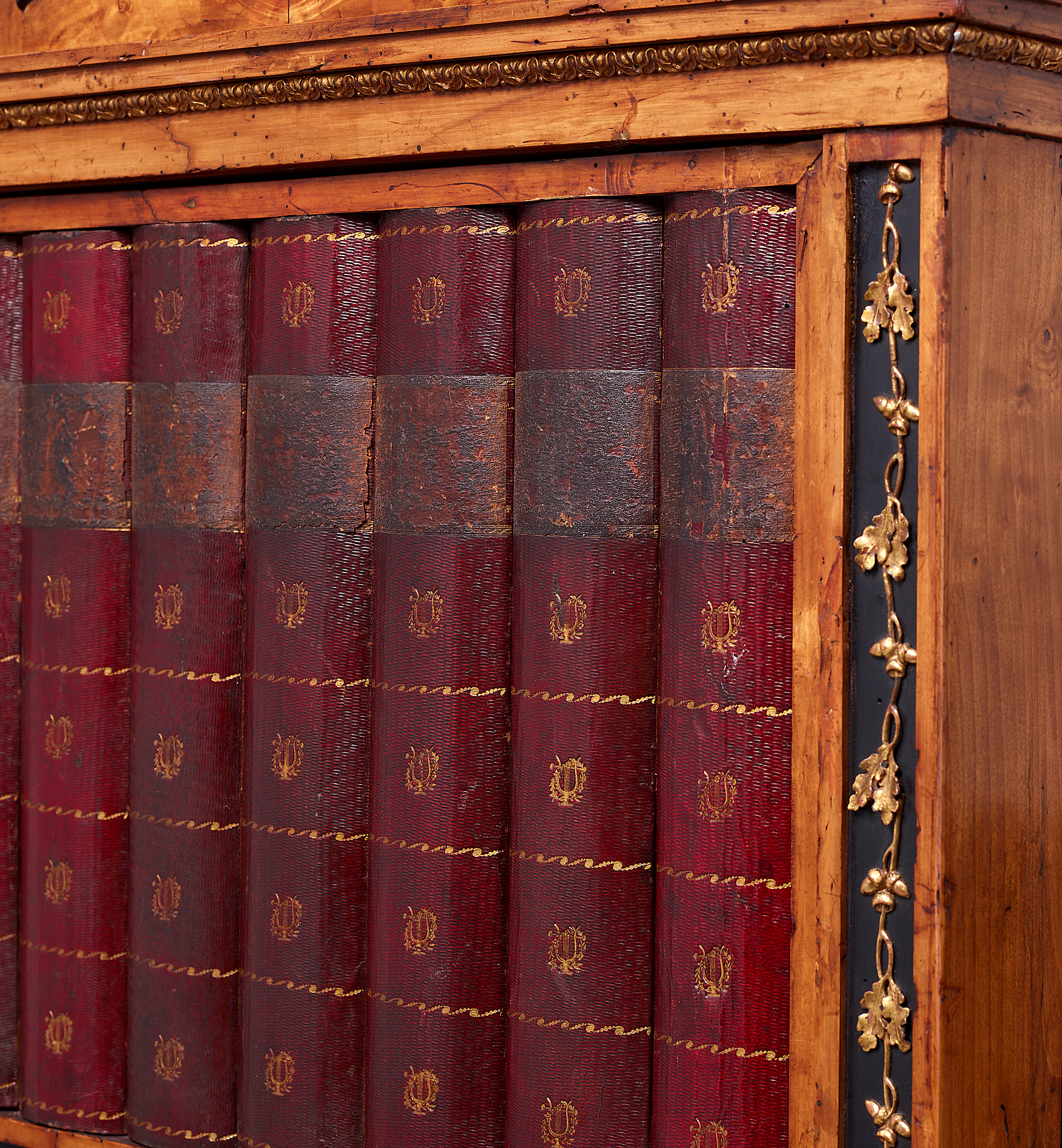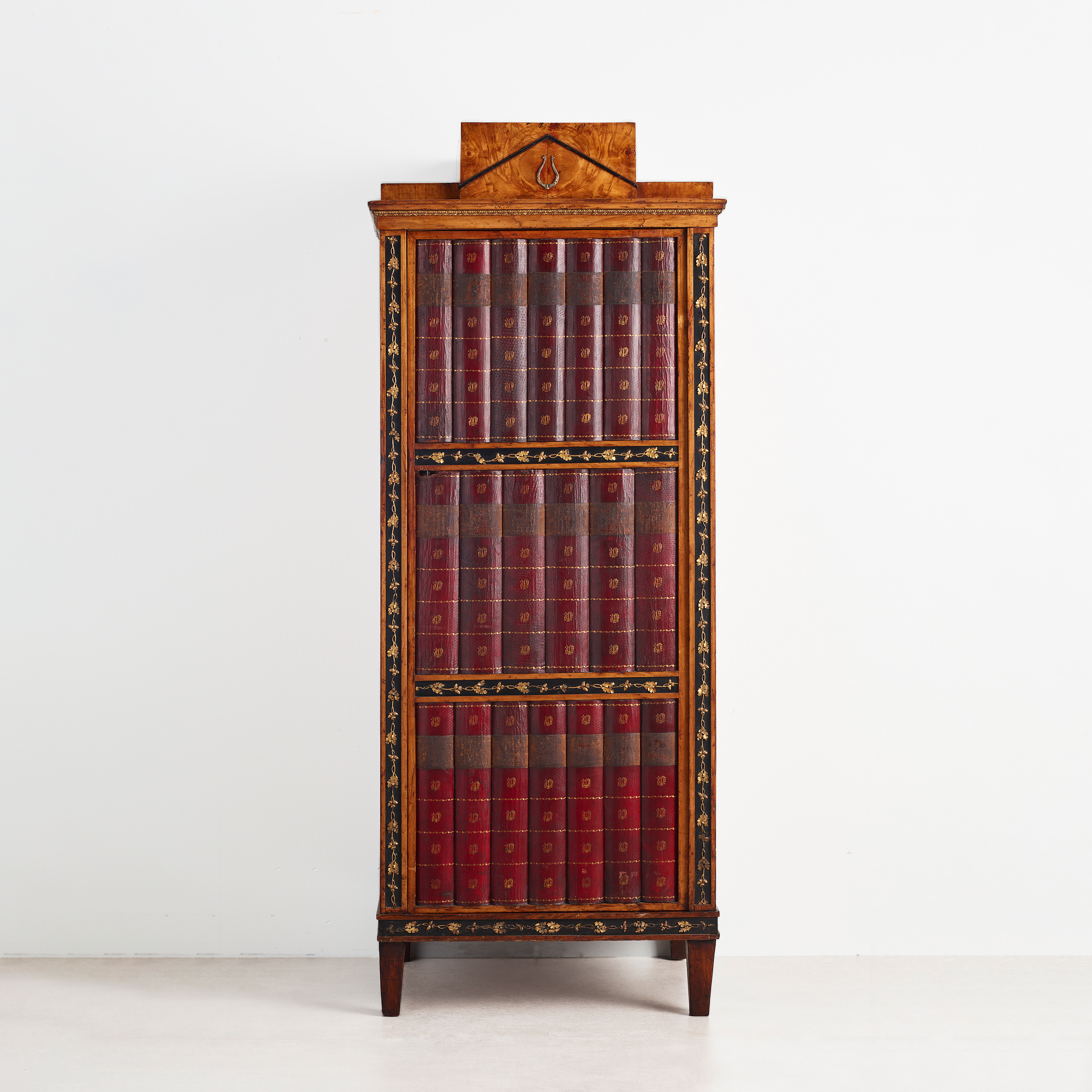 Der hochrechteckige Kabinettschrank in architektonischer Form; die große Tür ist in drei Felder aufgeteilt und mit Attrappen von Buchrücken in Leder versehen, dahinter zwei Regalbretter. Zwischen den Türfeldern zwei horizontale, sowie lateral zwei vertikale Zierrahmungen in ebonisiertem Obstholz mit feinem Dekor in Form von Eichenblättern und Eicheln aus ölvergoldetem Zinn. Der getreppte Abschluss mit einer zentralen Schublade mit Wurzelholzfurnier und einer Lyra in vergoldetem Messing. Die Korpusseiten in einer Rahmen-Füllungskonstruktion. Auf konisch zulaufenden Vierkantbeinen. Seltenes und dekoratives Möbel aus der Zeit des Klassizismus.