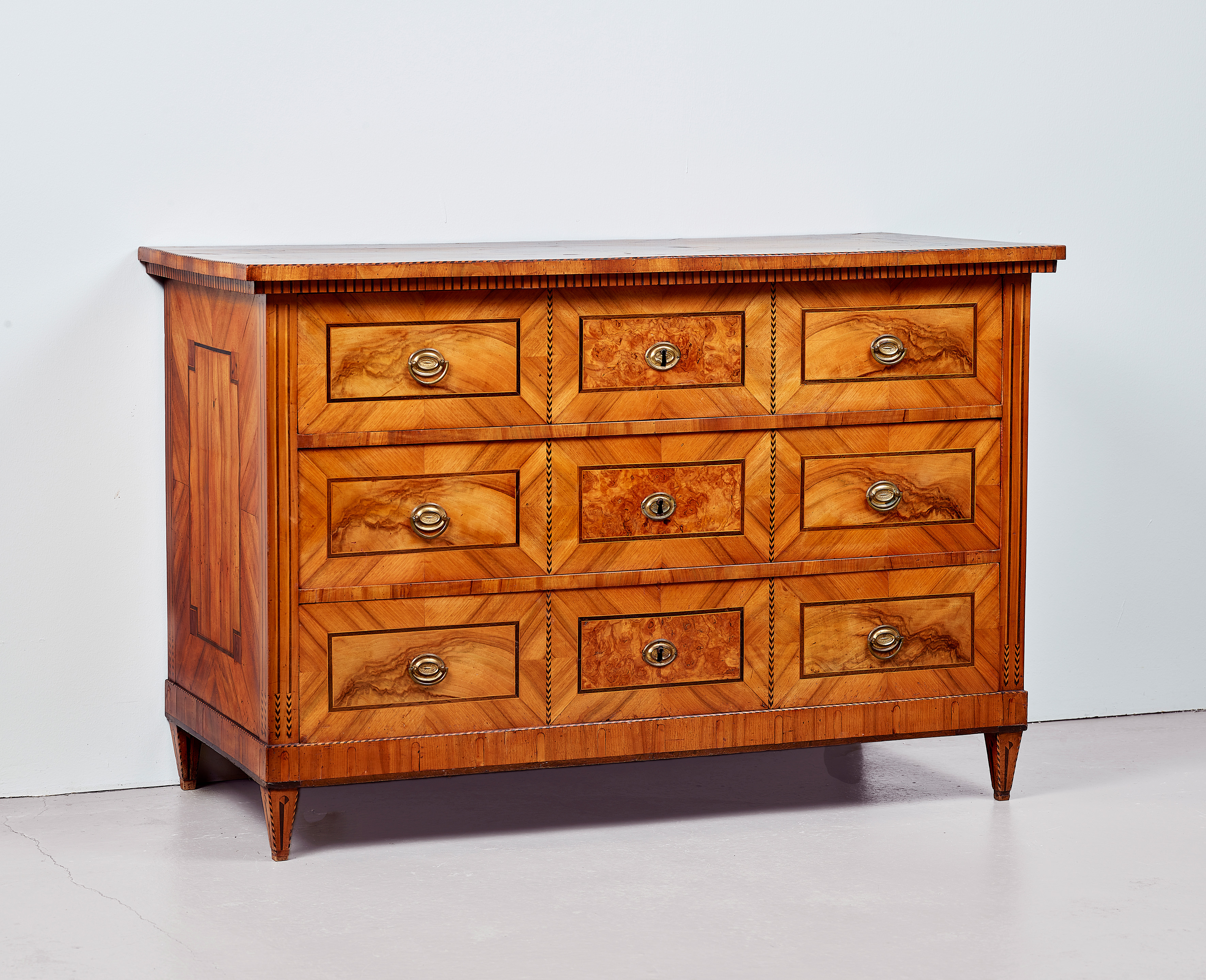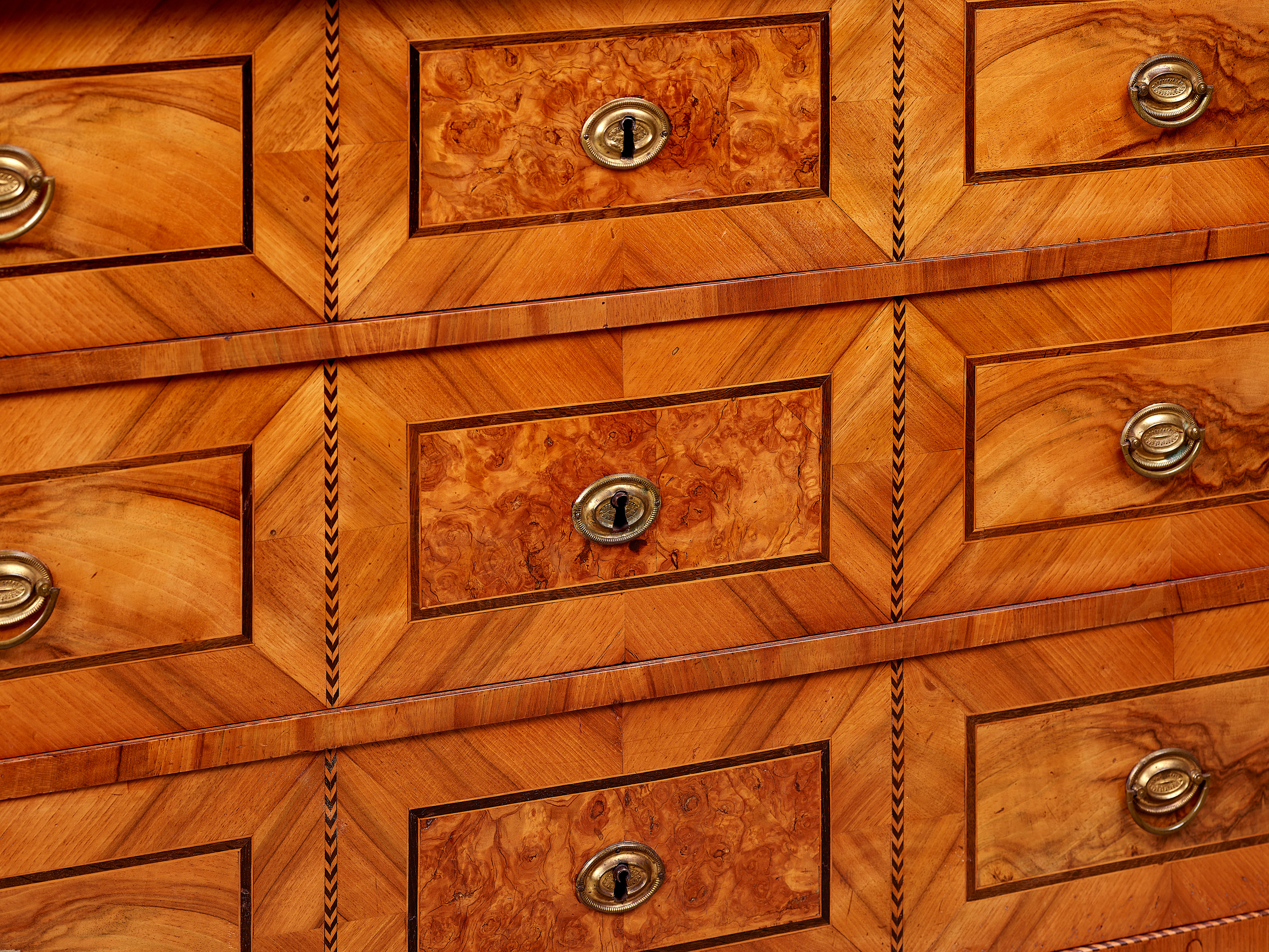 Nußbaum, Nußbaummaser, Mooreiche, Eibe, Buchsbaum, Ahorn, Pappelmaser furniert auf Eiche, Kirschbaum und Nadelholz. Messing Beschläge, Eisenschlösser