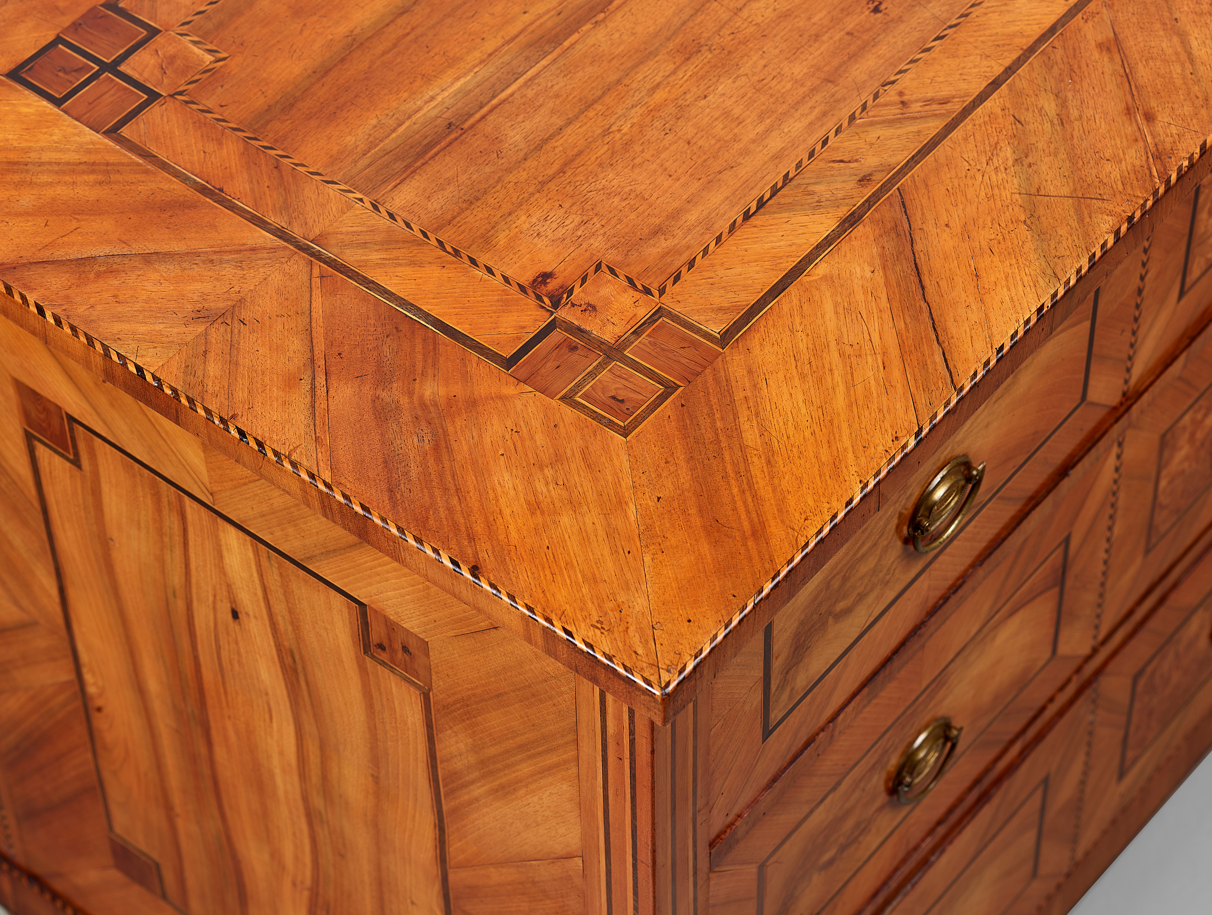 Schon ein Vorgriff auf das später folgende Biedermeier? Der breite, umlaufende Fries aus schräggestelltem Nussbaumfurnier (45°) bildet den äußeren Rahmen. Dann folgt die Bandeinlage, die sich in den Ecken zu einem Quadrat überschneidet. Daran schließt sich ein zweiter, entgegengesetzter Fries aus schräggestelltem Nussbaumfurnier mit einer weiteren schwarzweißen Bordüre an. Die Seiten sind mit einem Fries aus schräggestelltem Nussbaumfurnier und einer Füllung aus senkrecht laufendem Nussbaum dekoriert. Beide Flächen werden durch eine Bandeinlage, die in den Ecken eingerückt ist, voneinander getrennt. Durch eine gezielte Auswahl von unterschiedlichen Maserungen mehrerer Nussbaumsorten entsteht eine abwechslungsreiche Flächengestaltung.