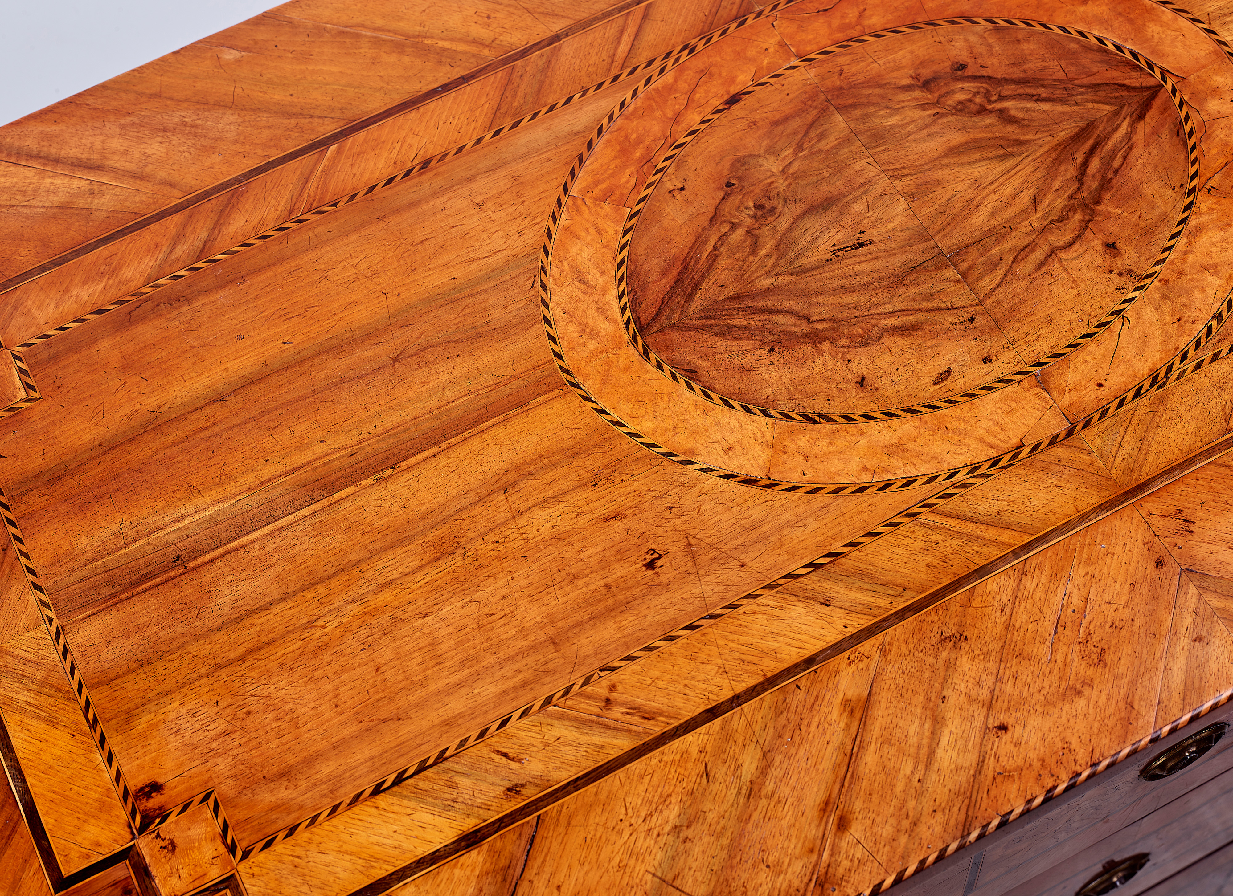 Alle drei großen, in der Front geraden Schubkästen besitzen die gleiche Flächengliederung. Arnd hat den Schubkasten in drei Felder auf-geteilt. Die beiden äußeren Felder sind gleich groß, das mittlere Feld ist etwas kleiner. Alle Felder besitzen dennoch die gleiche Rahmung: ein Fries aus schräggestellten (45°) Nussbaumfurnieren. Die Füllungen der Außenfelder sind aus Nussbaumfurnier, das Innenfeld aus Pappel-maserfurnier. Sie sind umgeben von einem Band aus Mooreiche mit seitlichen Fäden aus Ahorn. Unterhalb der Platte verläuft, leicht zurück-versetzt, eine Leiste mit senkrechten Furnieren in Nussbaum und dünnen Linien in Mooreiche.Die Aufsicht der Platte verrät durch das zentrale Queroval mit breitem Fries und Spiegel den immer noch vorhandenen Zugriff auf die Formen des Louis-Seize Stils. Die Plattenansicht verdeutlicht, wie das natürlich gewachsene Holz mit seiner Maserung als dekoratives Element von Arnd bewusst eingesetzt wird.