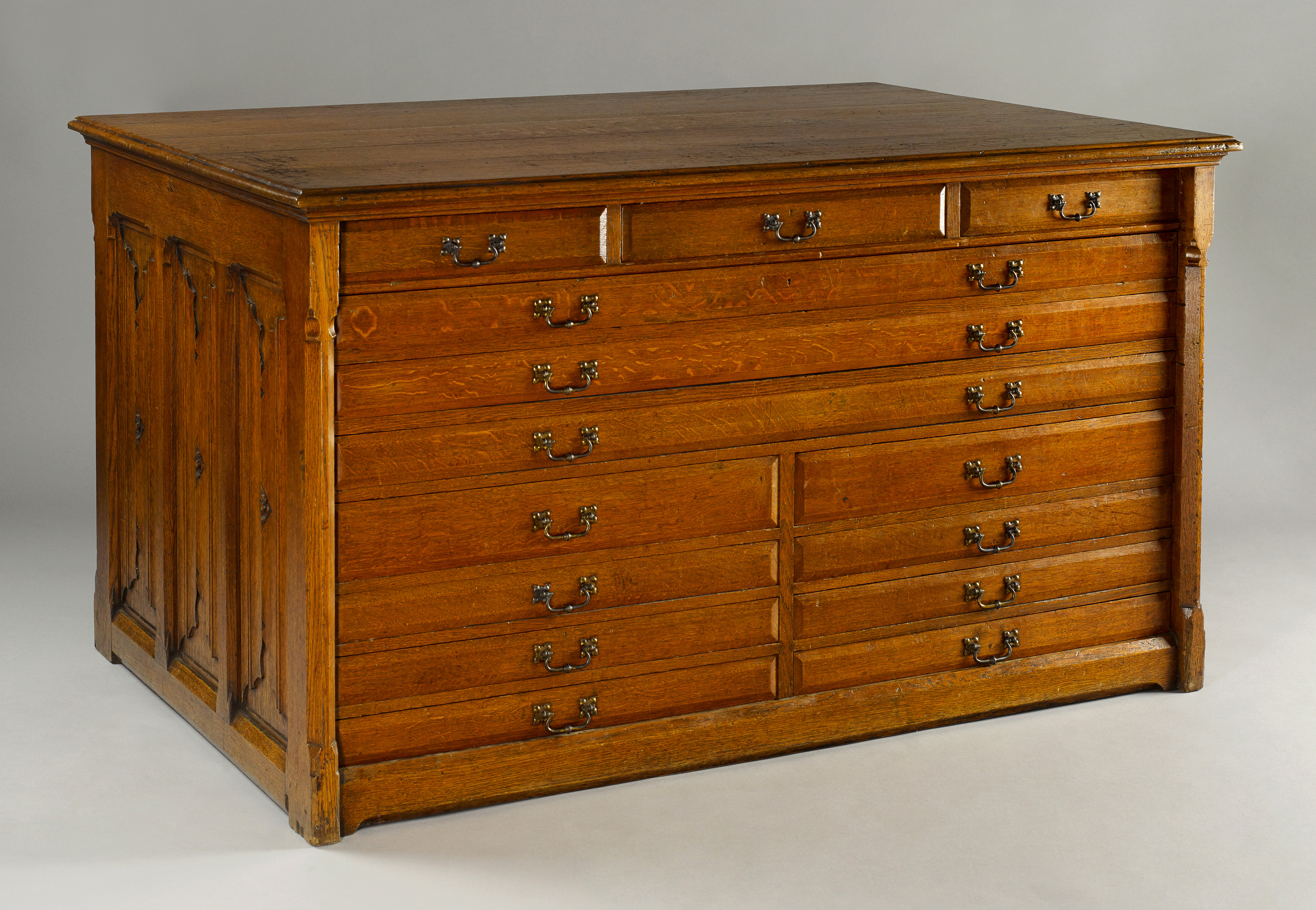 Viktorianischer Bibliotheksschrank im neugotischen Stil. Die Vorderseite mit drei großen und elf kleinen flachen Schubladen zur Unterbringung von Grafik, Karten und Zeichnungen. Auf der Rückseite nochmals drei kleine Schubladen über fünf Füllungen, die mit Faltwerk reliefiert sind; auf der zentralen Füllung ein geschnitztes ligiertes Monogramm ‚HP’. Die Seitenwandungen ebenfalls mit gotischen Faltwerk-Füllungen. Seltener Kartenschrank mit einer schönen Patina.