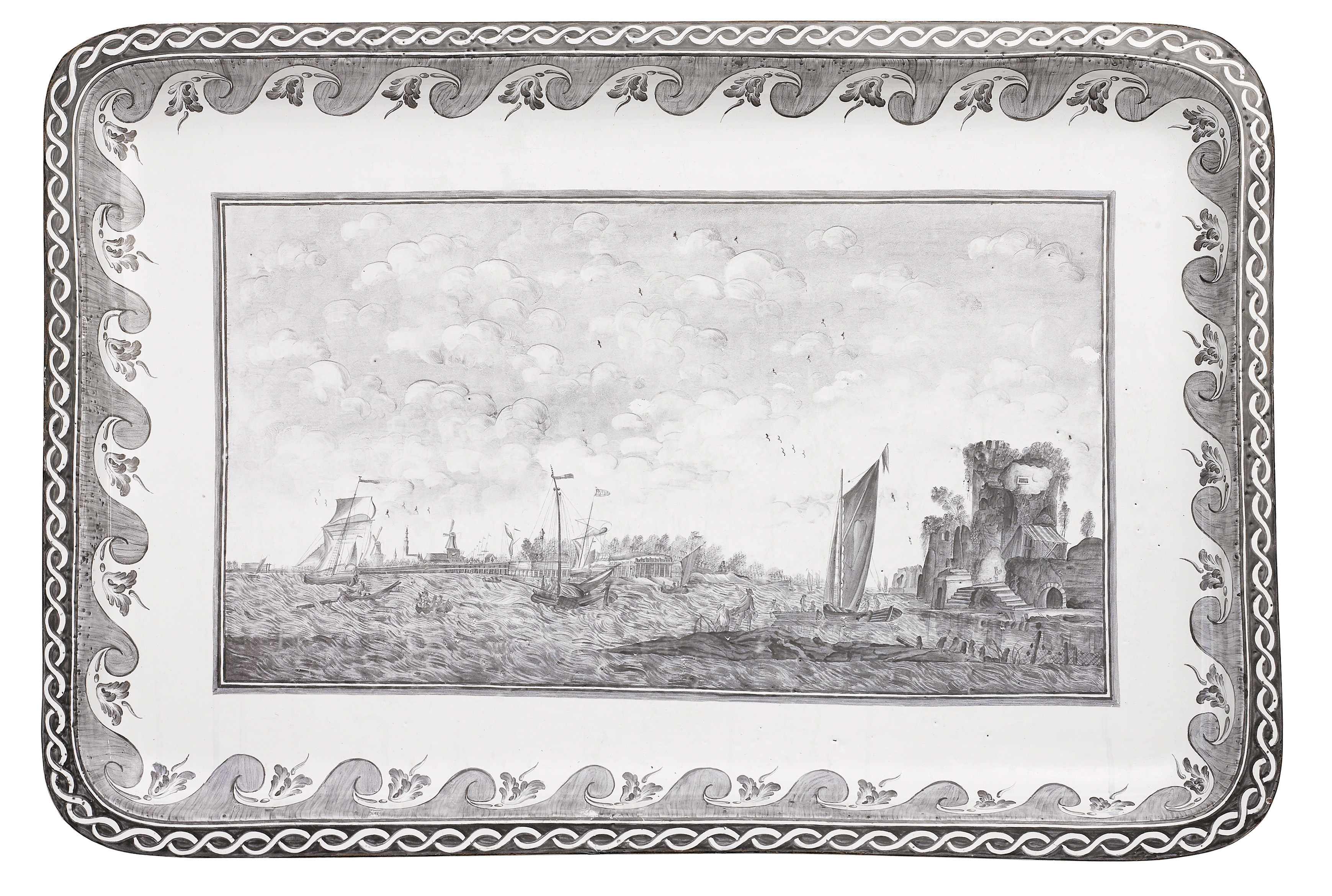 Diese große Teetischplatte ist eine der wenigen überkommenen Fayenceplatten, die perfekt erhalten ist. Die Fayencemalerei aus der Periode Elias Magnus Ingmann-Nordenstolpe, 1753-1773, ist von eindrucksvoller Virtuosität; sie nimmt Bezug auf Handzeichnungen oder graphische Vorlagen, so wie es im 18. Jahrhundert auch in der Porzellanmalerei üblich war.