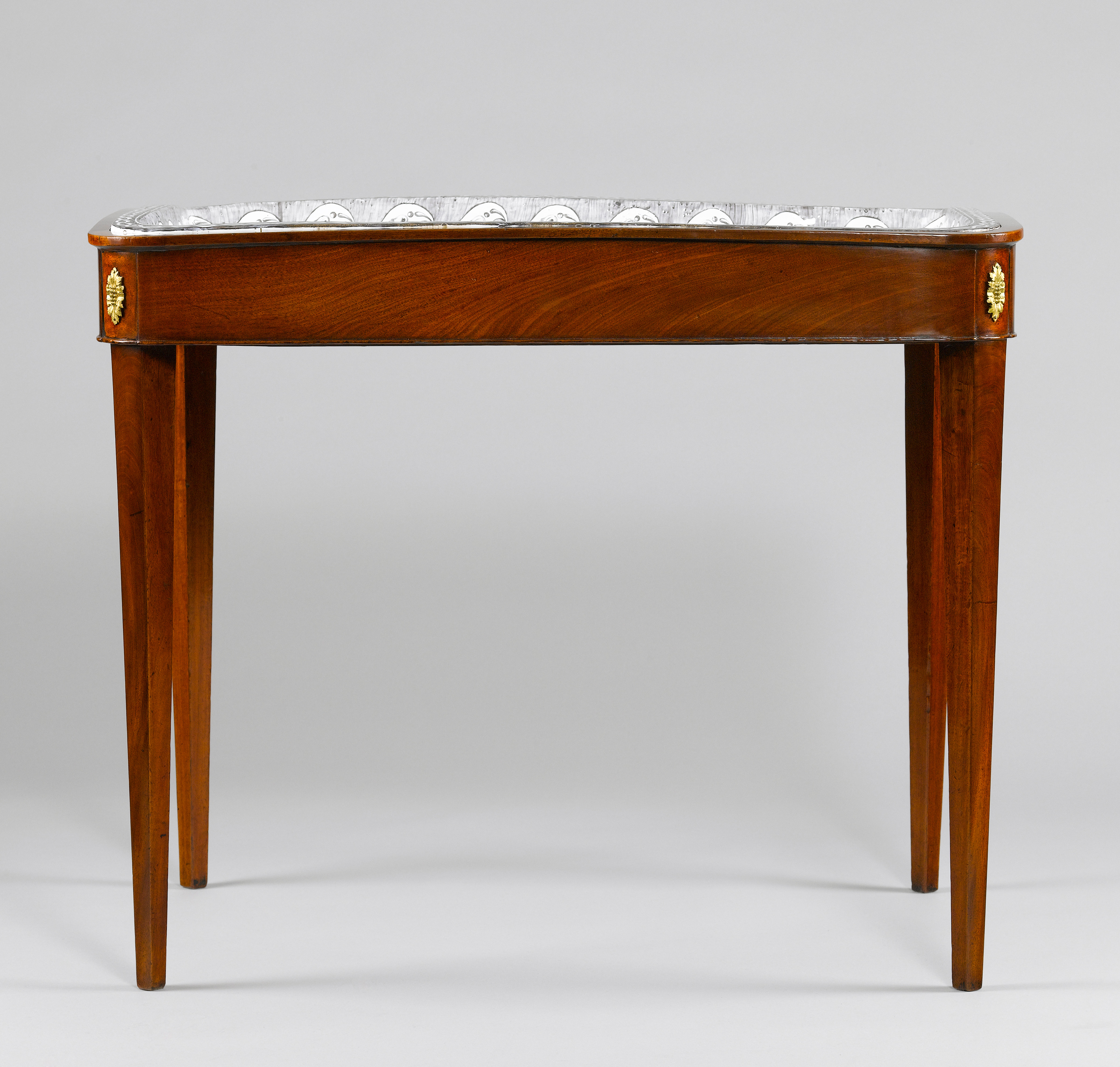 Fayence. Mahagoni massiv und Mahagoni furniert; Bronzeapplikationen, gegossen, ziseliert und feuervergoldet.