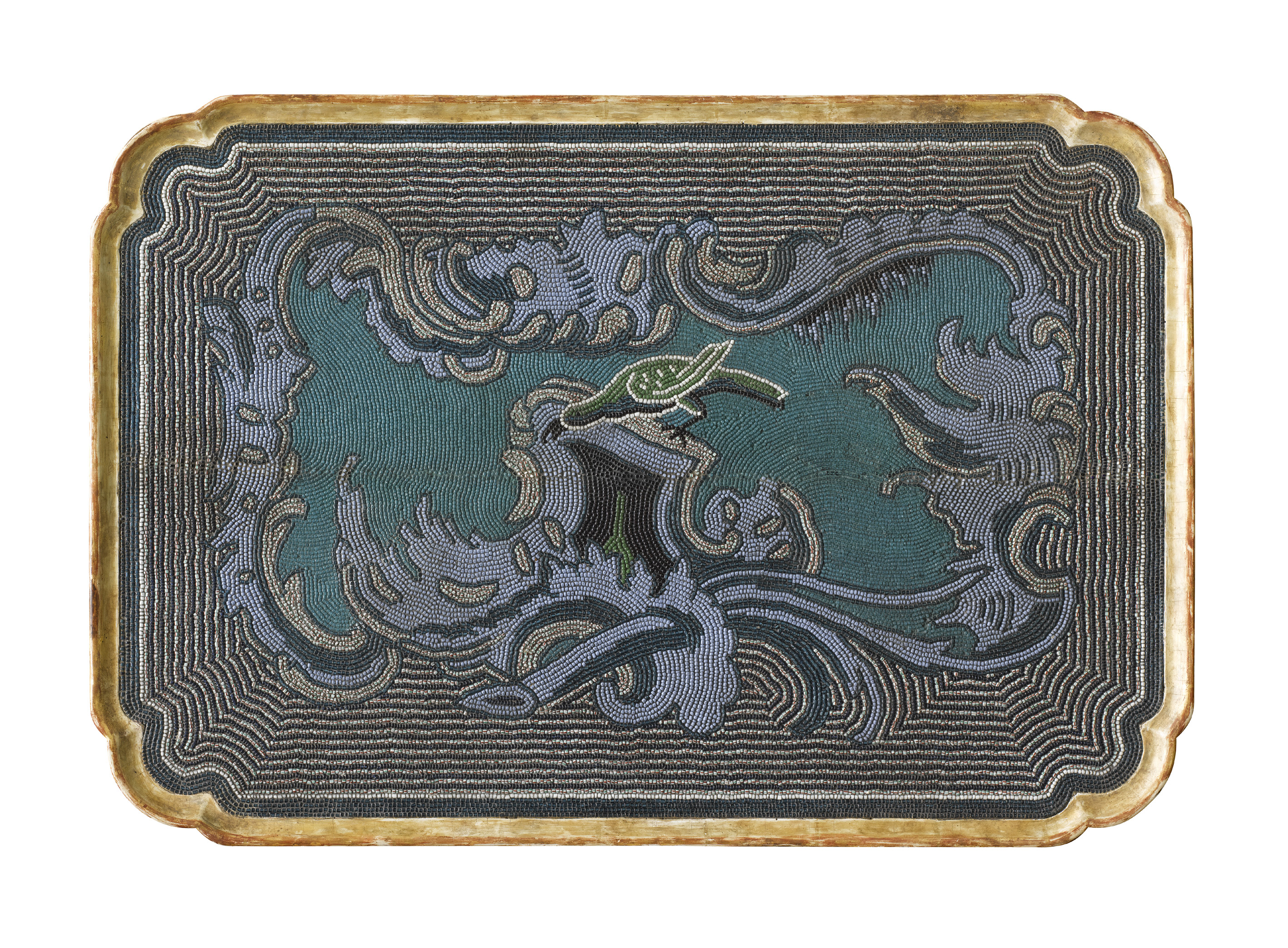 Die Tischplatte ist ausgelegt mit einem bunten Glasperlenmosaik; die einzigartige künstlerische Schöpfung van Selows vermittelt die Aura eines glanzvollen Gemäldes in seiner historisch unveränderten Farbigkeit.