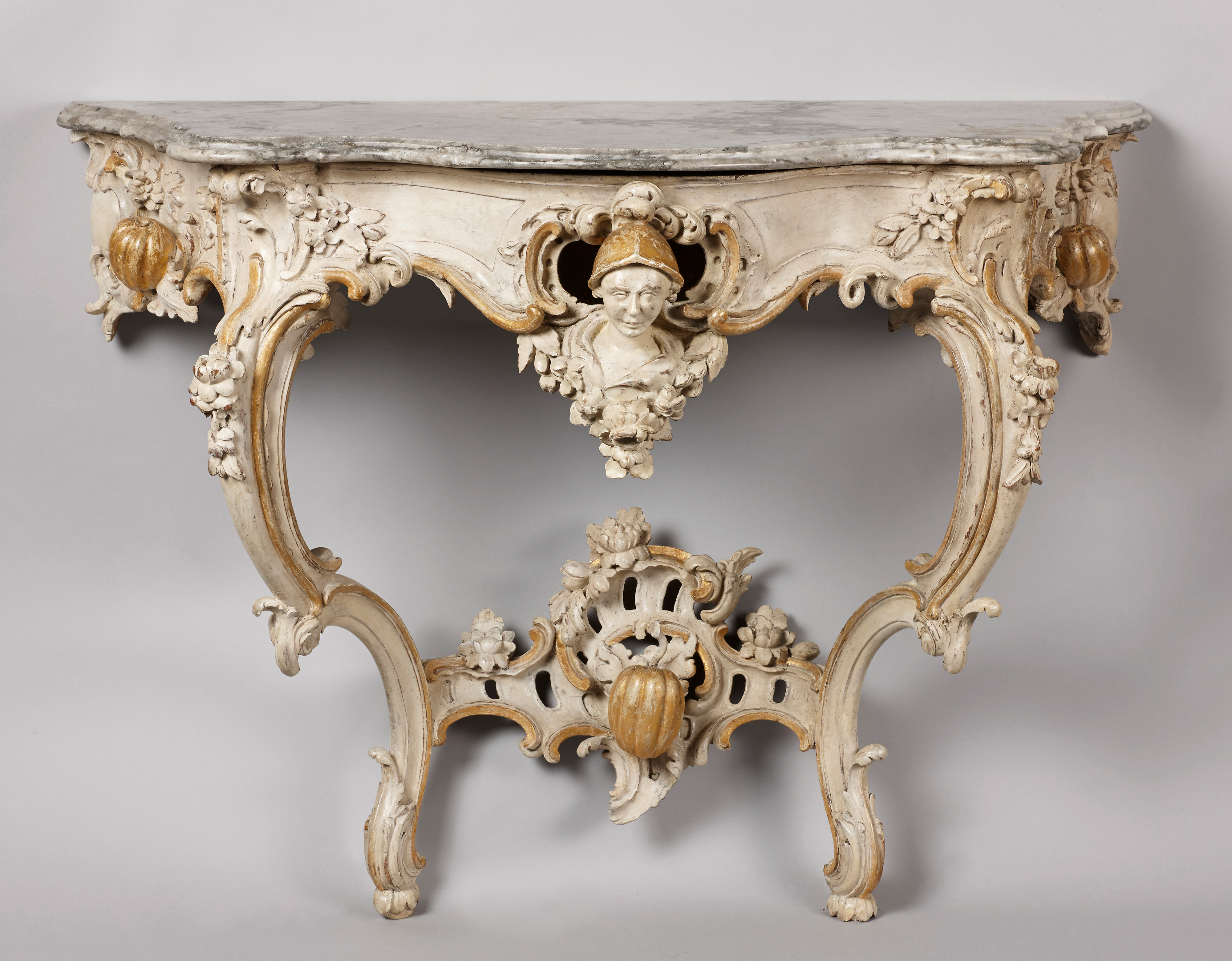 Die beiden Beine, die sich aus zwei gegenläufigen, kräftigen C-Schwüngen konstituieren, tragen die geschweifte, bogenförmig ausgeschnittene Zarge. Die seitlichen Zargen werden jeweils von einem vollplastisch geschnitzten Etrog, dem Apfel des Paradieses, akzentuiert und auch als Applikation auf der Muschelschnitzerei des Fußstegs wird dieses ungewöhnliche Detail zitiert. Darüber, eingebunden in eine Kartusche, ist eine floral umkränzte Porträtbüste mit Helm und bekrönendem Federschmuck auf den Betrachter ausgerichtet. Den Abschluß bildet eine außerordentlich qualitätvolle, profilierte Marmorplatte in sehr guter, originaler Erhaltung.
