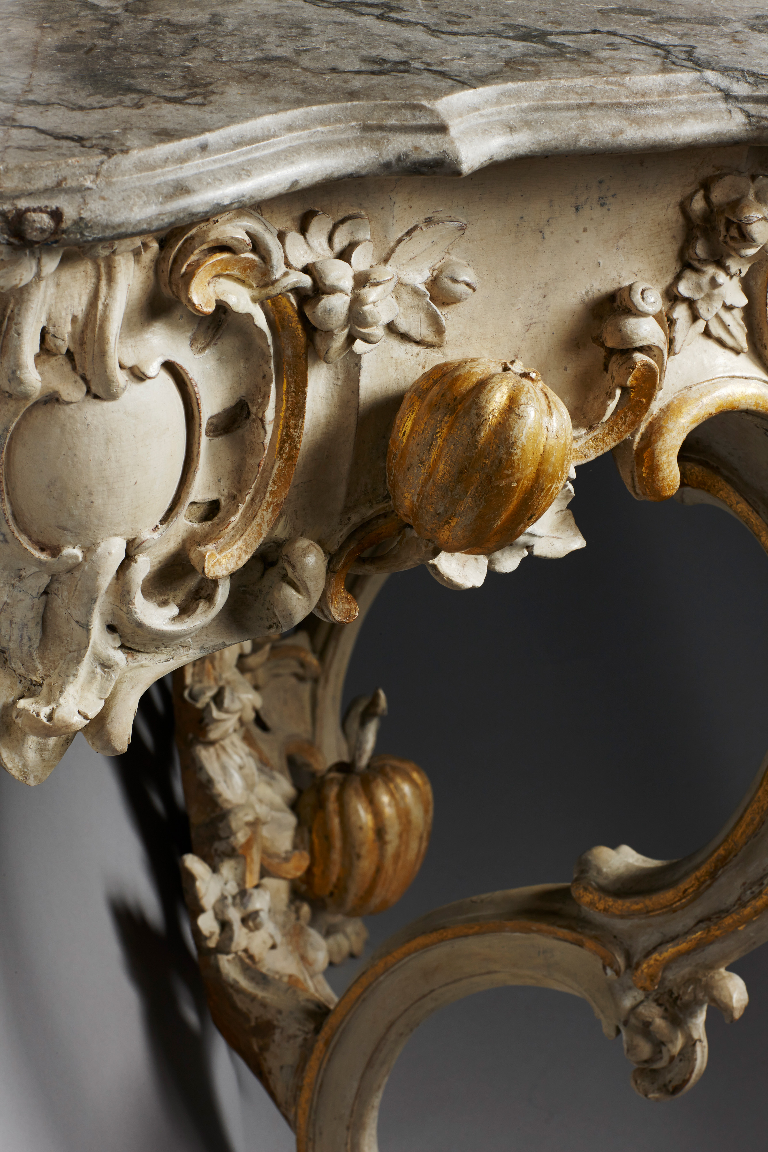 Holz geschnitzt, gefasst und vergoldet. Platte aus grauweißem Marmor, dunkelgrau geadert.