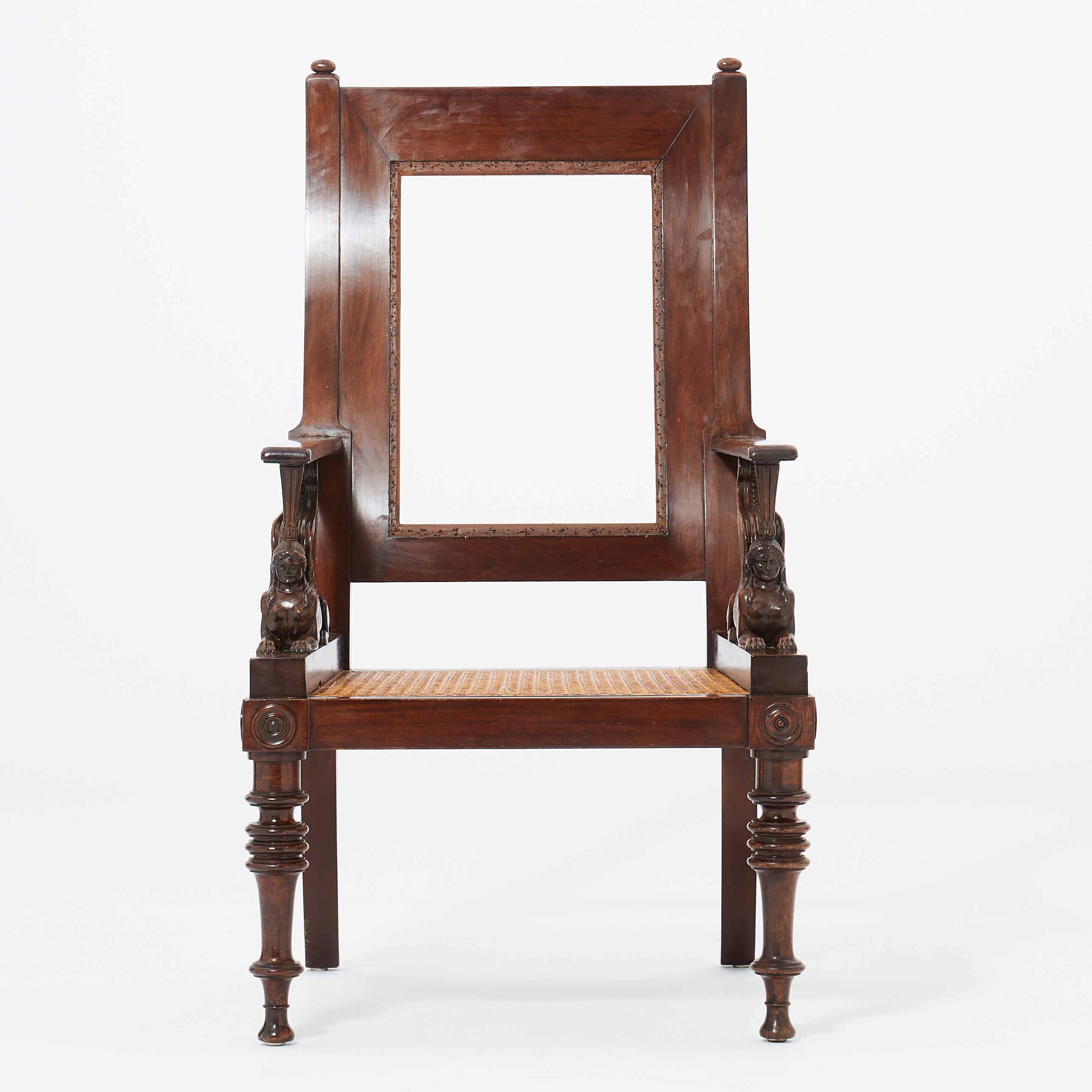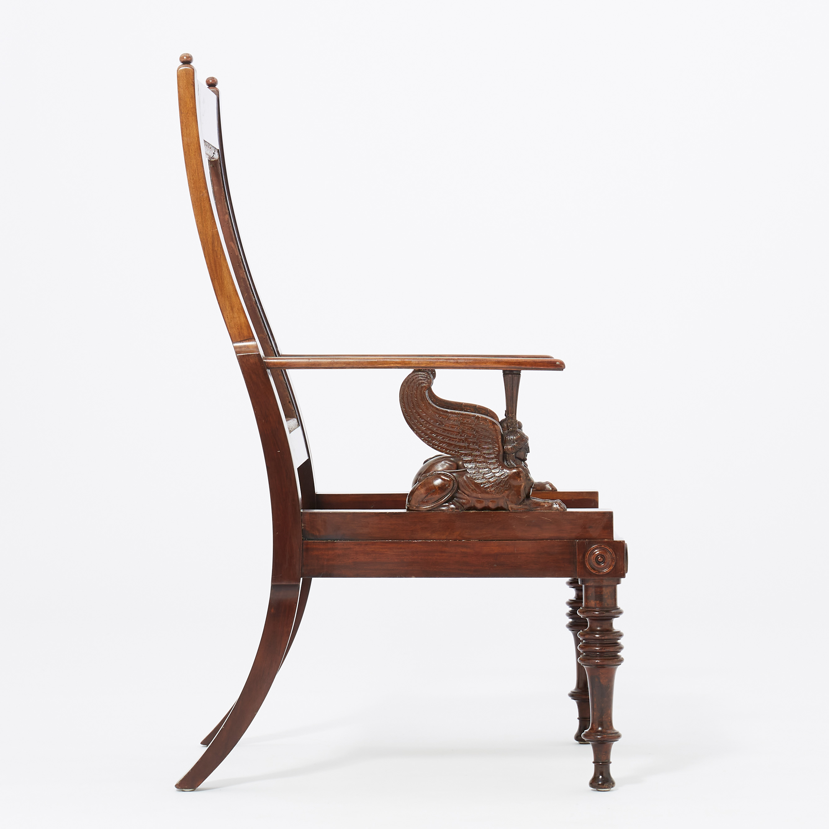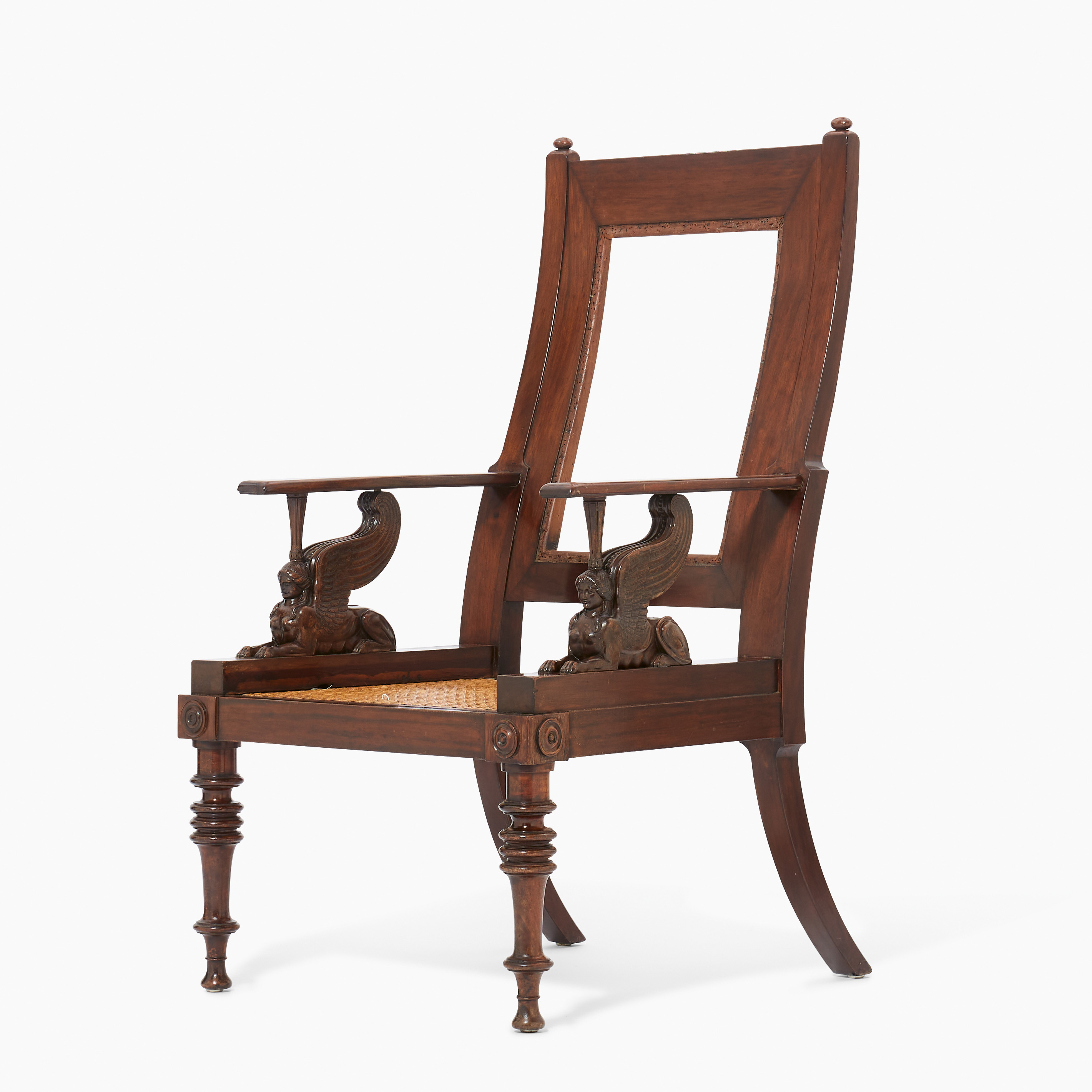 Armlehnstuhl mit Sphinxen im Pompejanischen Stil Entwurf von Hermann Ernst Freund (1786-1840) Kopenhagen, 1830er Jahre Mahagoni massiv Höhe: 116 cm | Breite: 65 cm | Tiefe: 70 cm | Sitzhöhe: 45 cm Inv. Nr.: 3337