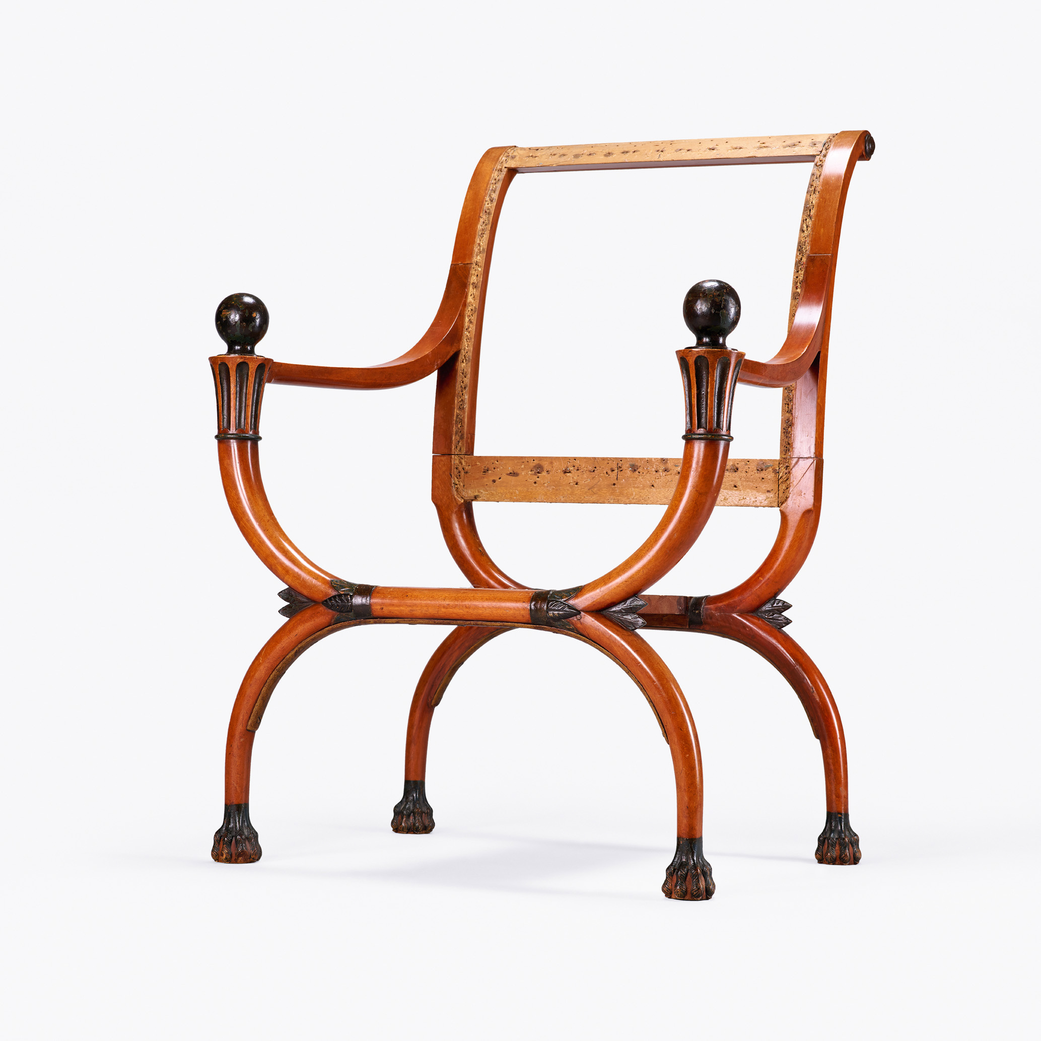 Paar Directoire Armlehnstühle à l’antique Möglicherweise George Jacob (1739-1831). Paris, um 1800. Mahagoni, teilweise beschnitzt und ebonisiert. Höhe: 90 cm | Breite: 64 cm | Tiefe: 51 cm Inv. Nr.: 3600