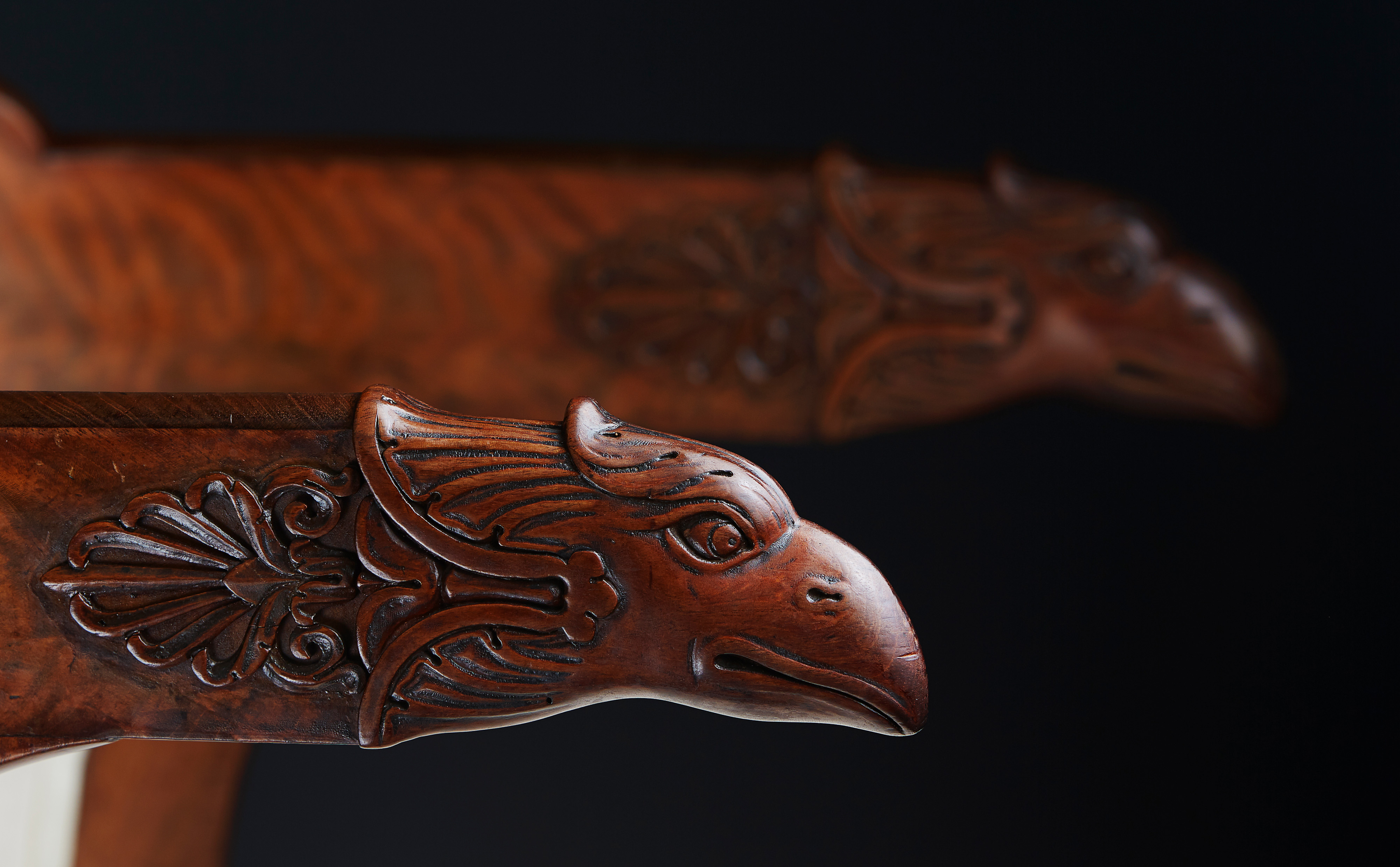 Ungewöhnlicher nordeuropäischer Armlehnstuhl aus Mahagoni mit original Messingfüßen sowie geschnitzten Armlehnen mit Adlerköpfen. Der neoklassizistische Empire Entwurf ist vermutlich aus Berlin oder Kopenhagen, beispielsweise von Karl Friedrich Schinkel oder Gustav Friedrich Hetsch. Der Armlehnstuhl bietet einen hohen Sitzkomfort und das Mahagonifurnier hat eine sehr ansprechende Maserung.