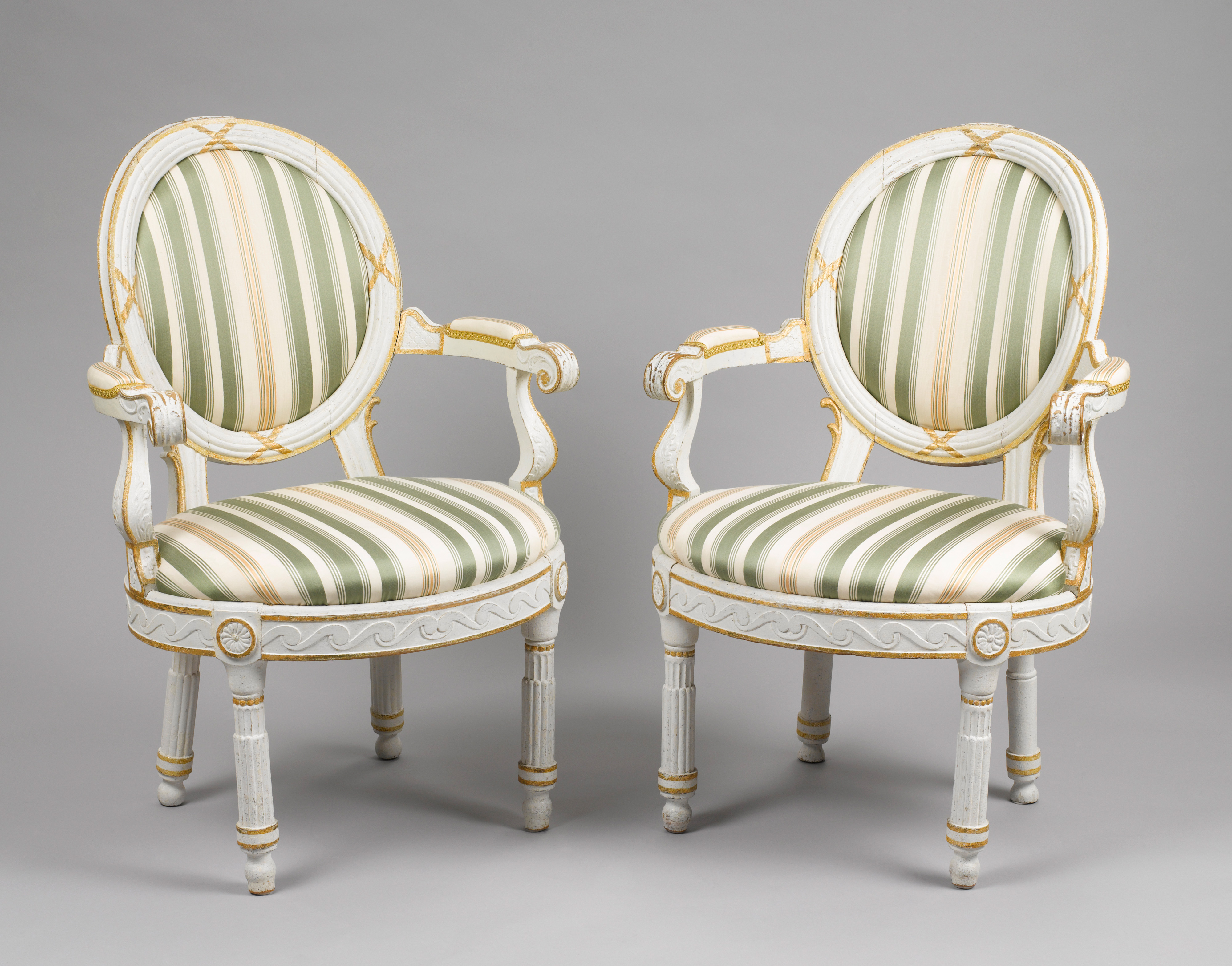 Die hochovale Form des Rahmens ist inspiriert vom Typus des Medaillonfauteuils; die konvex gebogte Rückenlehne ist profiliert in der Art von Rutenbündeln (‘fasces’) mit Schleifenbändern und wird getragen von kurzen, profilierten Stützen. Die Armlehnen mit gepolsterten Manschetten schwingen weit aus und münden in Voluten mit geschnitztem Akanthusblattdekor; außergewöhnlich komfortabel ist die querovale Sitzfläche.