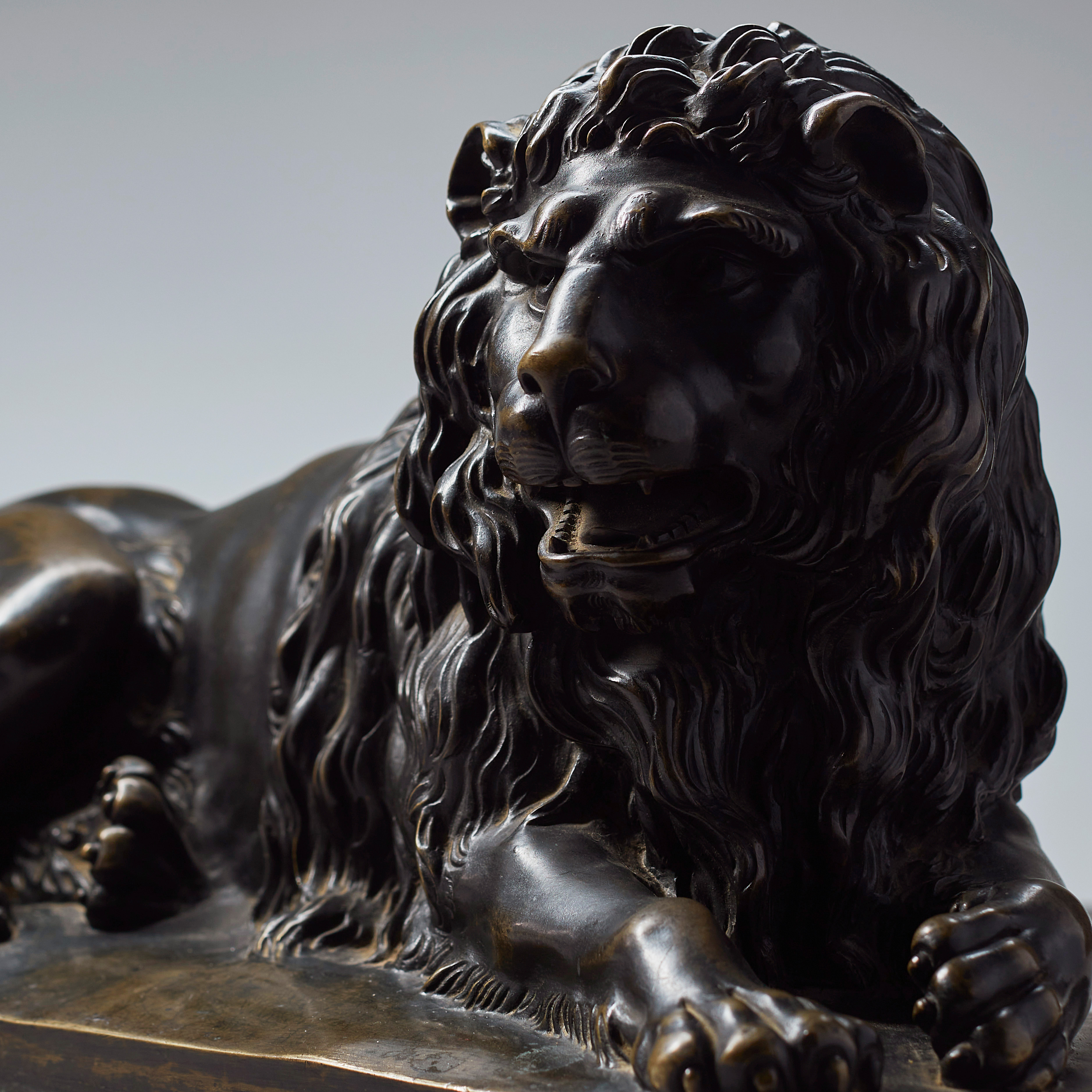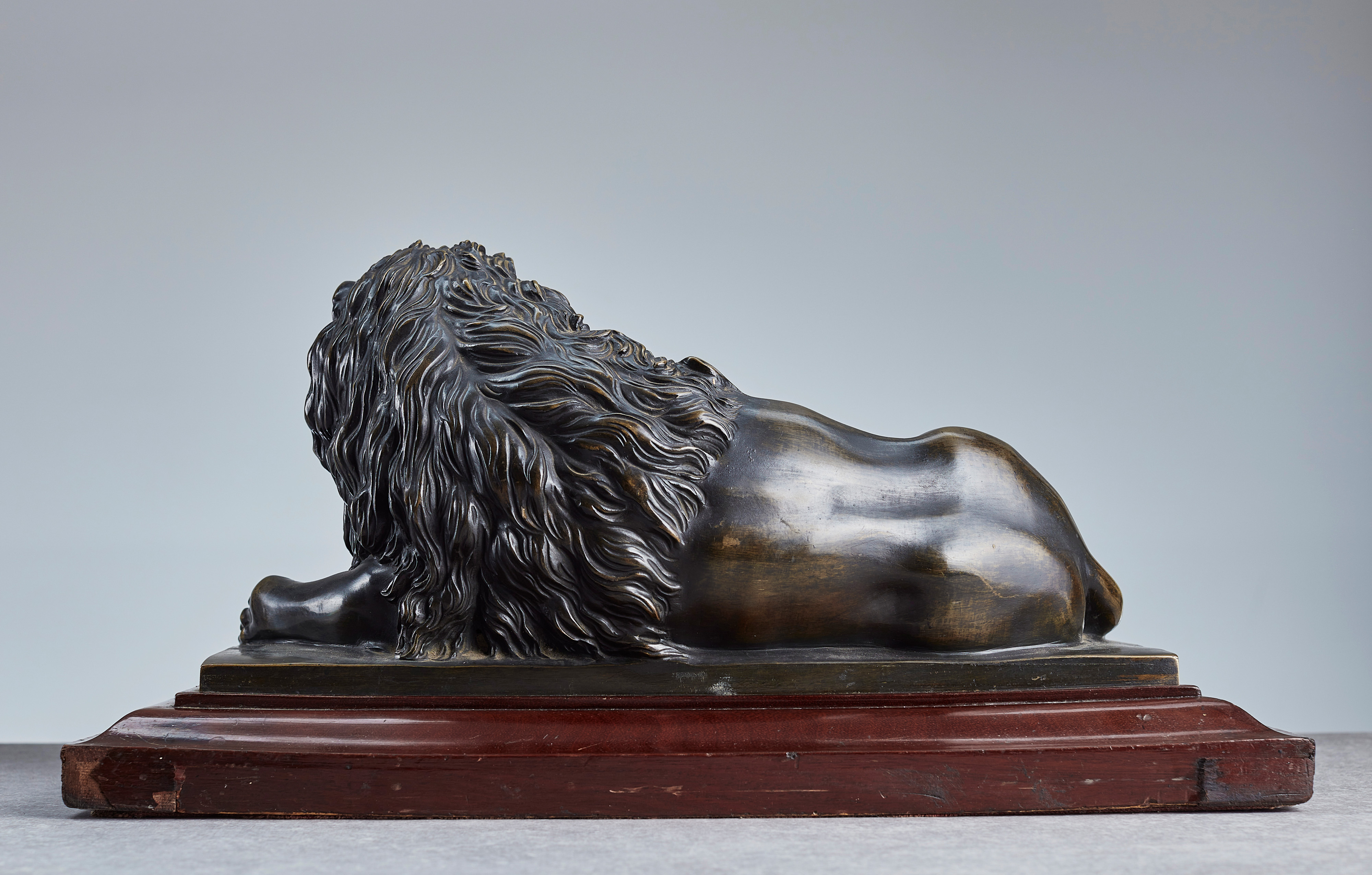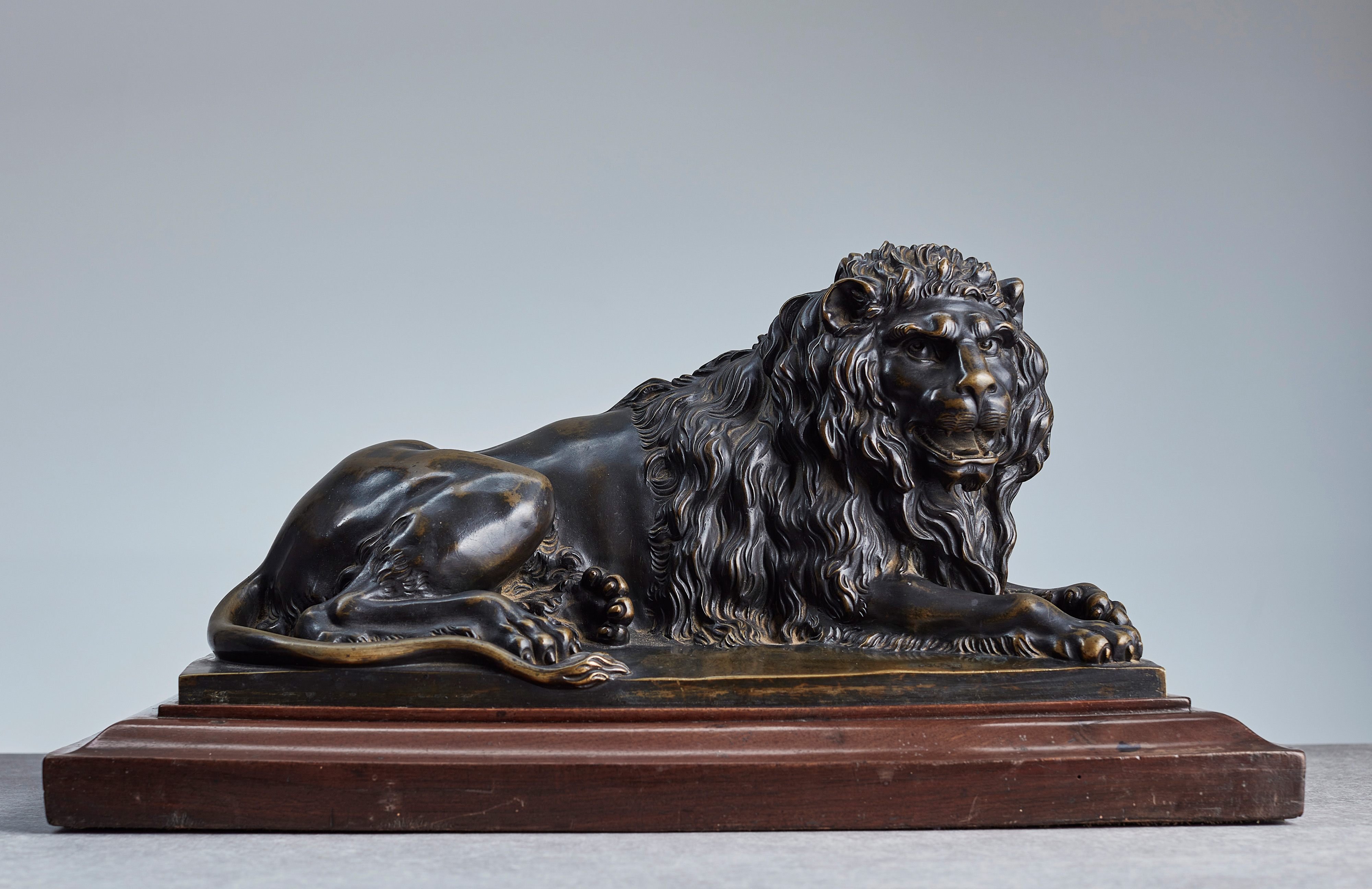 Fein ausgearbeitete Bronzeplastik eines liegenden Löwen mit erhobenem Kopf. Die Plastik ruht auf einem profilierten Holzsockel, der mit Mahagoni furniert ist.