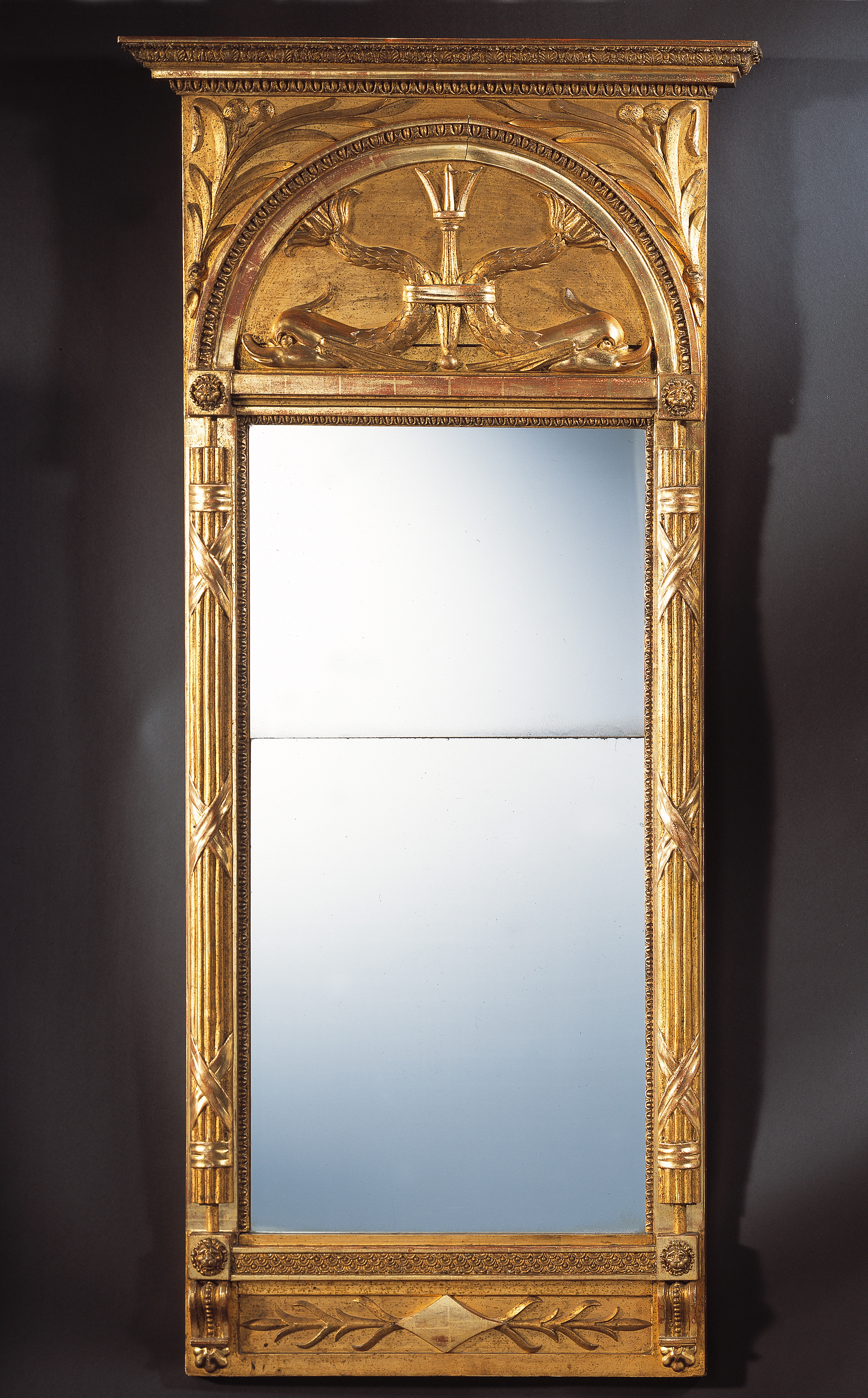 Plastisch geschnitzte Delphine, Rankenwerk, Liktorenbündel und applizierte Löwenmasken prägen das klassizistisch strenge Erscheinungsbild dieses dekorativen Pfeilerspiegels.