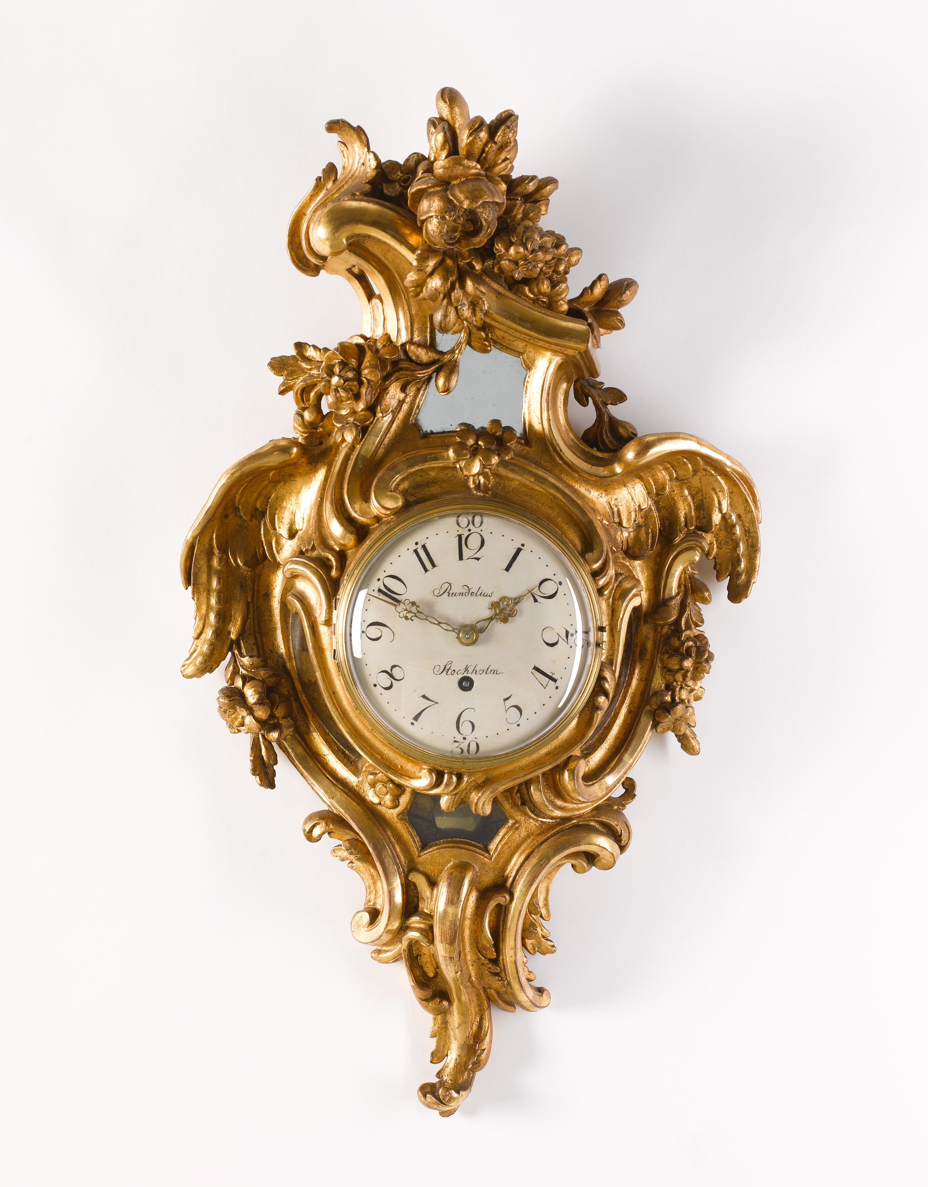 Messingwerk mit einer Gangdauer von acht Tagen. Das skulpturhaft geschnitzte Werksgehäuse in Matt- und Glanzvergoldung mit schöner historischer Patina.