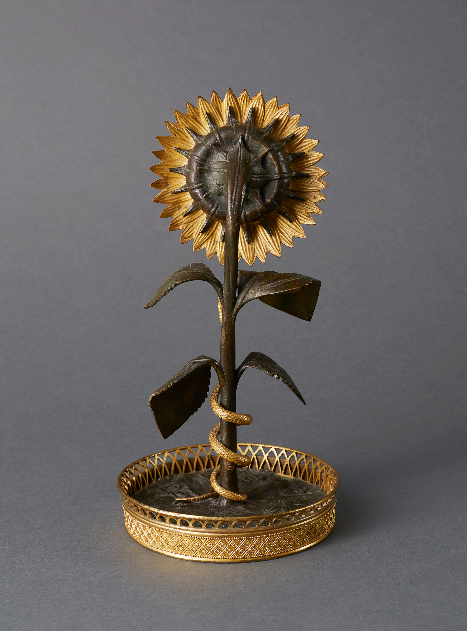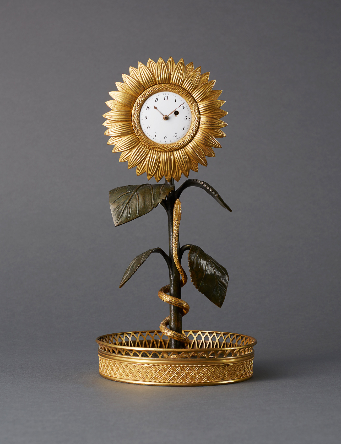 Die Uhr in Form einer naturalistisch modellierten Sonnenblume, im Zentrum der Blüte ein Taschenuhrwerk, das weiße Emailzifferblatt weist arabische Ziffern zur Markierung der Stunden und Punkte zur Kennzeichnung der Minuten auf. Um den grün patinierten Blumenstamm windet sich eine kleine Schlange. Der ausmodellierte Erdboden wird eingefasst von einem durchbrochen gearbeiteten und fein ziselierten Ring.