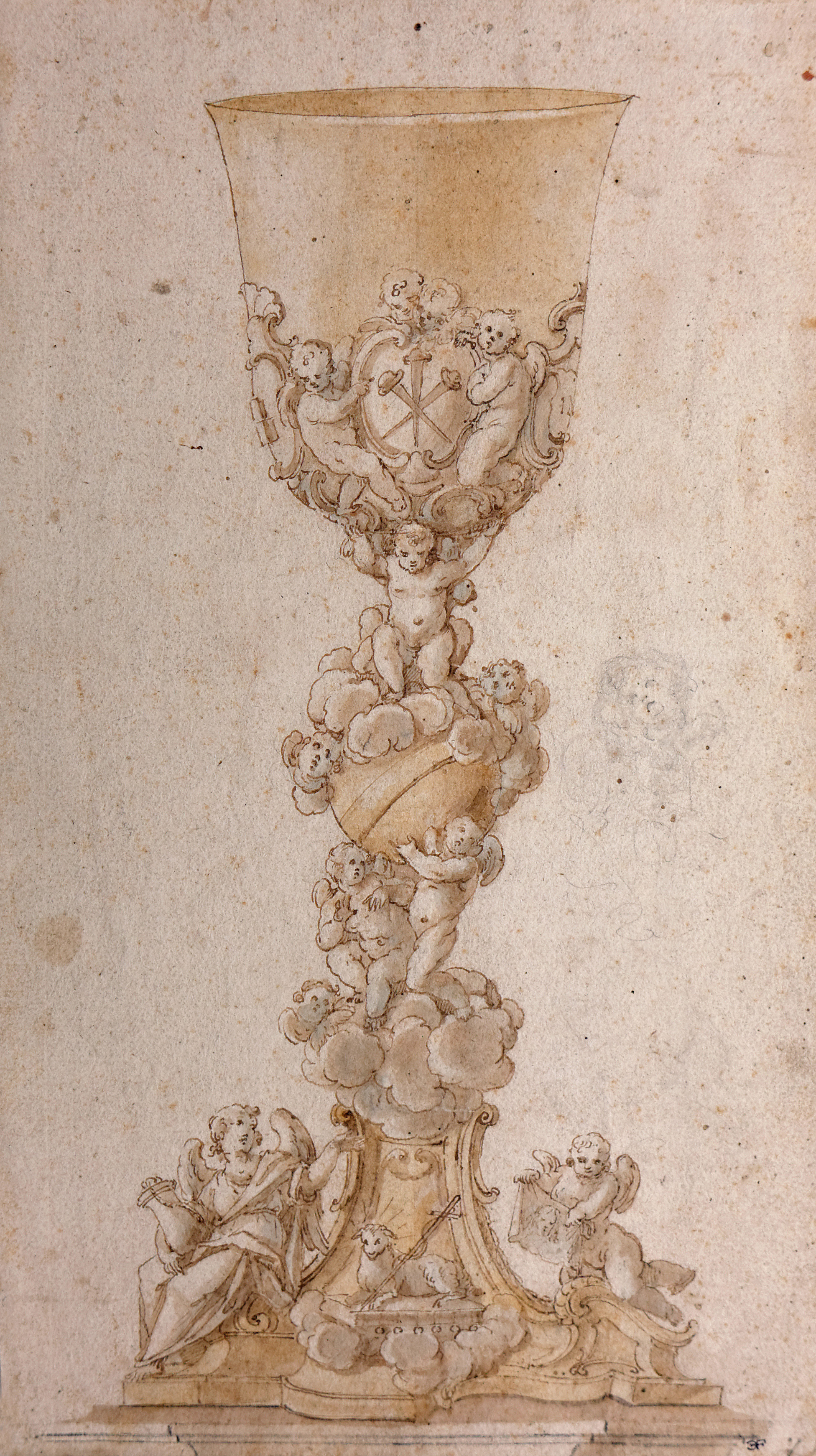 Der ungewöhnliche Aufbau des Kelches erhält seinen Reiz dadurch, daß statt des Schafts zwei bewegte Puttengruppen auf Wolken den Nodus in Form eines Himmelsglobus und darüber die Kuppa tragen. Am rechten Bildrand ist eine der geflügelten Engelsköpfe noch einmal in Graphit ausgeführt. Die Ikonographie des Kelchs hat die Erlösung der Welt durch die Passion (Geiselsäule und Vera Icon) und den Opfertod Christi (Kreuznägel auf der Kuppa) zum Thema. Die Zweifarbigkeit des Ausführungsentwurfs gibt die Verwendung von Gold und Silber vor. Die alternative ornamentale Dekoration zeigt auf der linken Seite noch barocke Elemente, während auf der rechten Seite bereits asymmetrische Rokokoelemente verwendet wurden, woraus sich eine Datierung um 1730/35 ergibt.