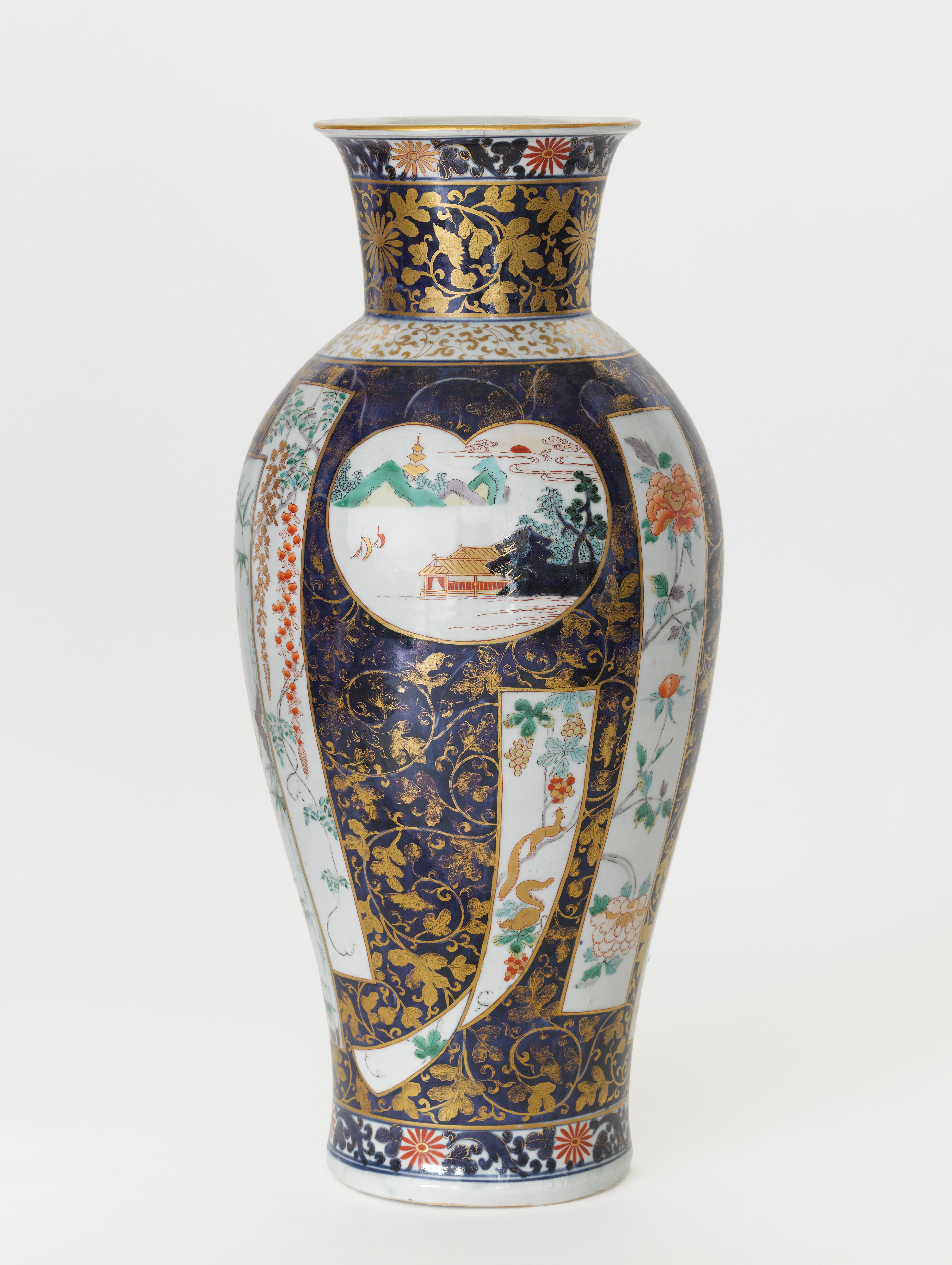 Vase, beaker-type, porcelain of elongated ovoid shape with flaring neck, painted in the Imari palette of underglaze blue with overglaze iron-red and green enamel with details in gold. The dense decoration includes reserves and ribbon motifs with landscapes and floral motifs including peonies, prunus and grape vines.