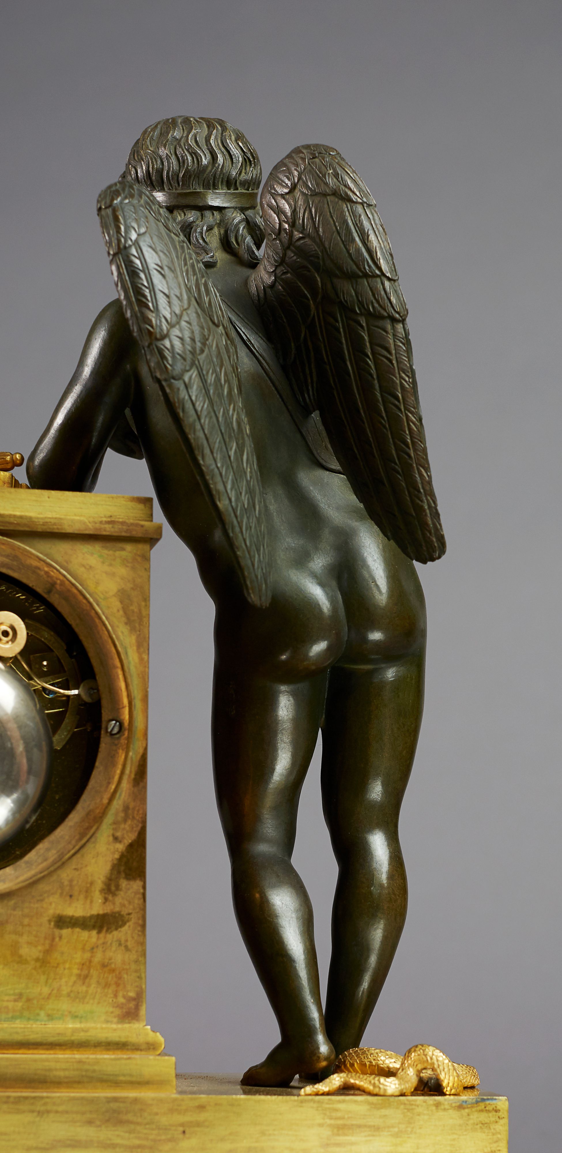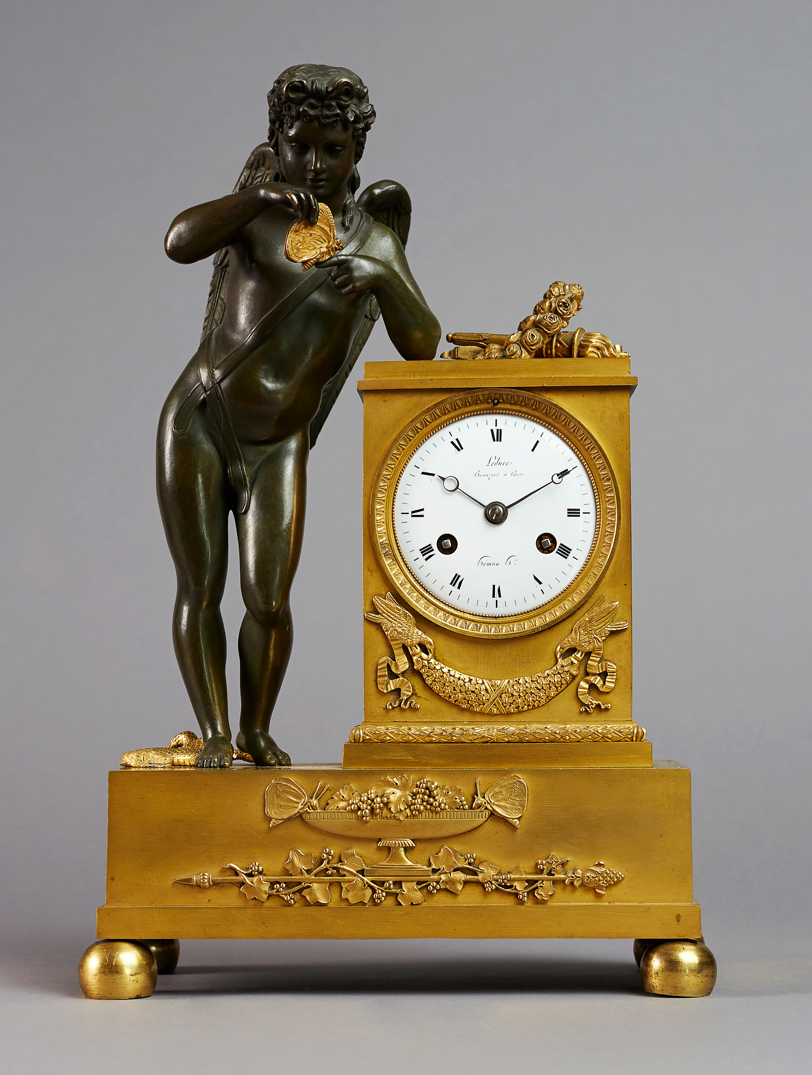 The clock is signed on the enamel dial by the famous Parisian bronzier ”Ledure Bronzier à Paris” and the clockmaker ”Hedon Hr” (horloger). Patinated and fully sculpted bronze figure of the young Apollo (or Eros), depicted as a nude holding a giltbronze butterfly in his hand as an Apollonian allegory of victorious love or in relation to the clock suggesting the fragile victory of love over time and death. A very fine mantel clock in authentic condition.