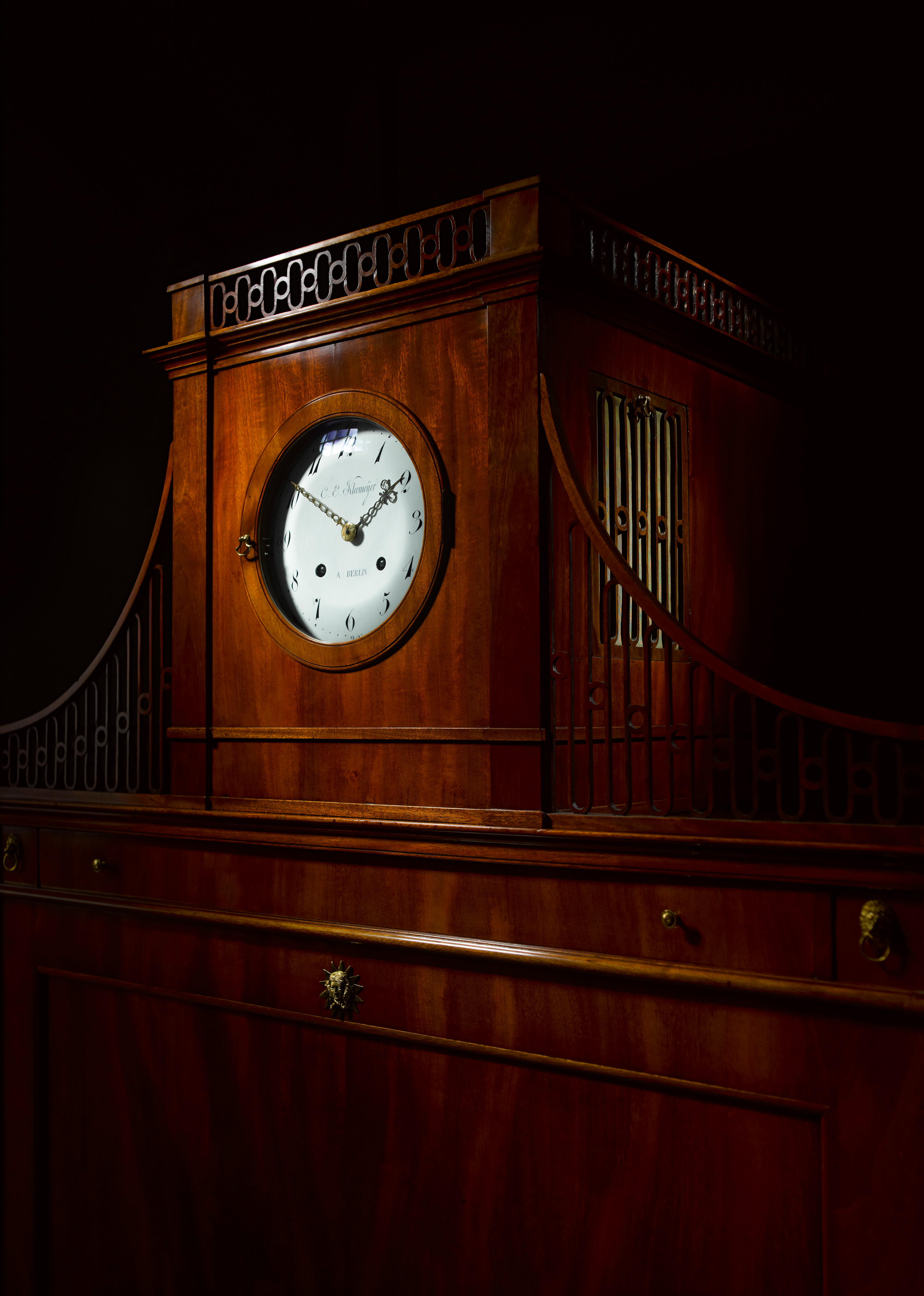 Although rather simple in appearance, this mechanical organ clock was produced by one of the most accomplished makers in Berlin. The weight-driven clockwork mechanism is allied to an organ with 92 pipes in three ranks. The music is pinned in spiral motion onto unusually large wooden cylinders (diameter 25,6 cm, 10 in., length: 74,3 cm, 29 ¼ in.). The mechanism is activated by pulling one of the small drawers at the inside of the the secrétaire.