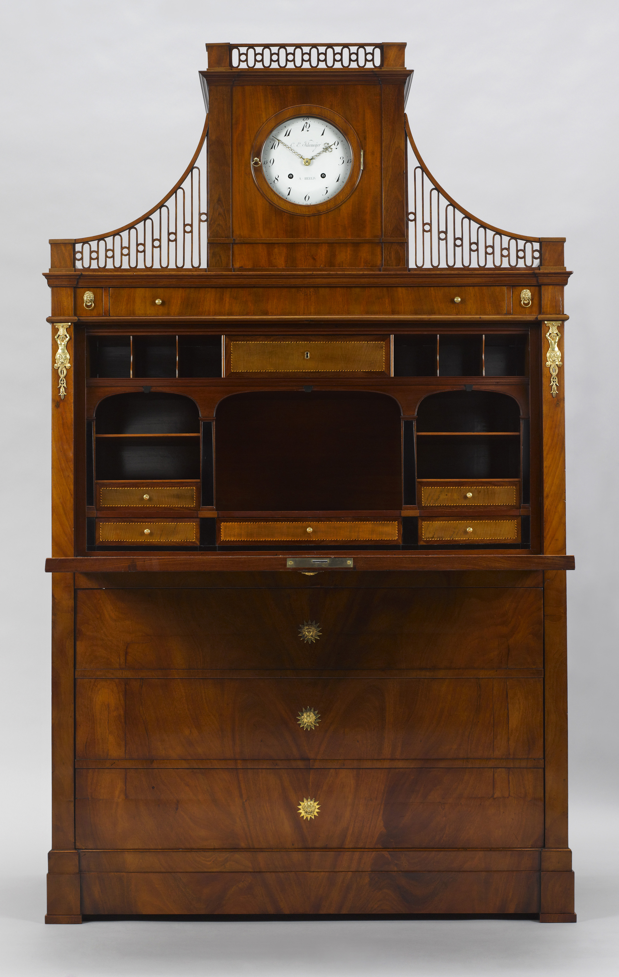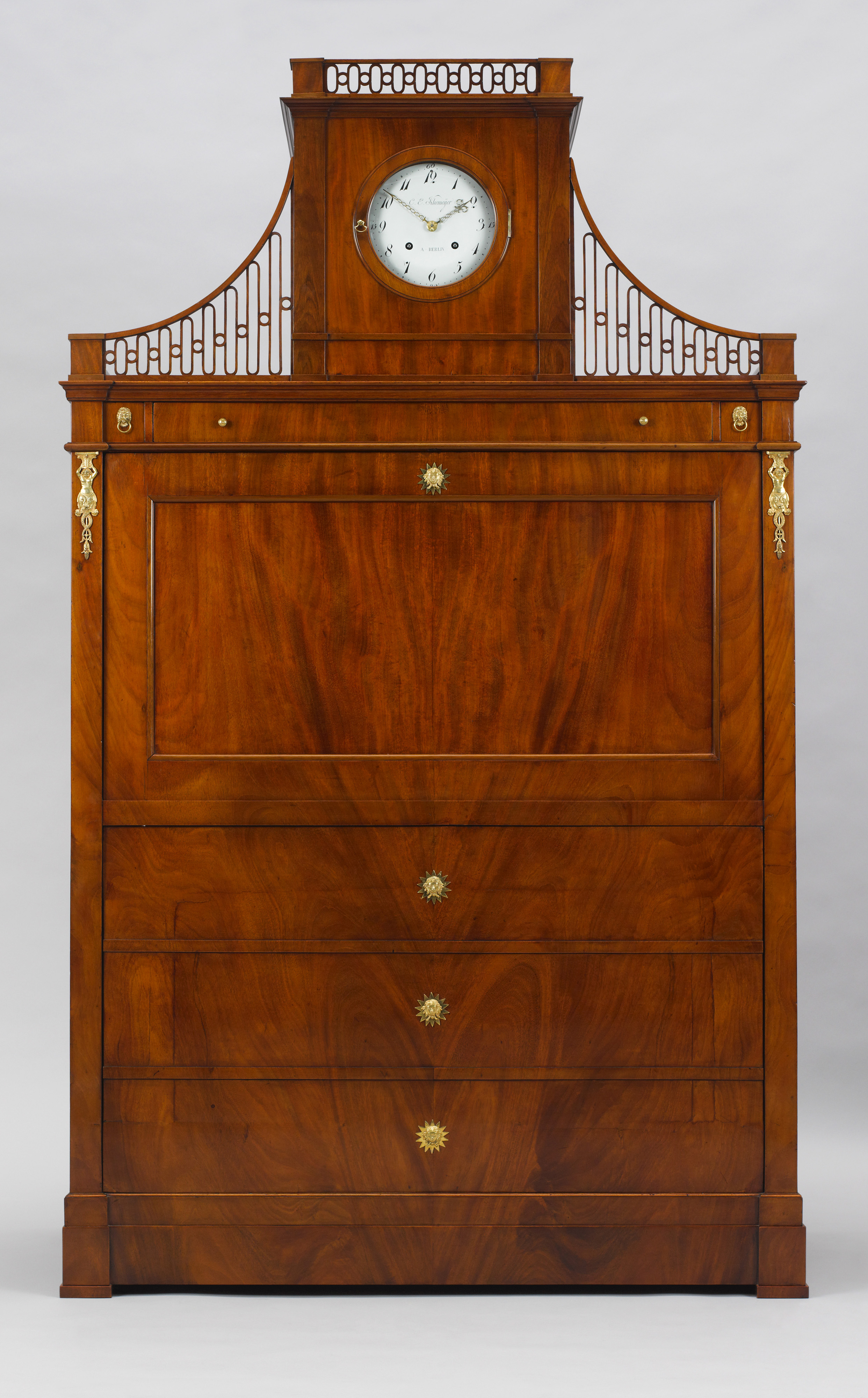 This secrétaire is designed in a rigidly architectonic style. The panel in the midsection lowers as a leather-lined writing surface, revealing a fitted interior with drawers and pigeonholes veneered in mahogany, ebonised details and different naturally colored woods. Concealed above the fall front is a reading stand. The upper part with an eight-day-going pendule clock movement, striking the half- and full hours. The enamel dial signed: C.E. Kleemeyer A Berlin. An elaborate, pierced balustrade. The gilt-bronze elements are of very high quality and are standing in the tradition of the renowned Berlin manufacture of Werner & Mieth.