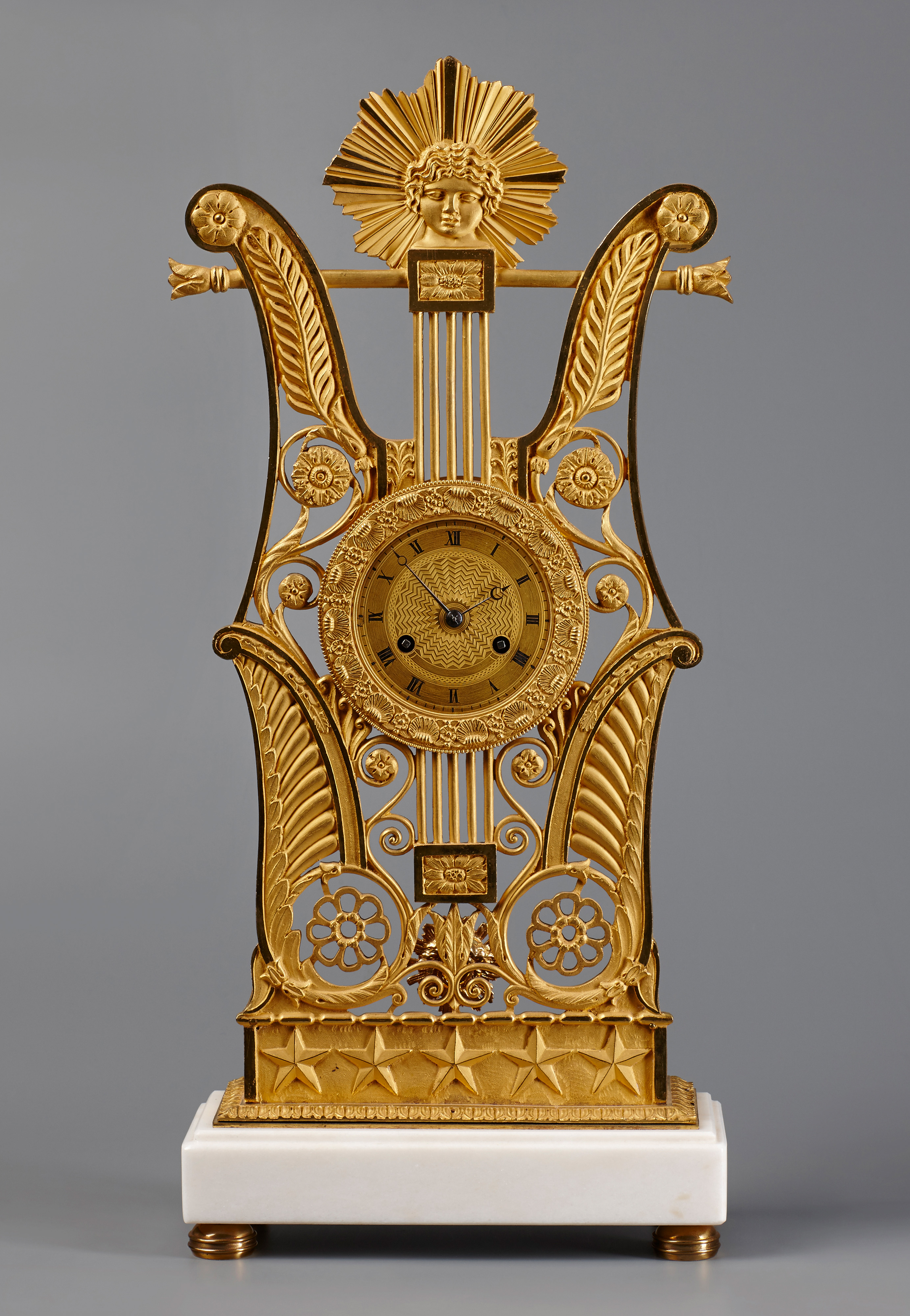 An unusal French Restauration period ormolu mantel clock. The elaborately pierced gilt bronze case in the form of a lyre, with an Apollo mask cresting, on a white marble stepped base. Original very attractive matt- and polished gilding. The eight-day movement with silk-suspended pendulum, striking half- and full hours.