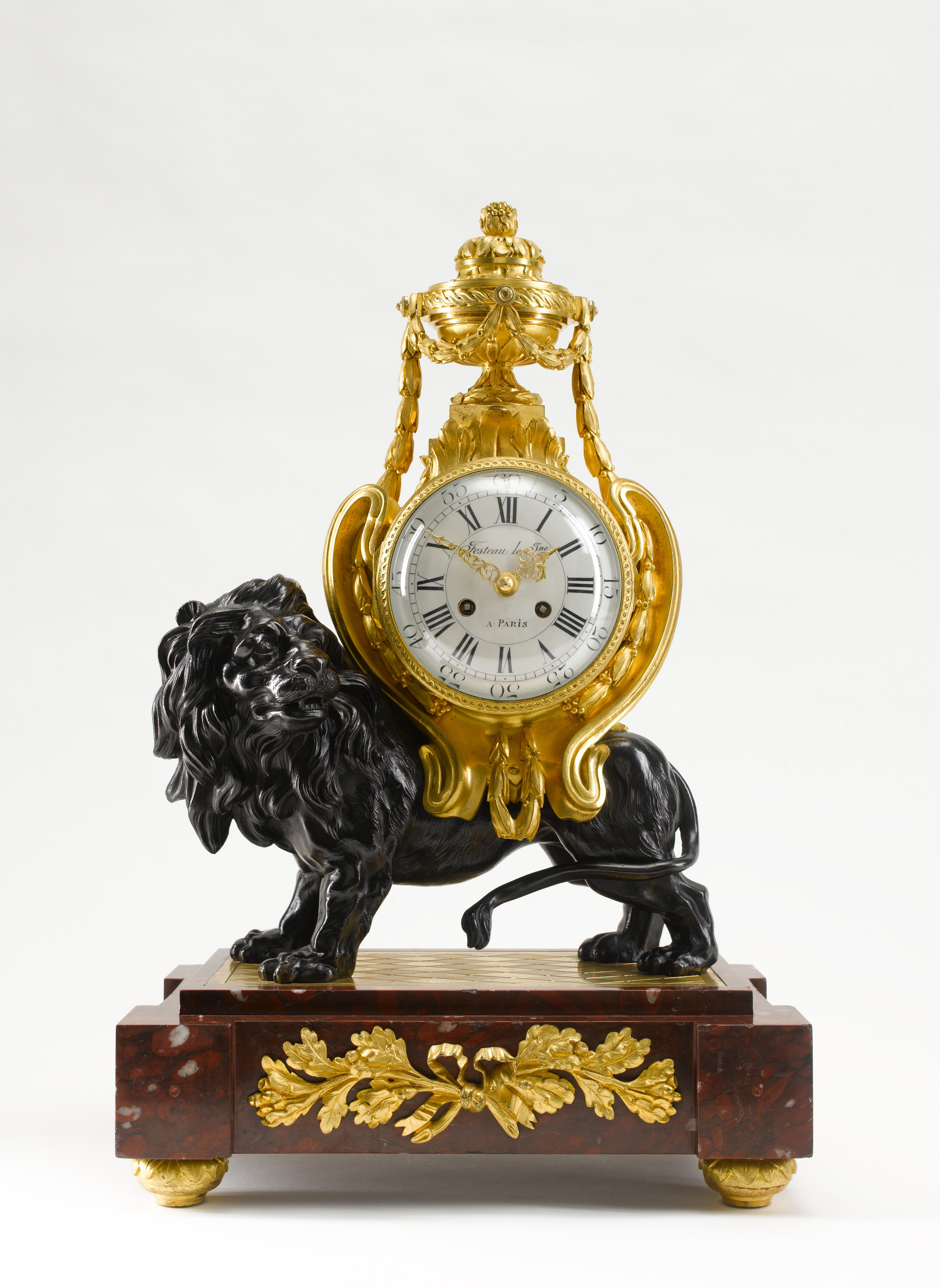 The case after a design of François Vion in form of a lion supporting a cylindrical case draped with ribbon tied laurel swags and surmounted by a covered urn hung with a laurel swag, all on a rectangular marble plinth centred by gilt bronze mounted ribbon-tied oak leaf spray, raised on bun feet, white enamel dial with black Arabic numerals for the minutes and Roman numerals for the hours, within a hinged glazed bezel, roman chapters, arabic minute numerals, pierced gilt hands, three-week going movement, striking the half- and full hours.