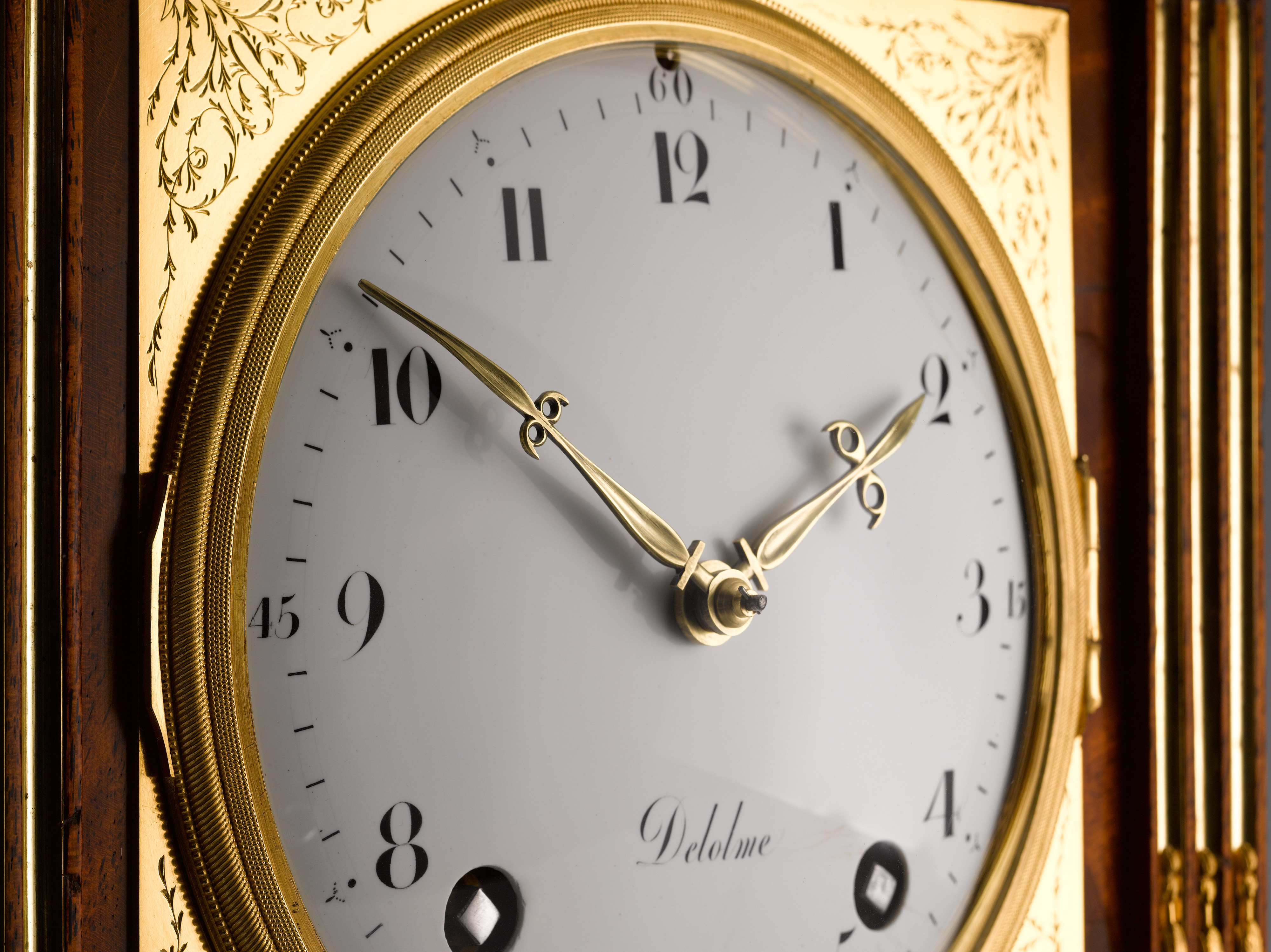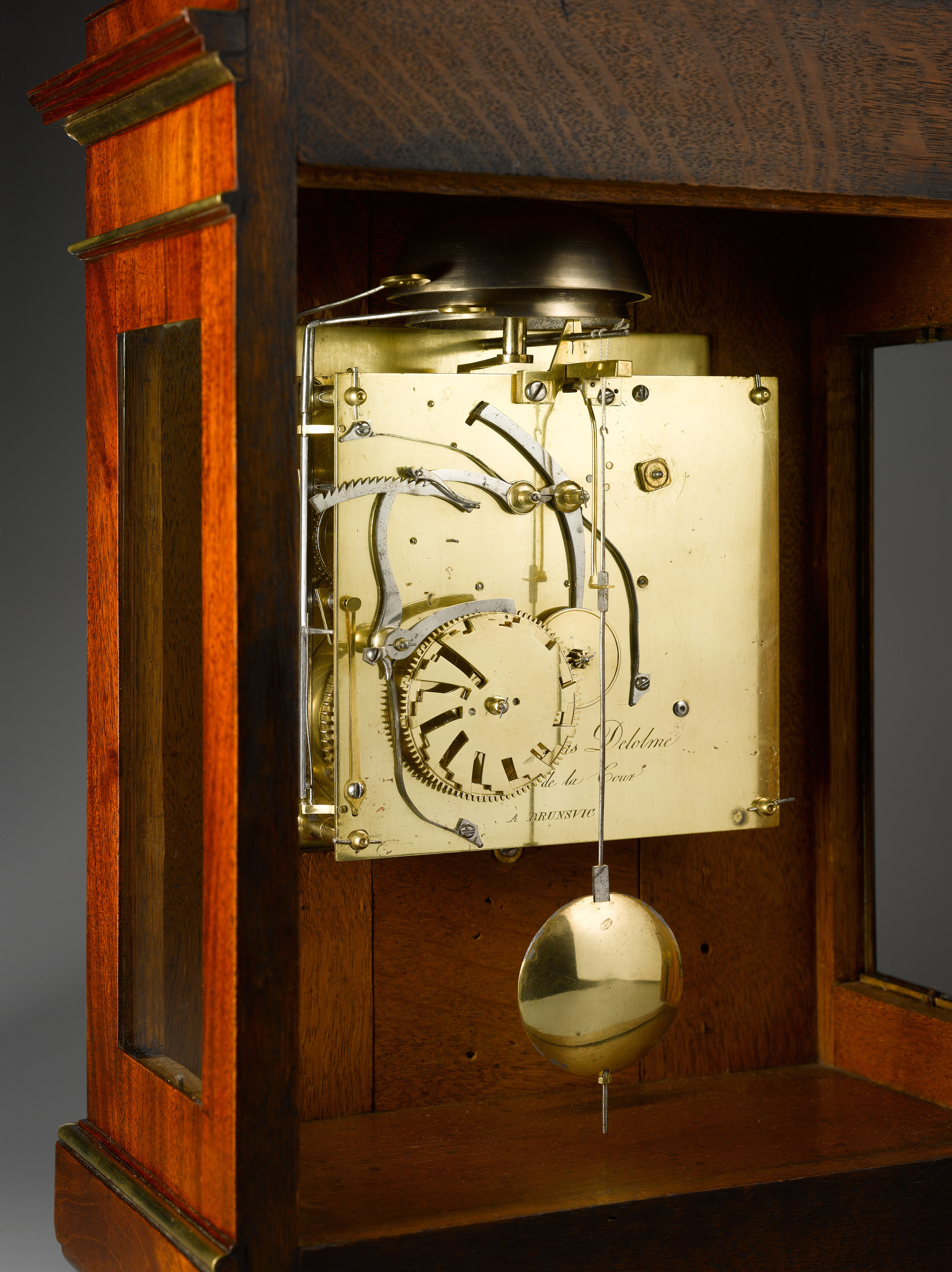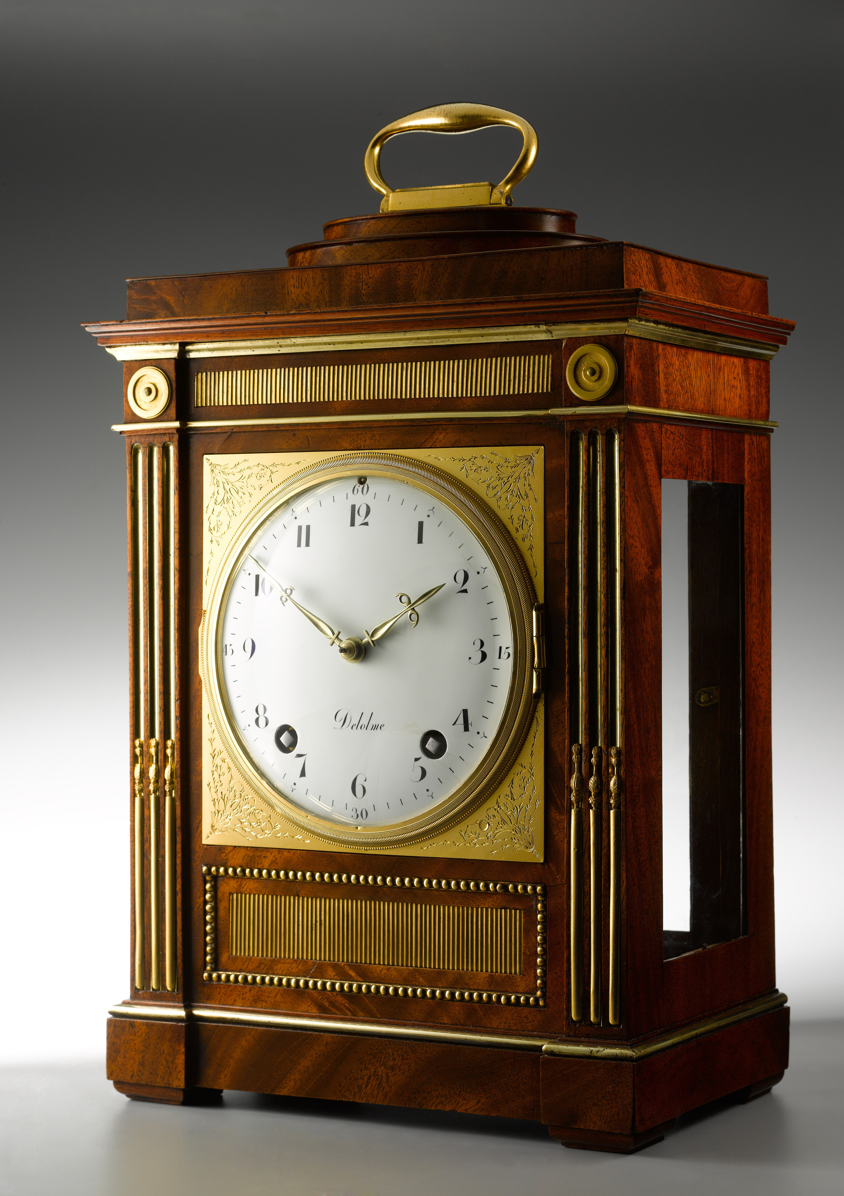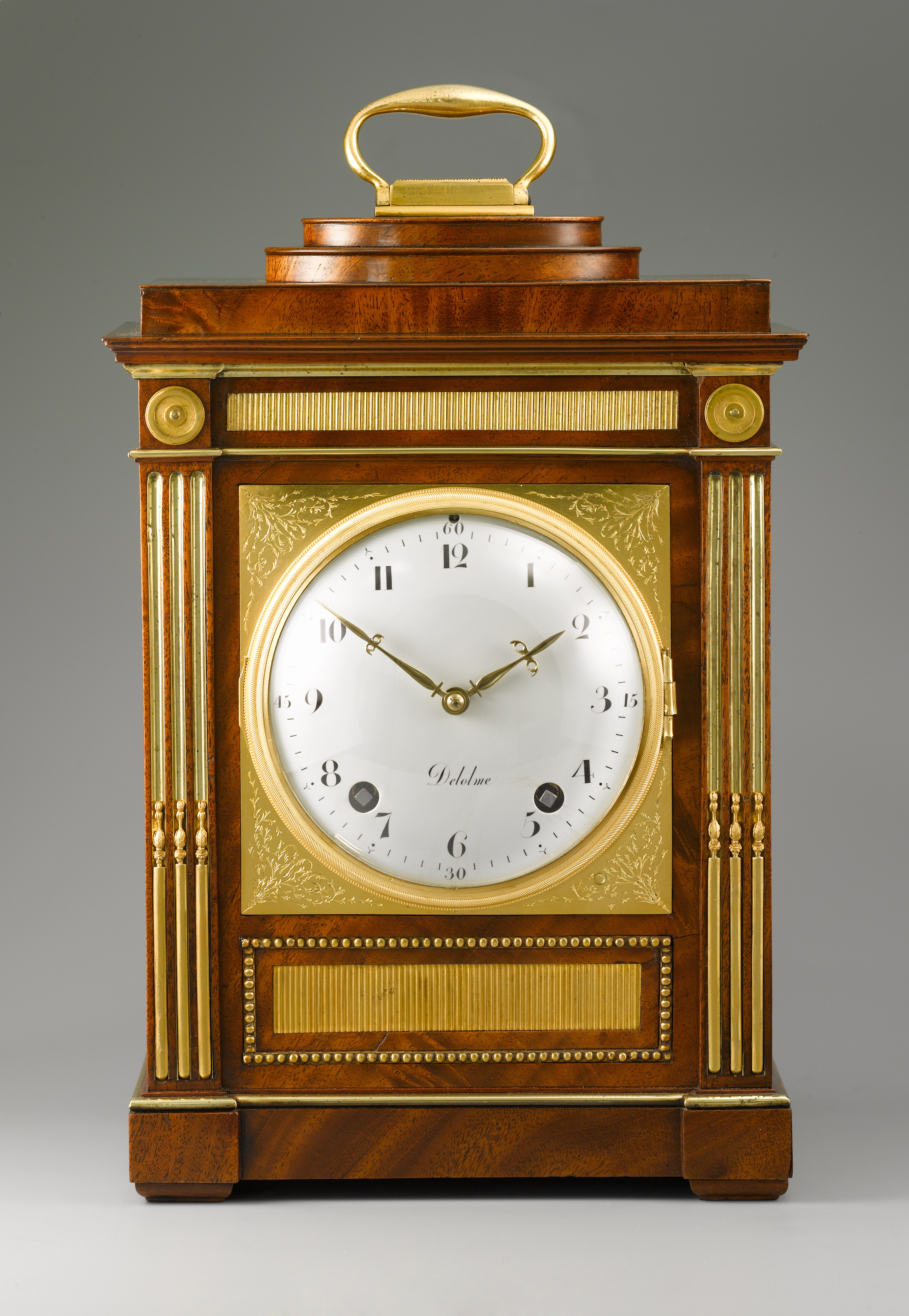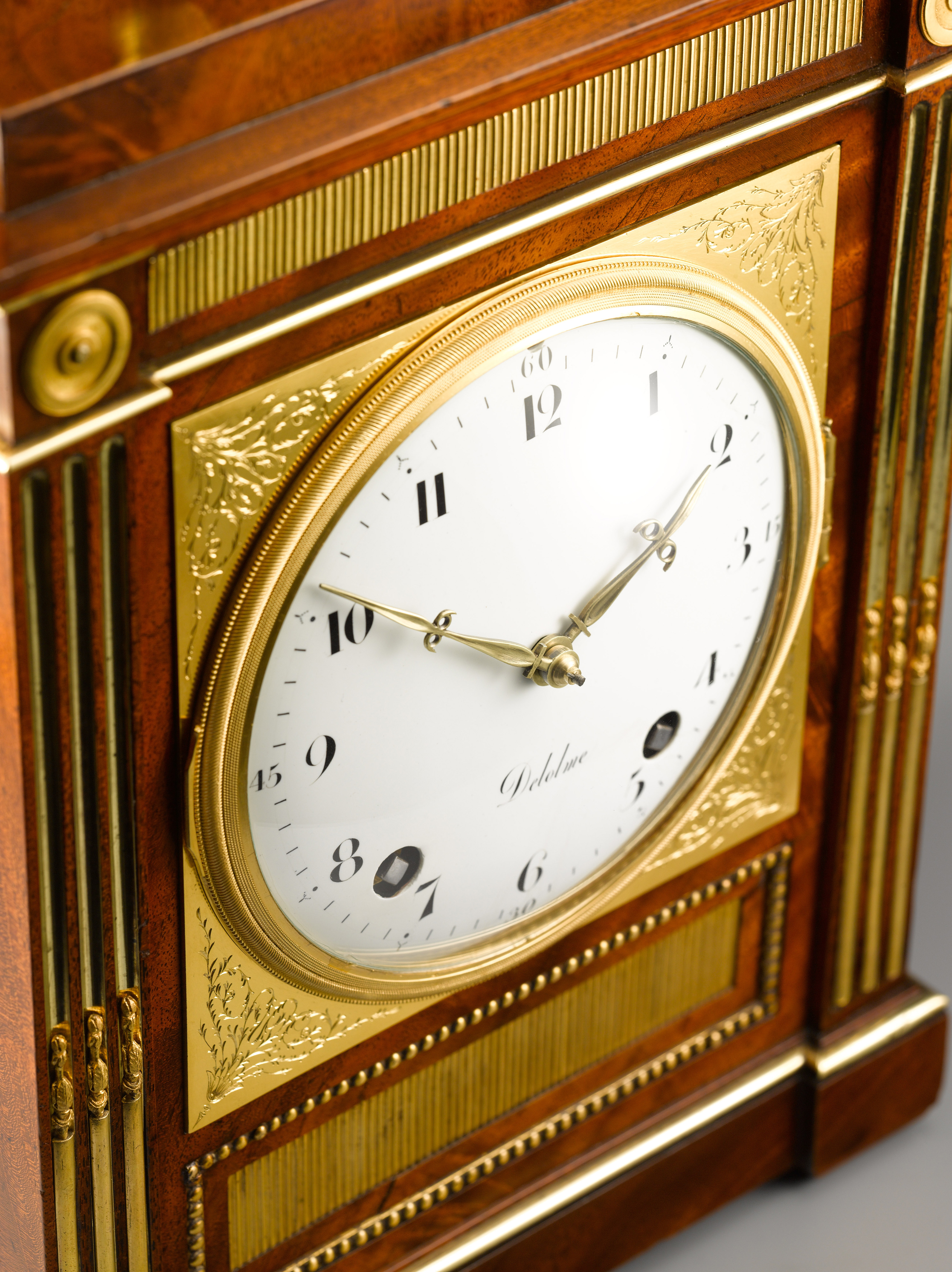 An important and rare table clock from the workshop of David Roentgen. The case with an oval stepped plinth top with gilt-bronze handle, decoration of the case with ormolu mille raie banding, beaded edges and brass fluted columns to the front flanking the square brass dial, foliate engraved spandrels to the corners, centred by the white enamel Arabic chapter ring, signed “Delolme”, Antoine Nicolas Delolme, 1752-1836, Brunswick; worked 1780-1810 and became court clockmaker in 1786, pierced brass hands, convex glazed bezel, square plated eight-day movement with four back-pinned pillars, verge escapement, silk suspension, rack and countwheel strike, striking the hours and quarters on two bells above, the backplate also signed: ”Ane Nicolas Delolme / Hger de la Cour /À BRUNSVIC”, glazed side panels.