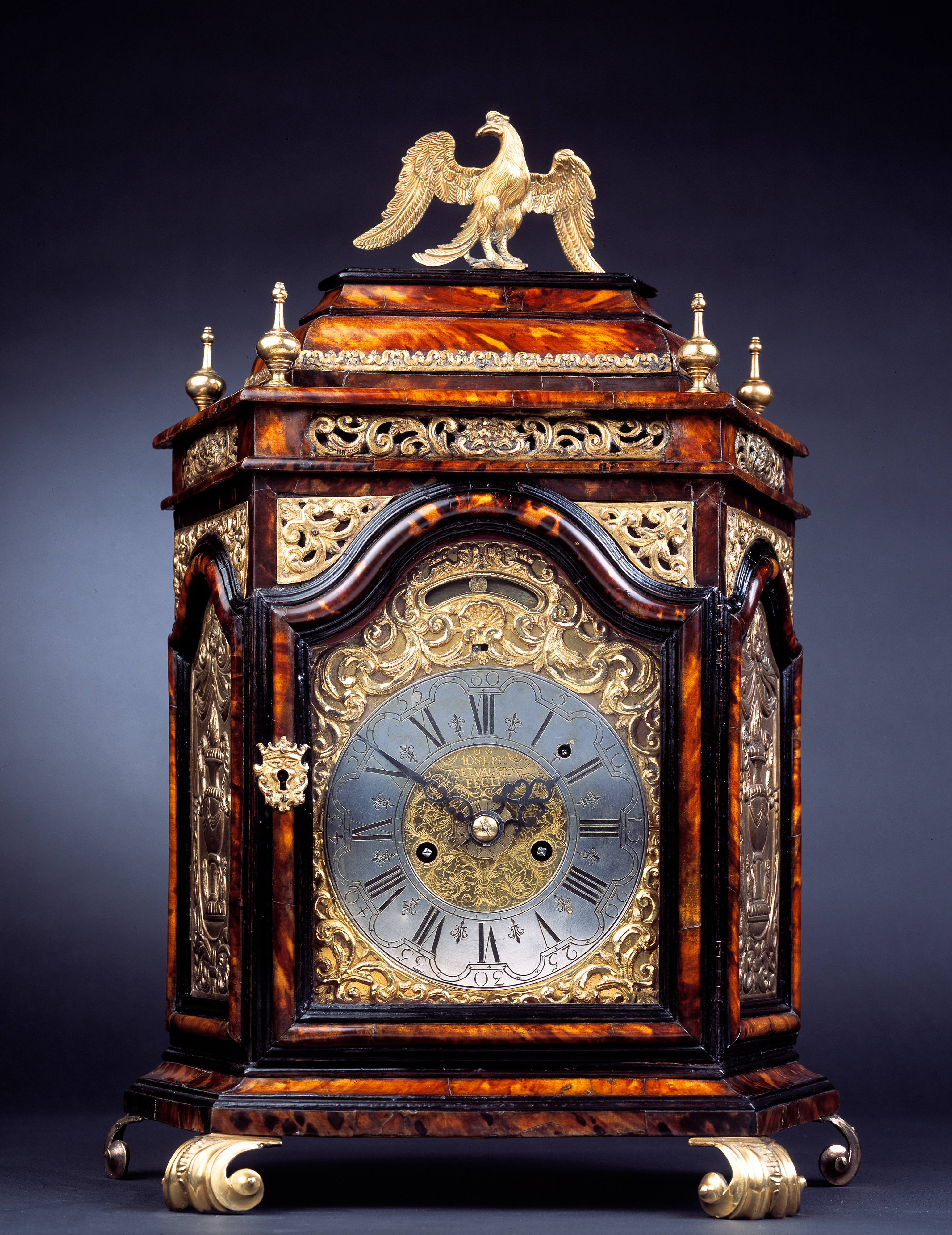 Very decorative tortoiseshell veneered clockcase, with a spread-winged eagle finial above a domed top with four further finials above an arched glass paneled case with foliate pierced gilt-bronze sound frets, with demi-lune mouldings framing glass panels.