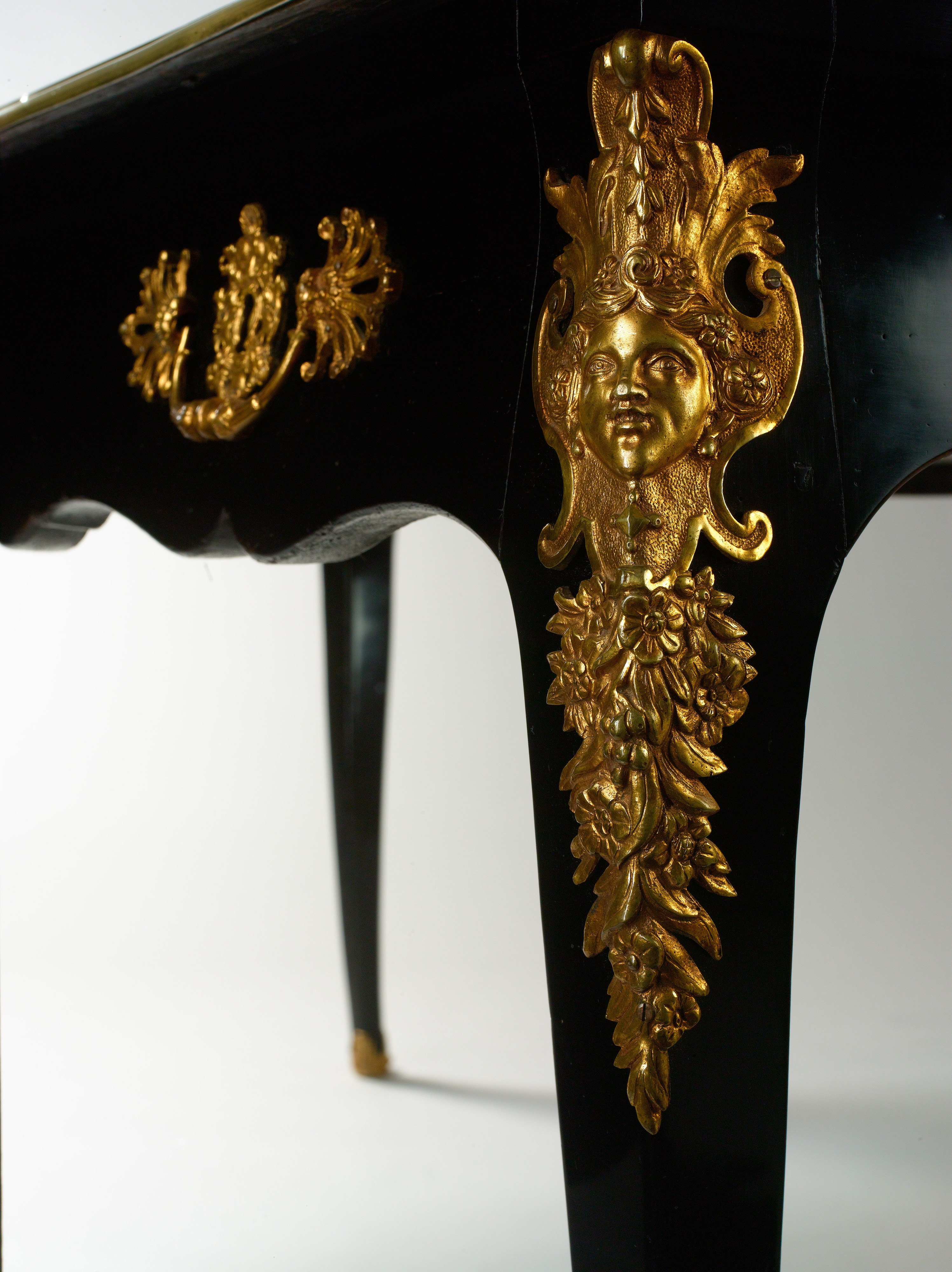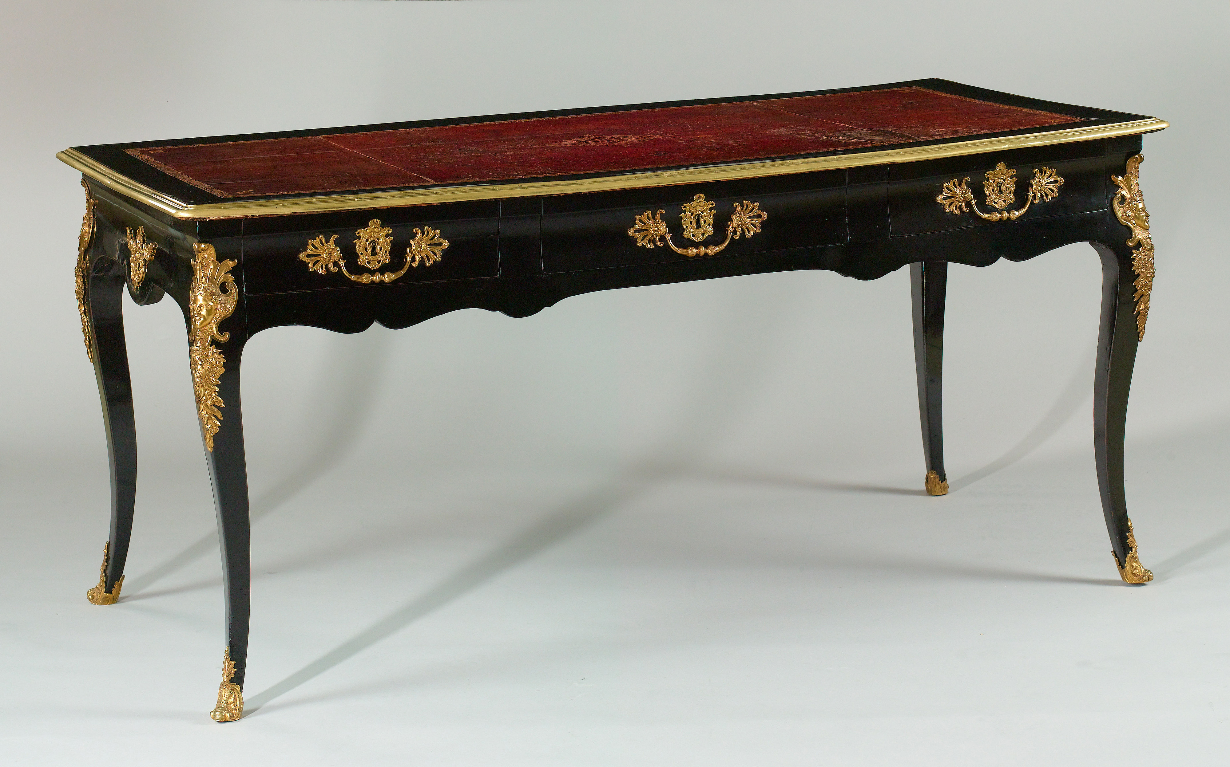 An imposing Louis XV ebonised writing table with finely chased gilt bronze mounts. The stepped moulded rectangular top inset with the original gilt-tooled leather above three frieze drawers with elaborate ormolu handles and escutcheons, the reverse conformingly organized with three simulated drawers, allowing this bureau plat ‘de milieu’ to be freestanding, the cabriole legs with sabot feet headed by female masks.