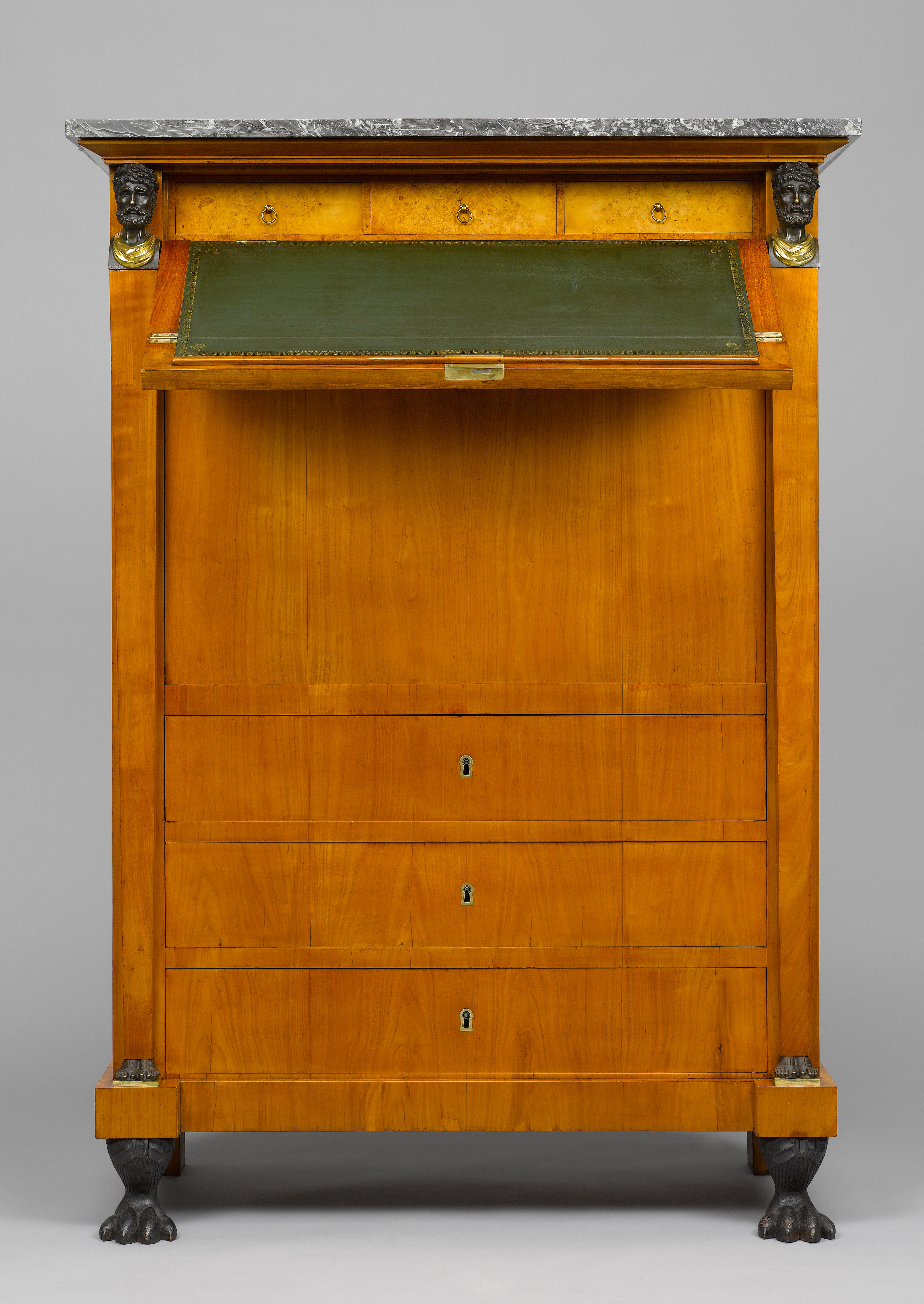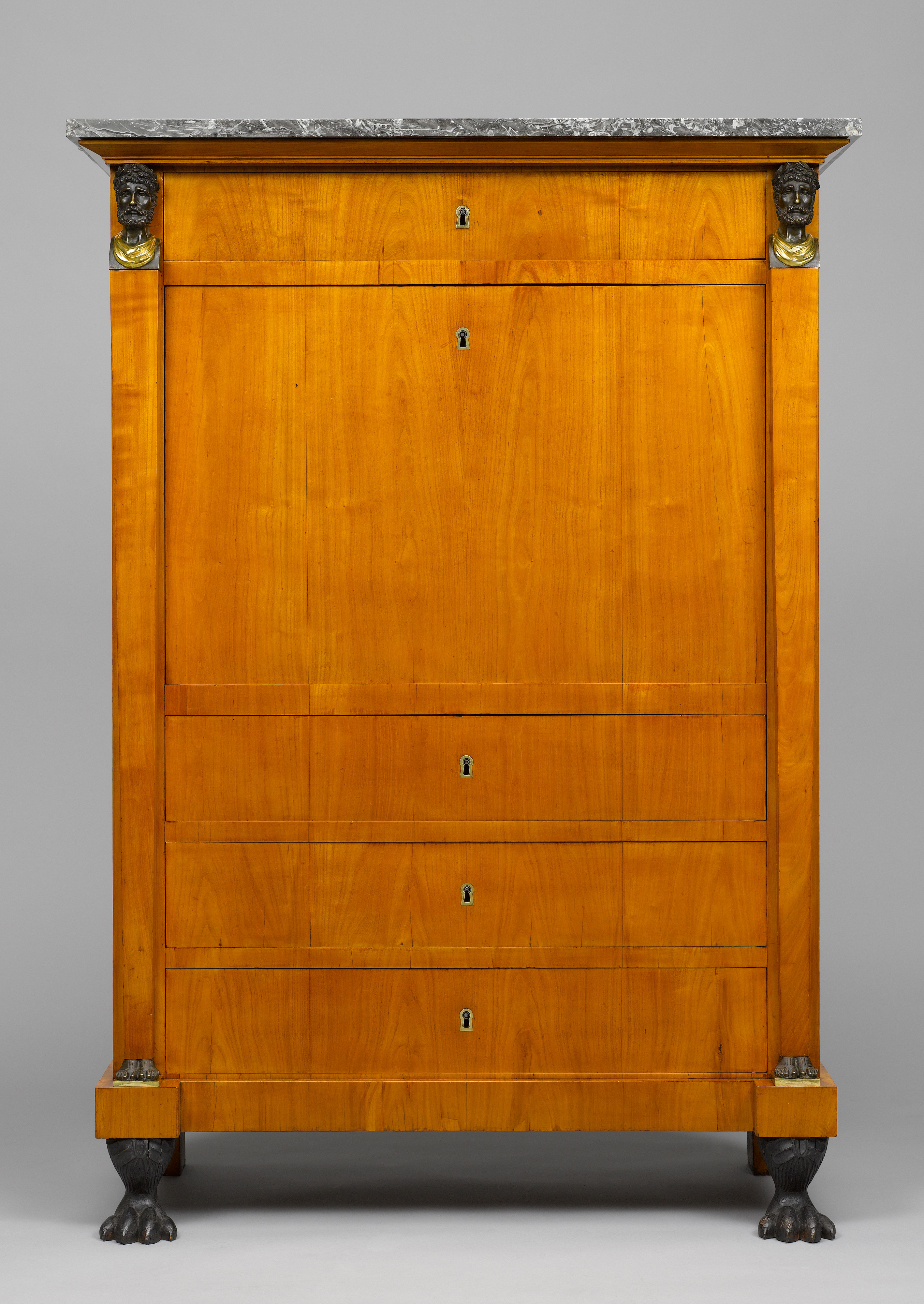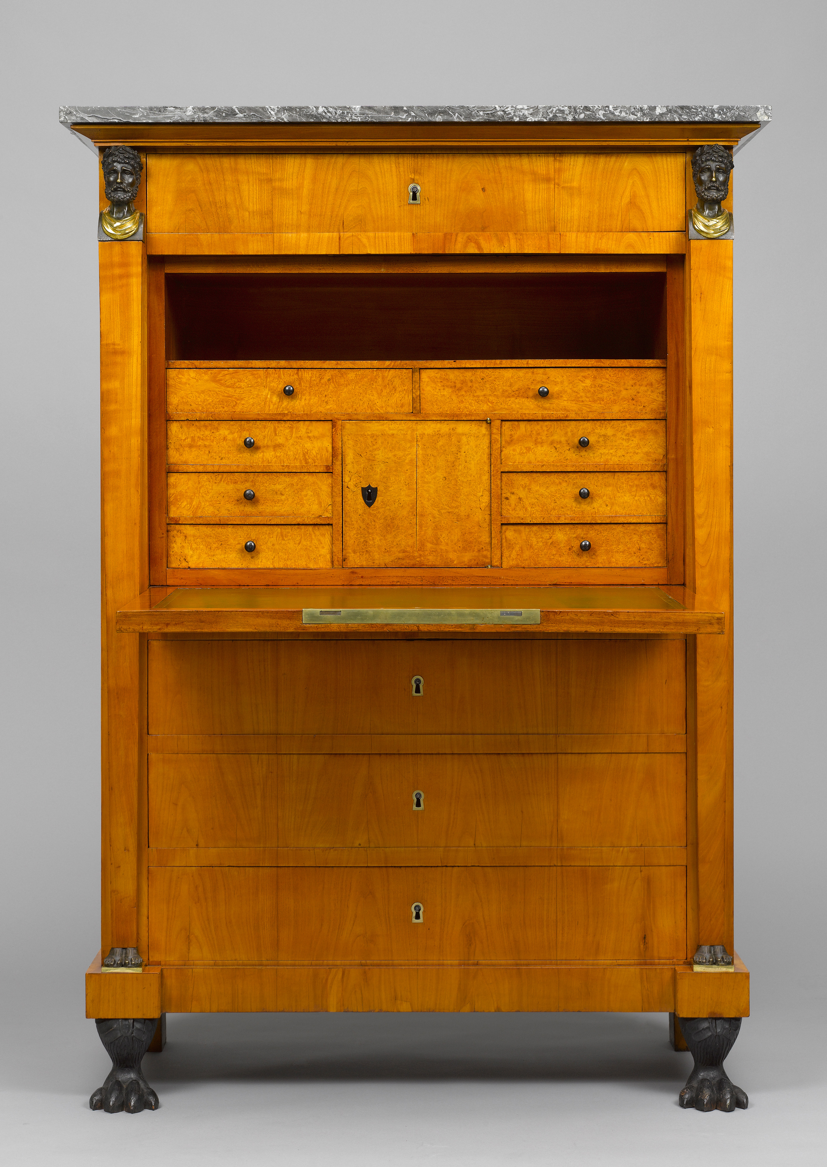 This fine Empire drop-front secretary (secrétaire à abattant or secrétaire en armoire) with a writing and standing desk is signed M. Hirschgartner. Hans Martin Hirschgartner (1766-1839) is a famous Swiss ebenist and became master in Zurich in 1790. He was known for the quality and great craftsmanship of his furniture.