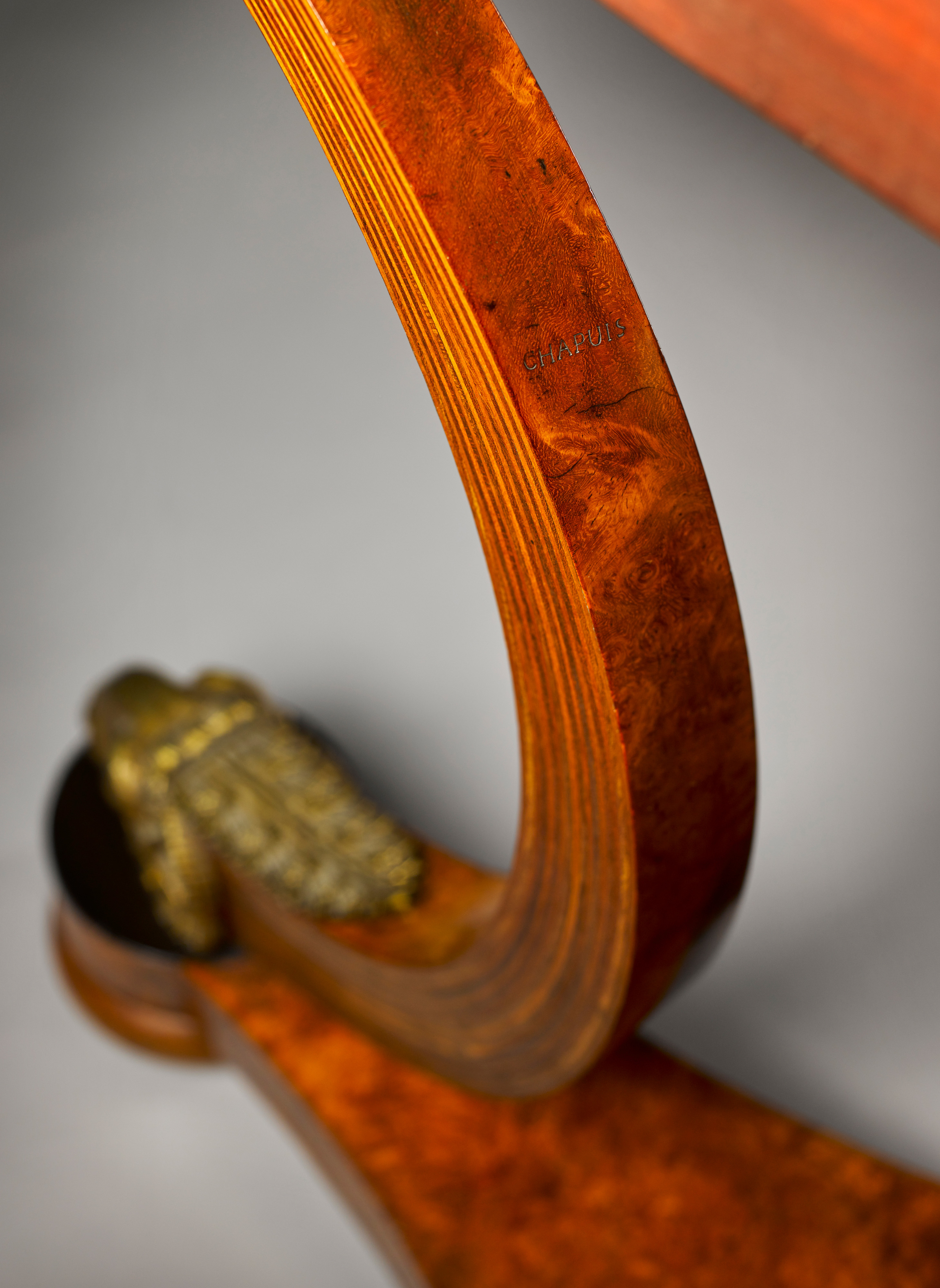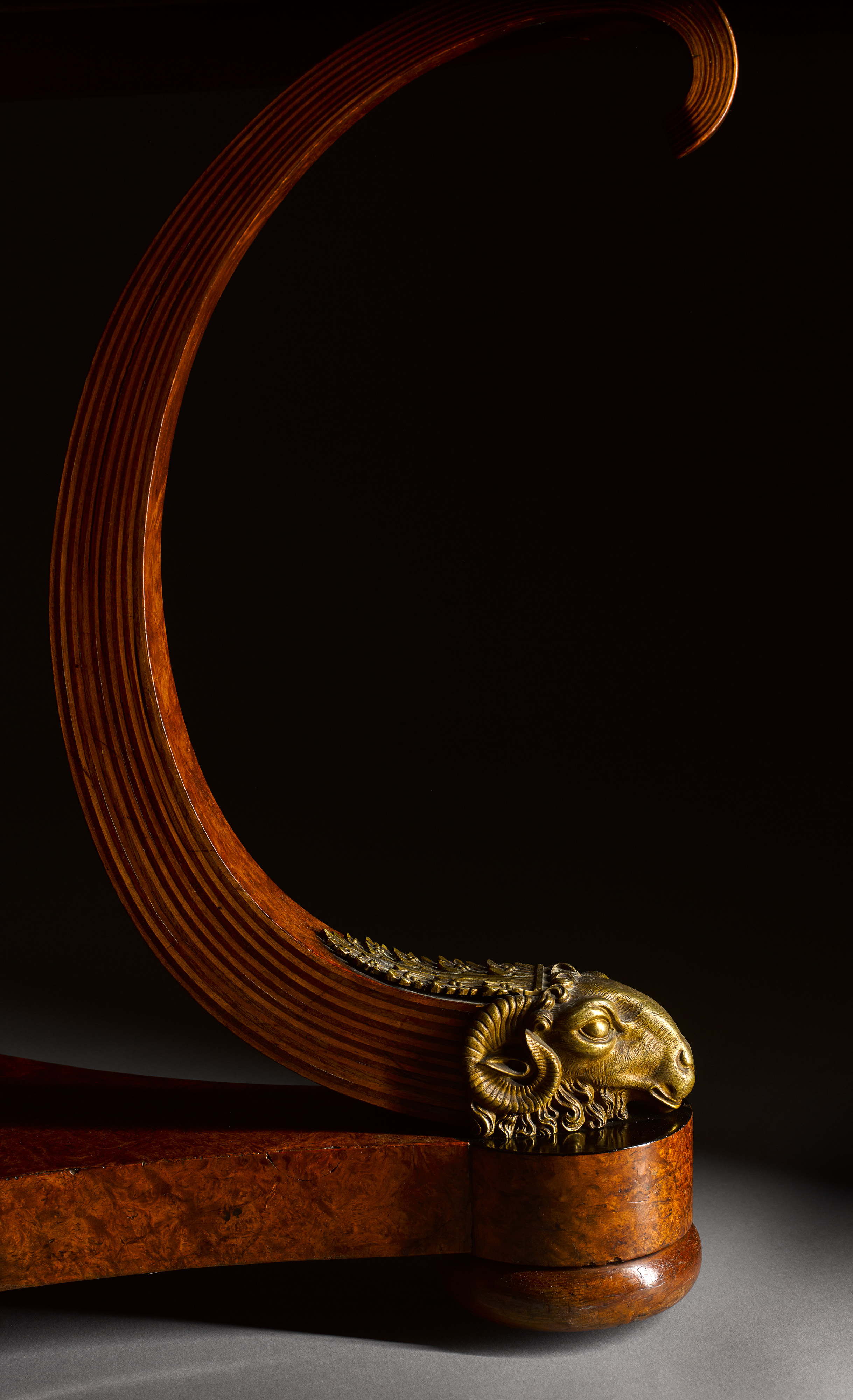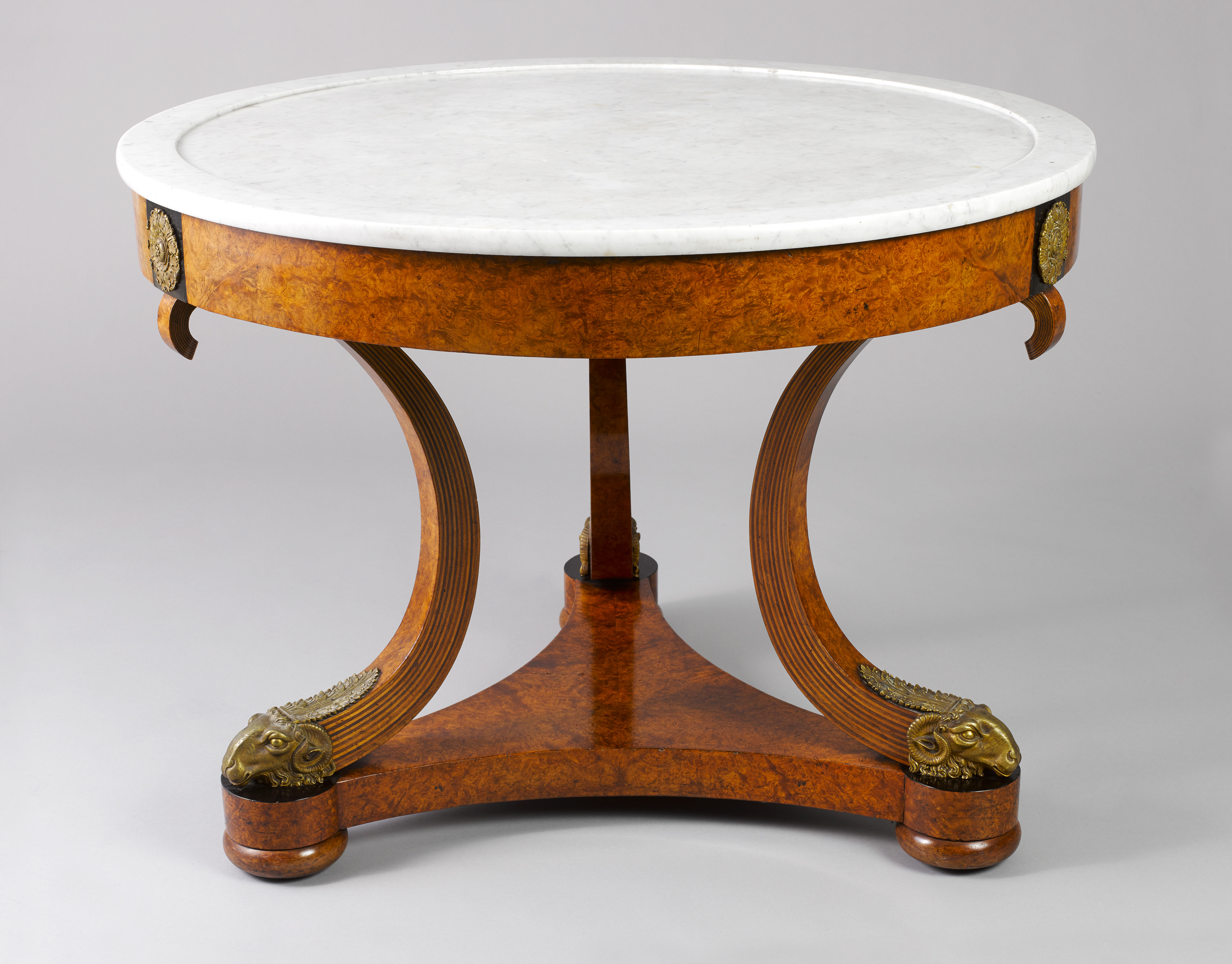 Amboyna veneer on oak, ebony, bent and laminated wood, gilt bronze, white marble top, brass castors. .