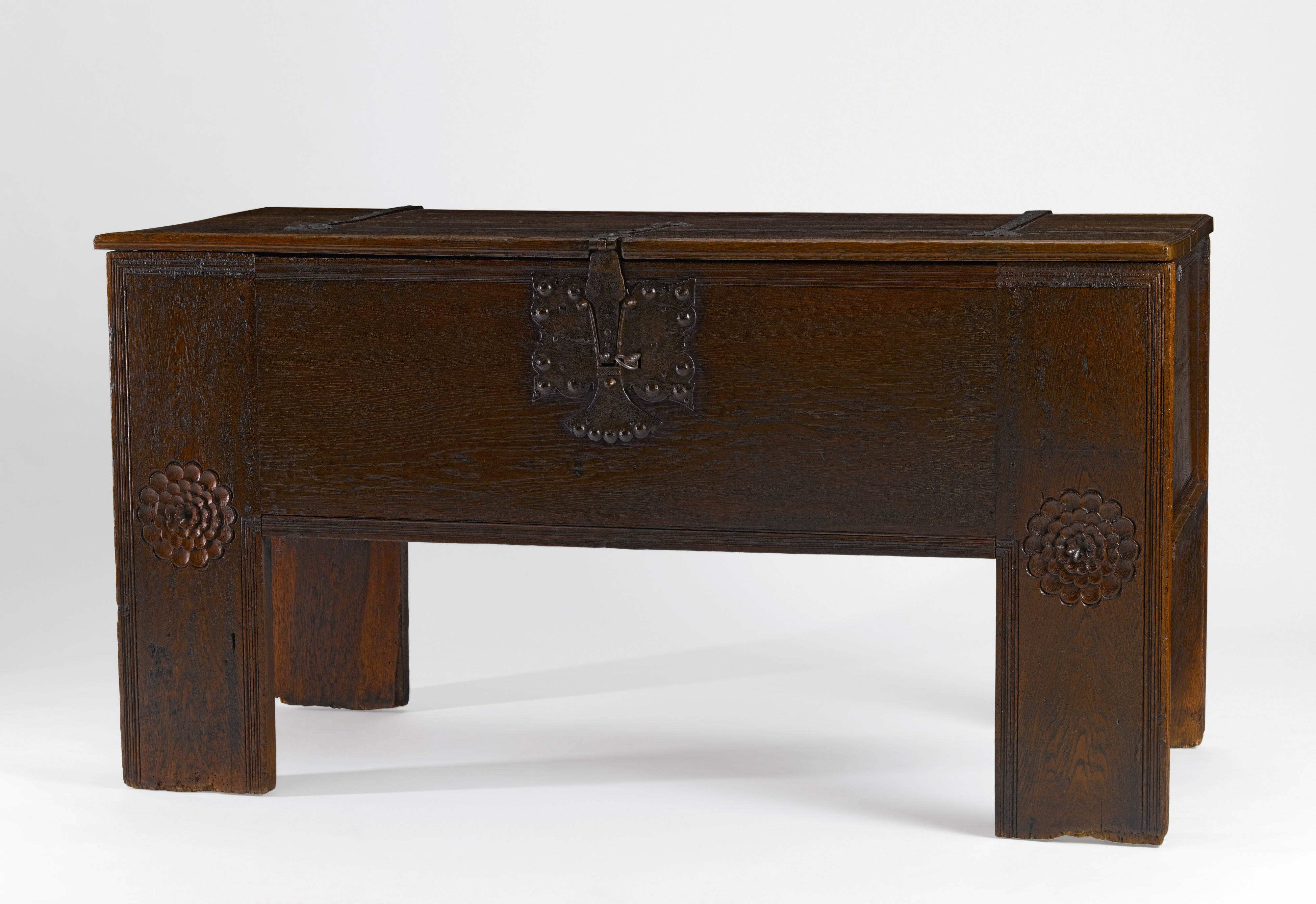The rectangular hinged top with three iron straps, enclosing a plain interior with one hinged small compartment, the front with two rosette carved ornaments, on unusually high rectangular plank feet.
