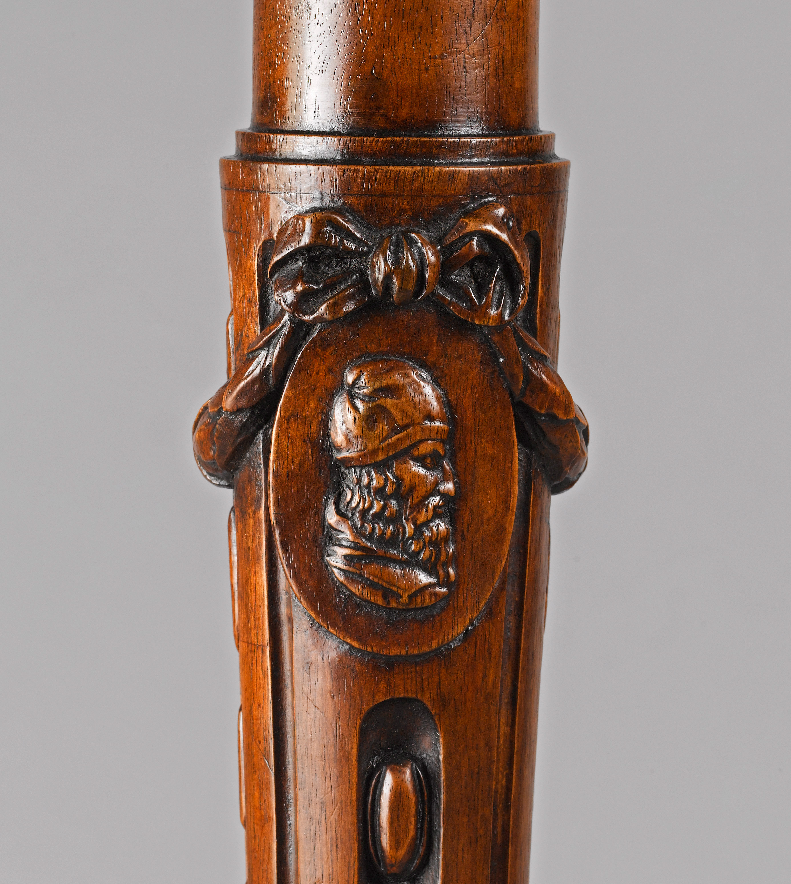 The lower part of the finely carved stand with three virtuoso scroll feet in late rococo taste, leading to a relative plain fluted stem with a ribbon holding a central portrait medallion, as a sign of the beginning neo-classical period.