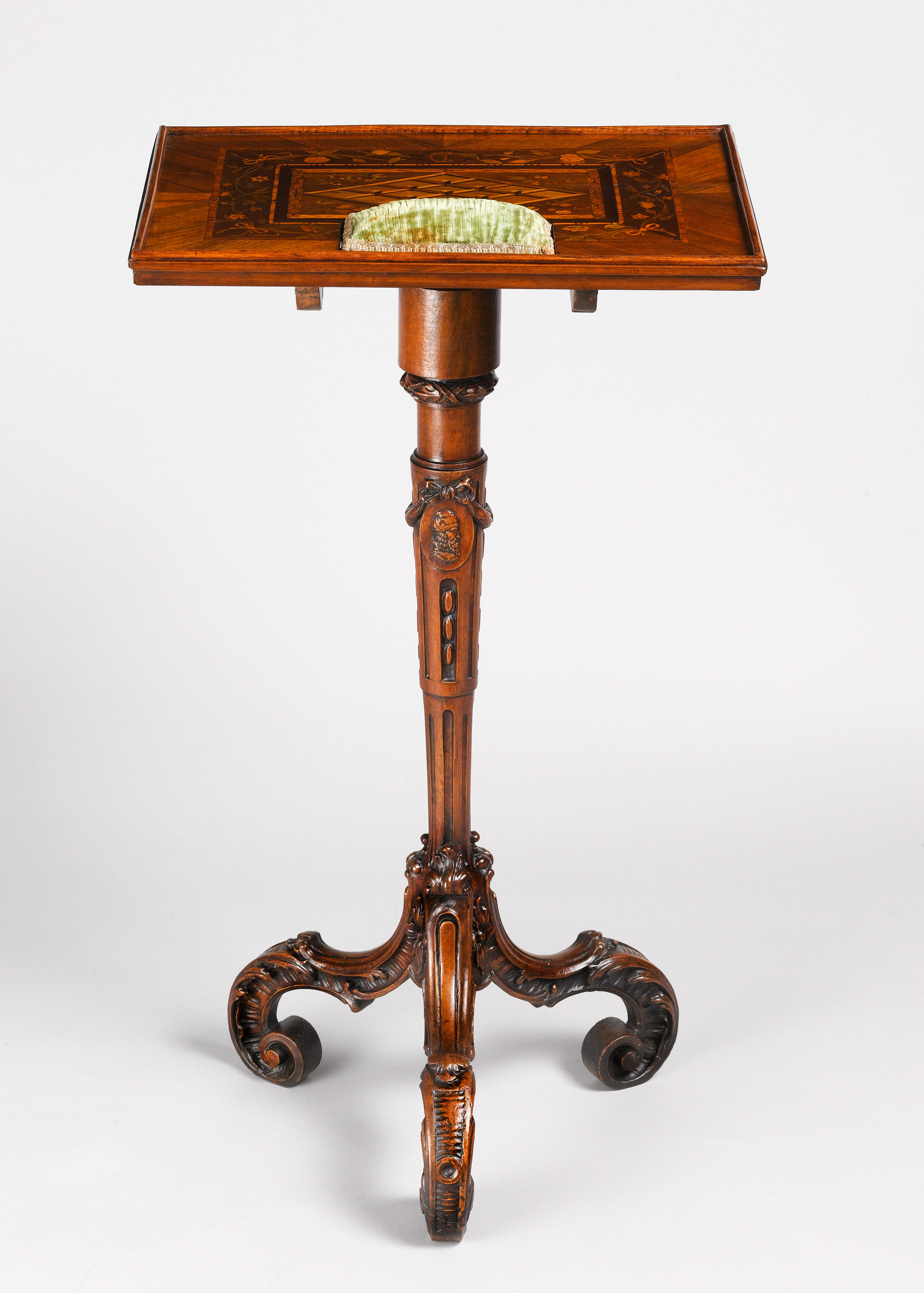 The stand of carved walnut, the pine top with marquetry of walnut, rosewood, green-stained poplar, and other marquetry woods. Velvet pin-cushion with horsehair. Iron fittings.